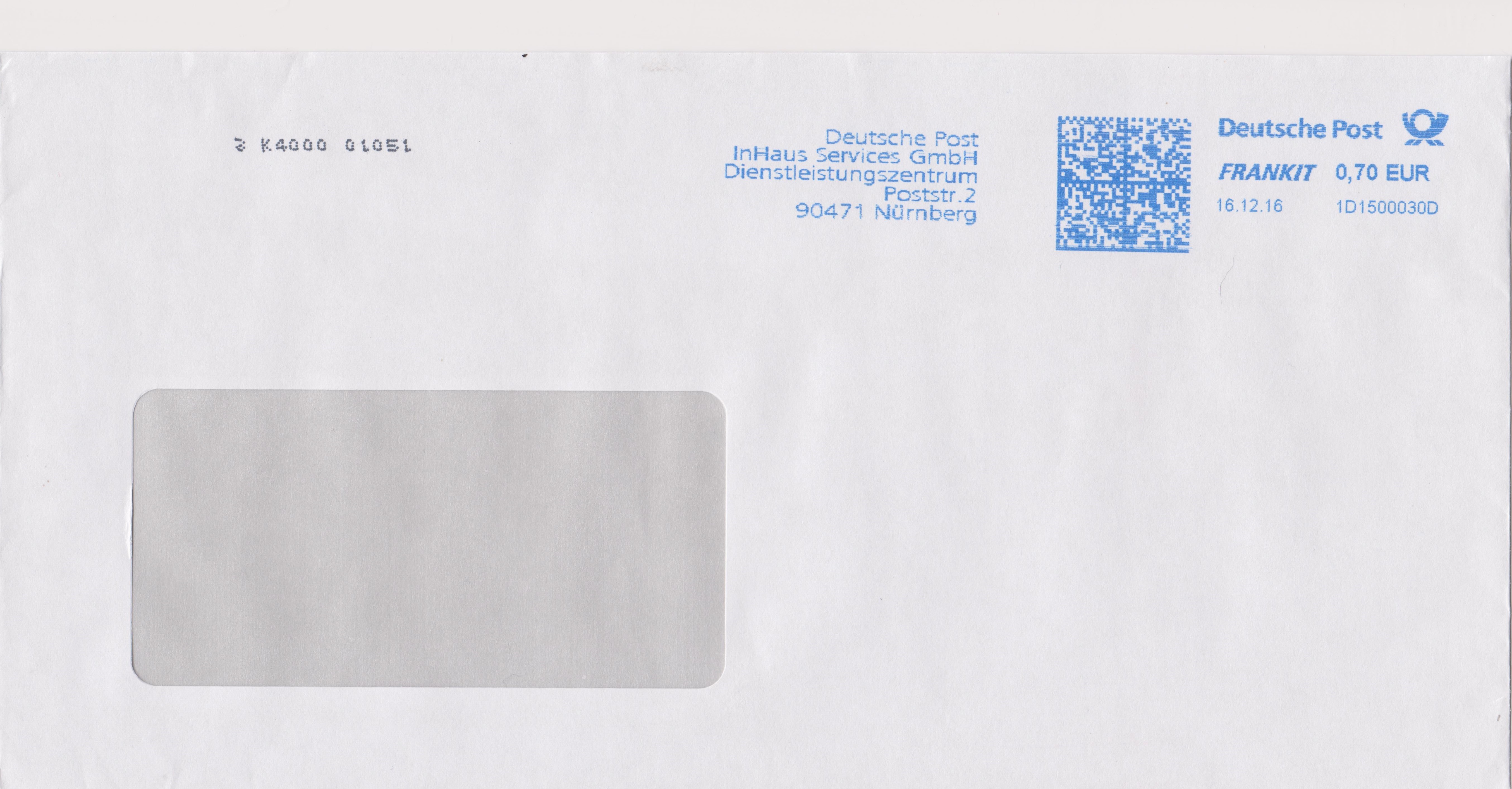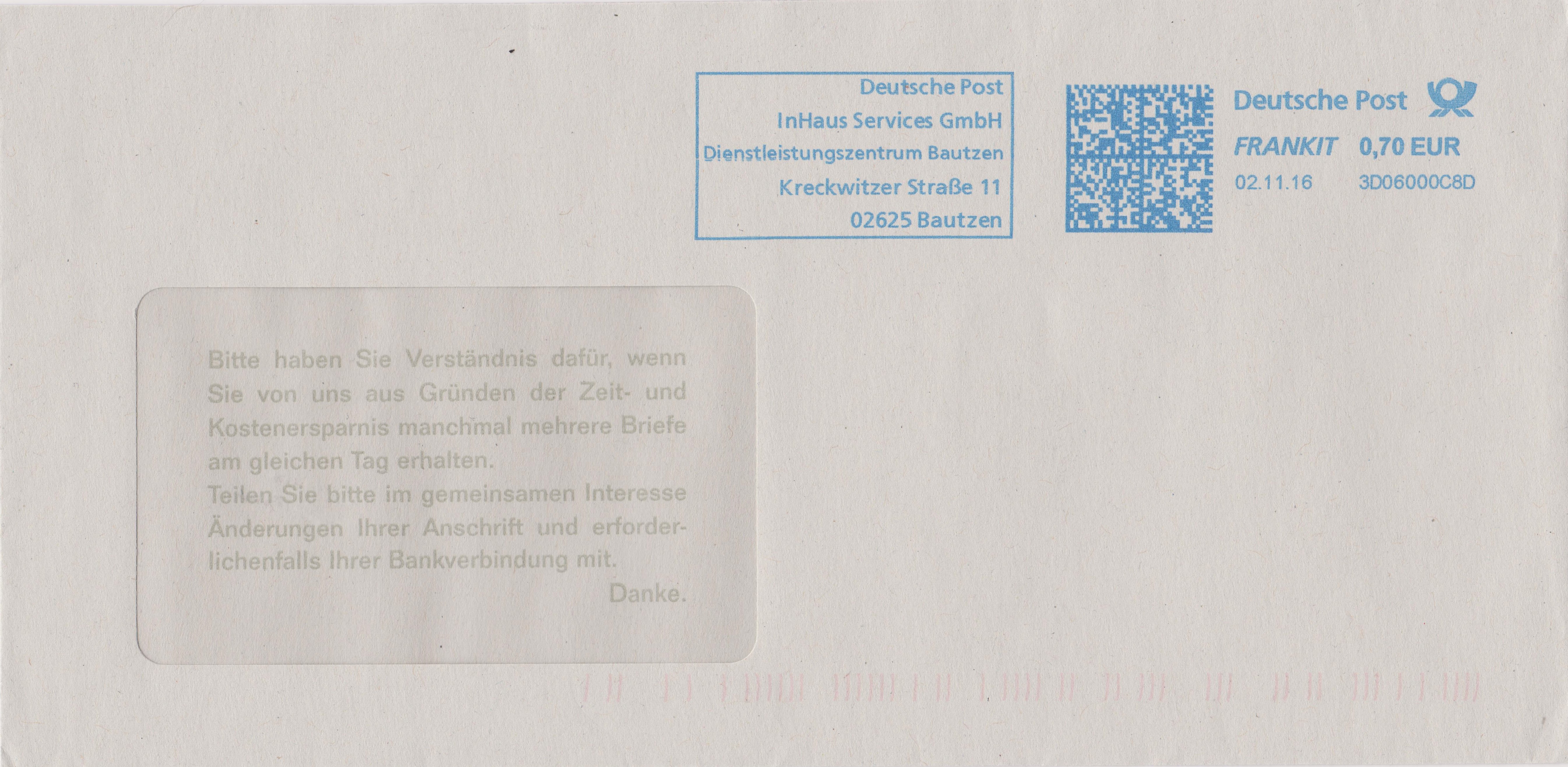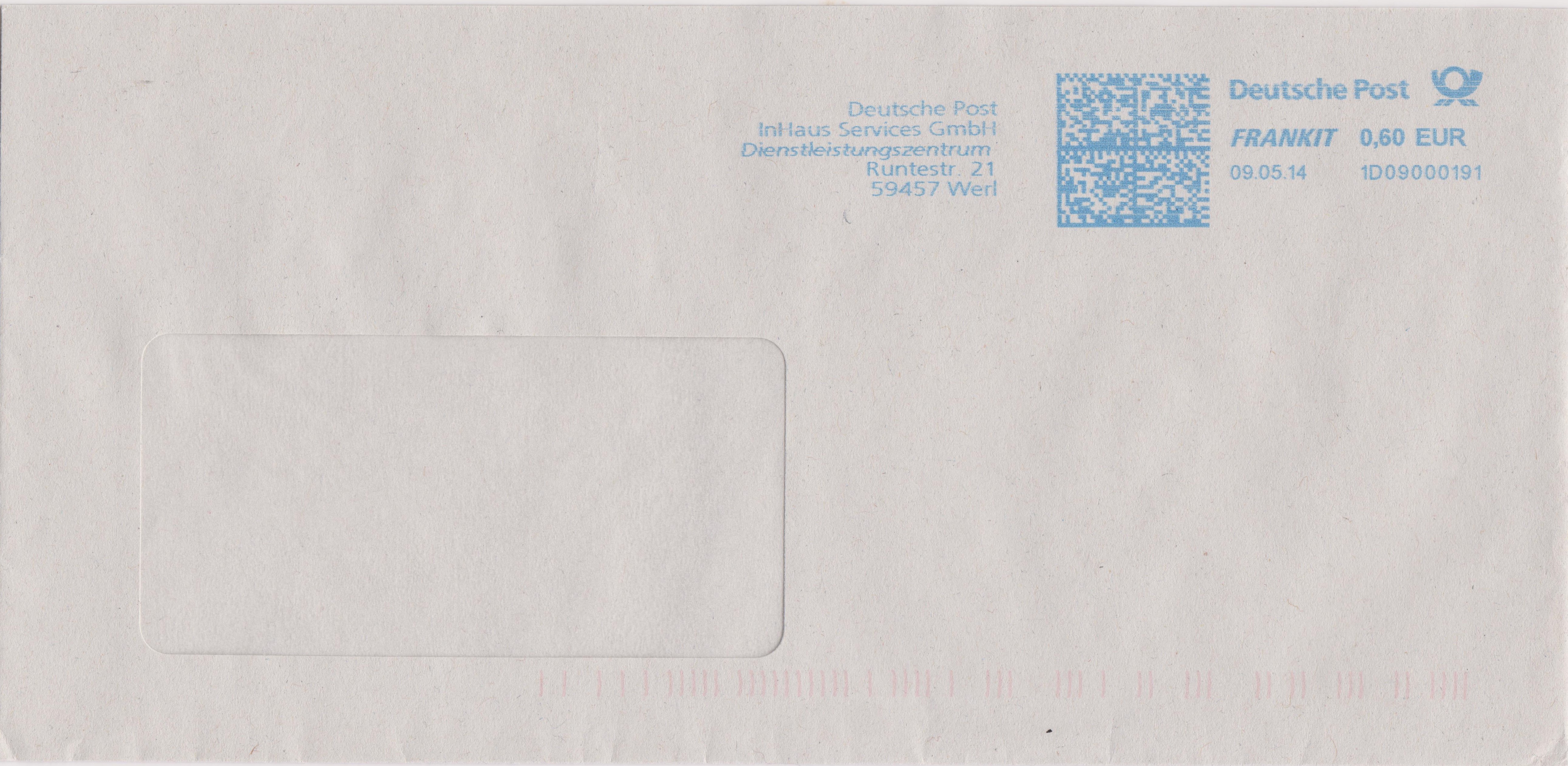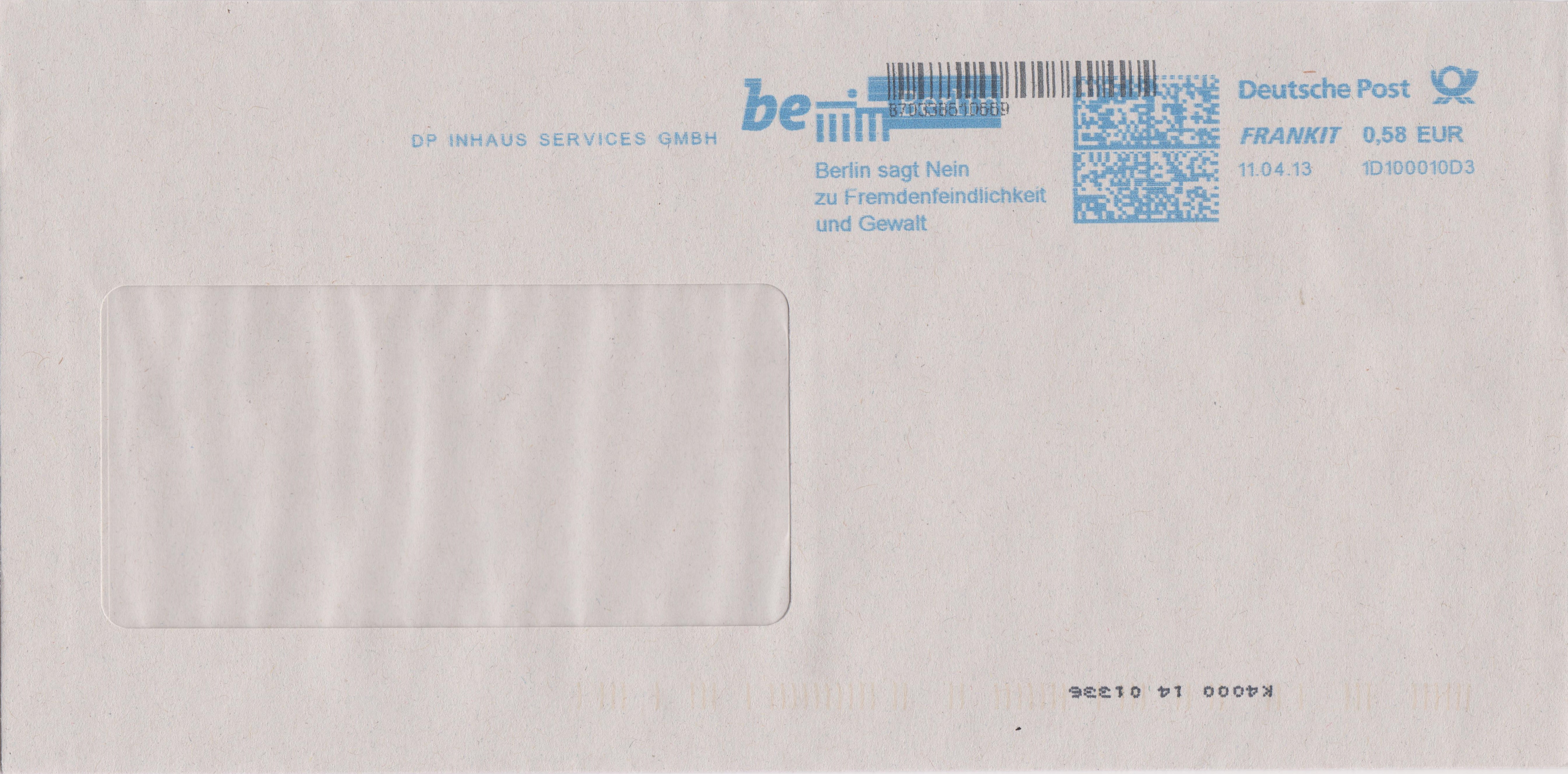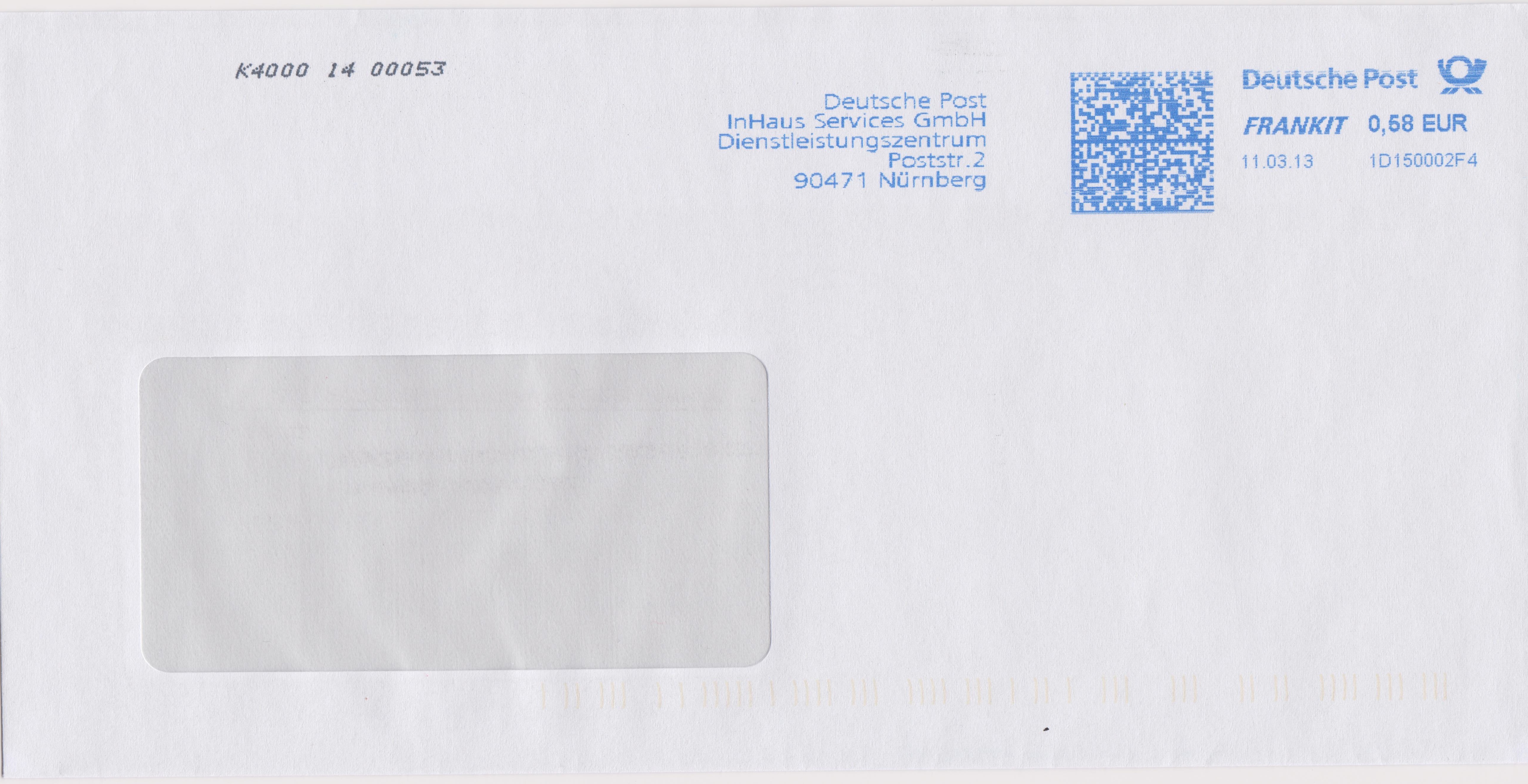 "FRANKIT"-Brief vom 05.04.2013, Portostufe 0,58 € mit Adressenangabe "Deutsche Post, InHaus Services GmbH, Schwanthalerstr. 46, 80336 München"