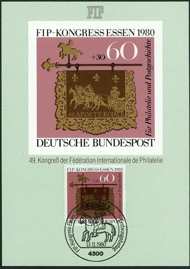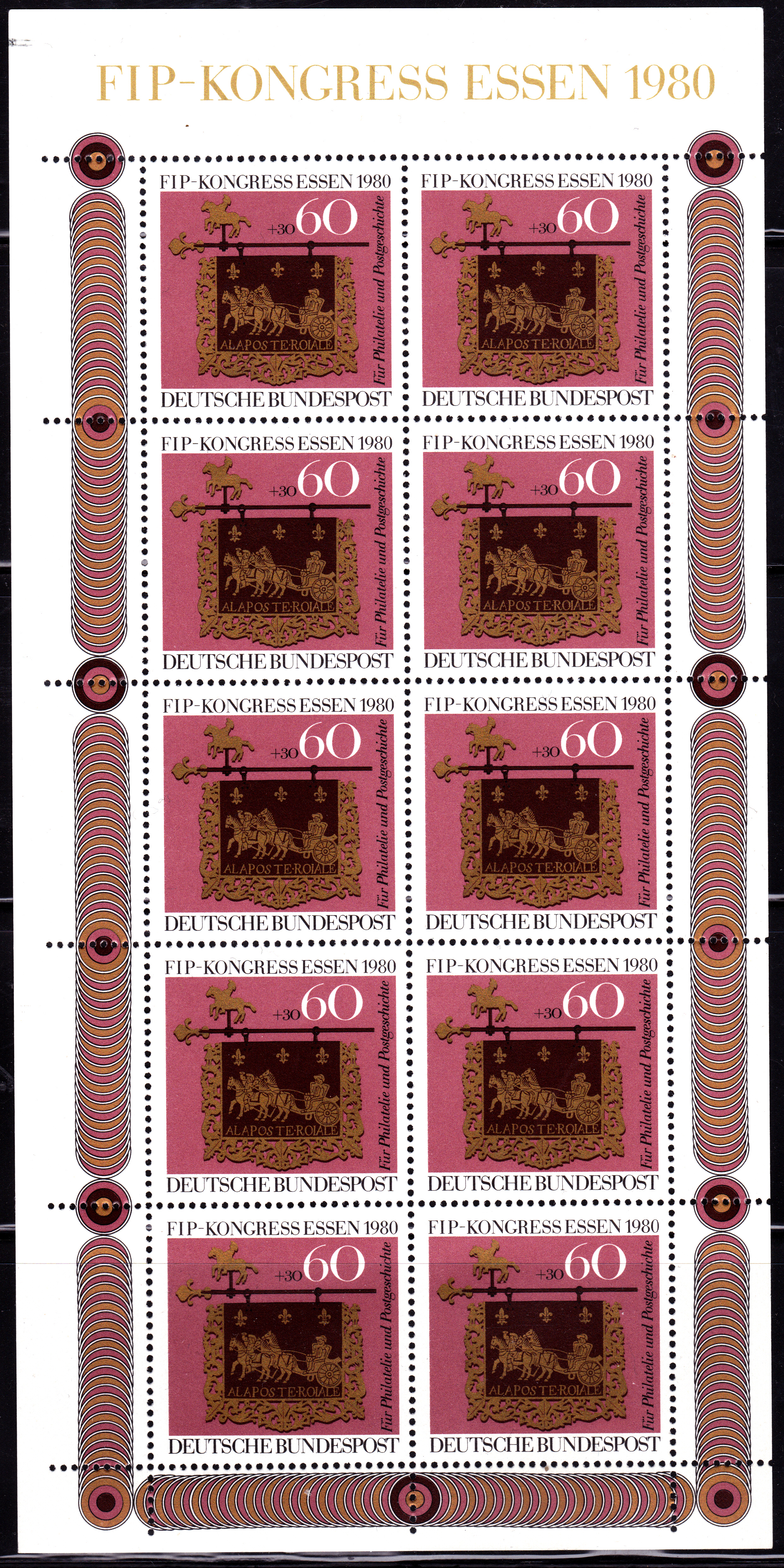 Zum Kongress des Internationalen Philatelistenverbandes (FIP), der 1980 in Essen stattfand, verausgabte die Deutsche Bundespost eine Sondermarke mit Zuschlag. Diese Marke erschien im Zehnerbogen und war somit nach der Marke zum Tag der Briefmarke 1979 der zweite Bogen dieser Art der Deutschen Bundespost.
