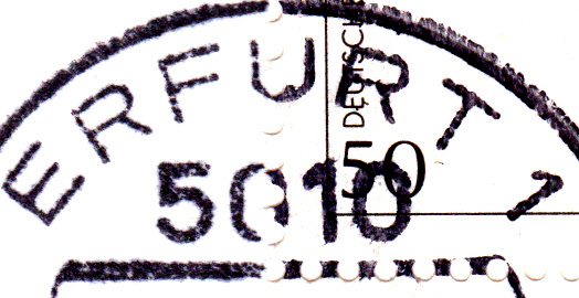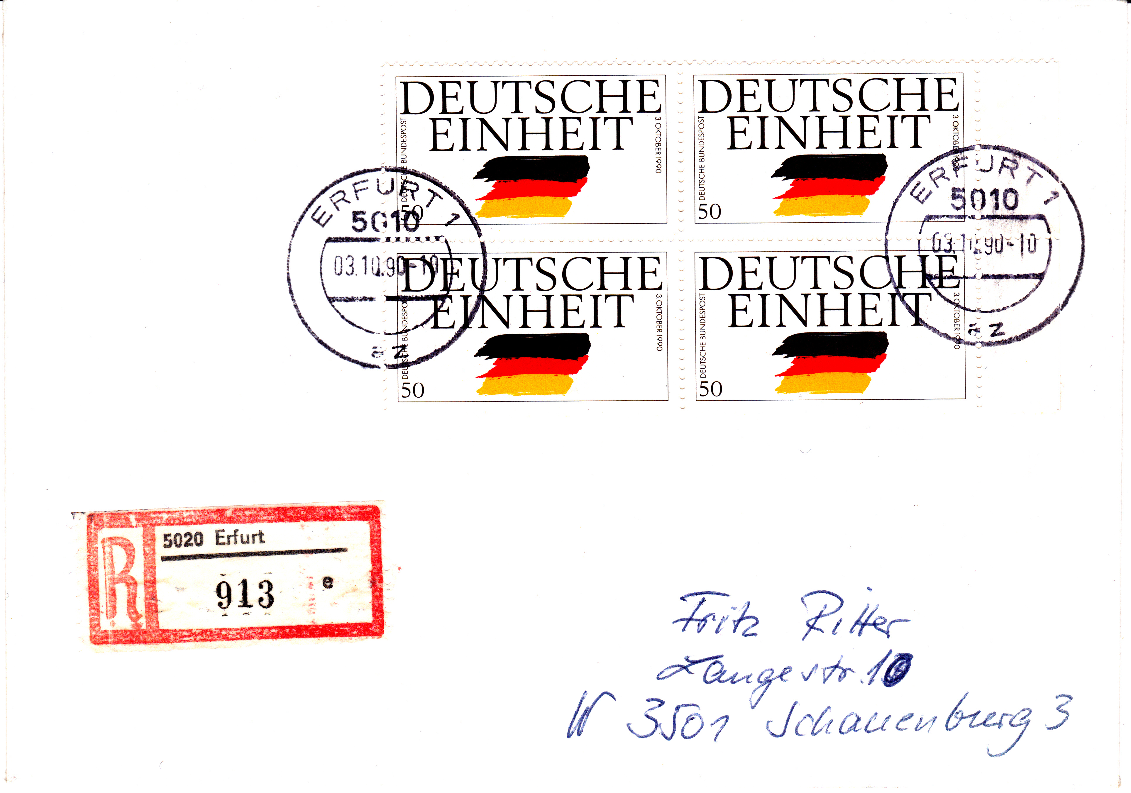 Am 3.Oktober gab die Deutsche Bundespost zur Wiedervereinigung der beiden deutschen Staaten zwei Marken heraus. Hier ein Viererblock des Wertes zu 50 Pfennig (MiNr 1477) vom rechten Bogenrand auf einem Einschreibebrief aus Erfurt. Er wurde am Ersttag der Marken, am 3.Oktober 1990, beim Postamt O-5010 Erfurt 1 aufgegeben. Der Brief ist portogerecht mit 200 Pfennig frankiert (im VGO galten von 1.7.1990 bis 31.3.1991 Sondertarife: Brief bis 20 Gramm 50 Pf Einschreiben 150 Pf ergibt zusammen 200 Pf).