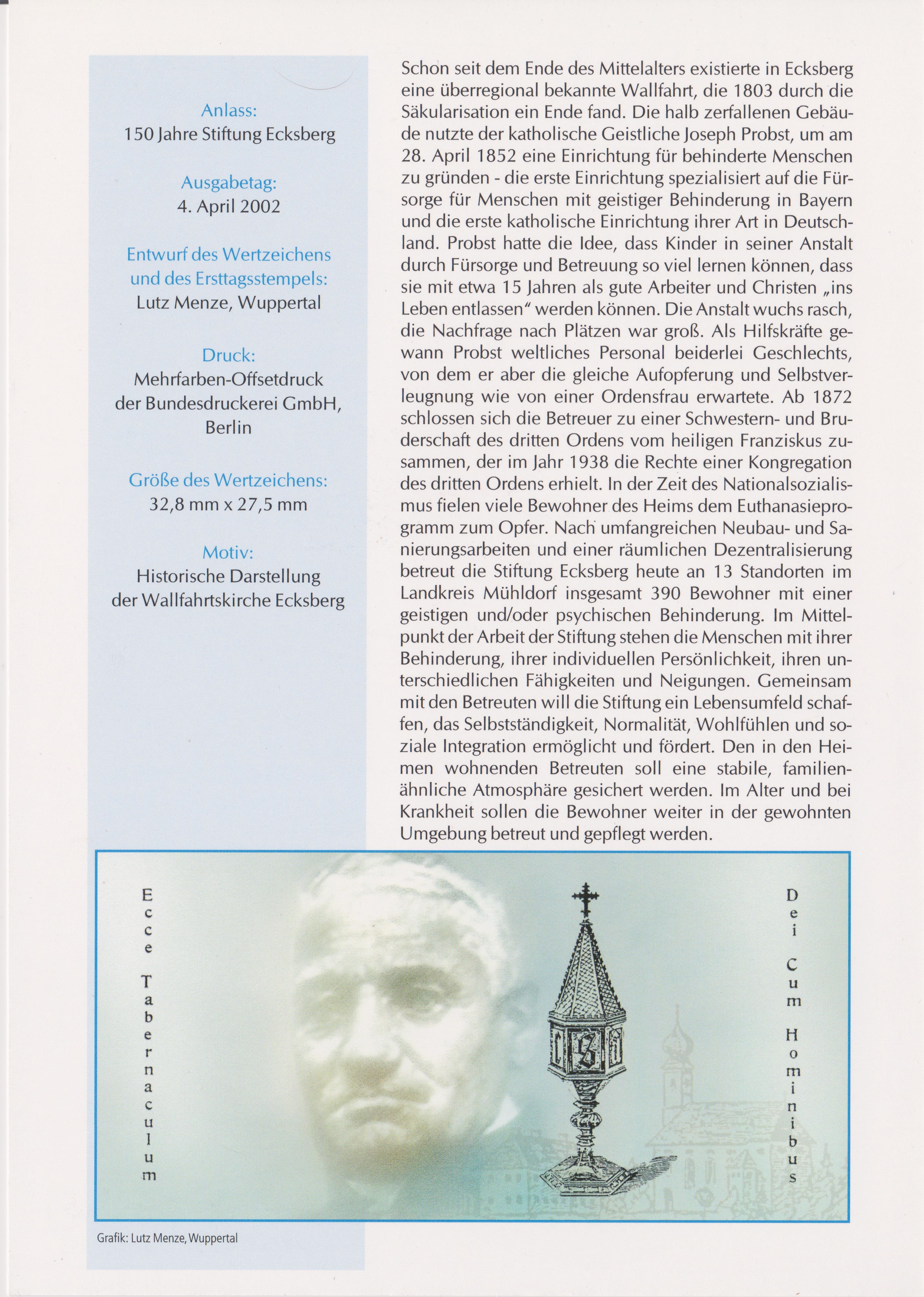 Dieses ETB 11/2000 zeigt die zum Jubiläum "150 Jahre Stiftung Eckaberg" erschienene Sondermarke mit ESST Bonn: