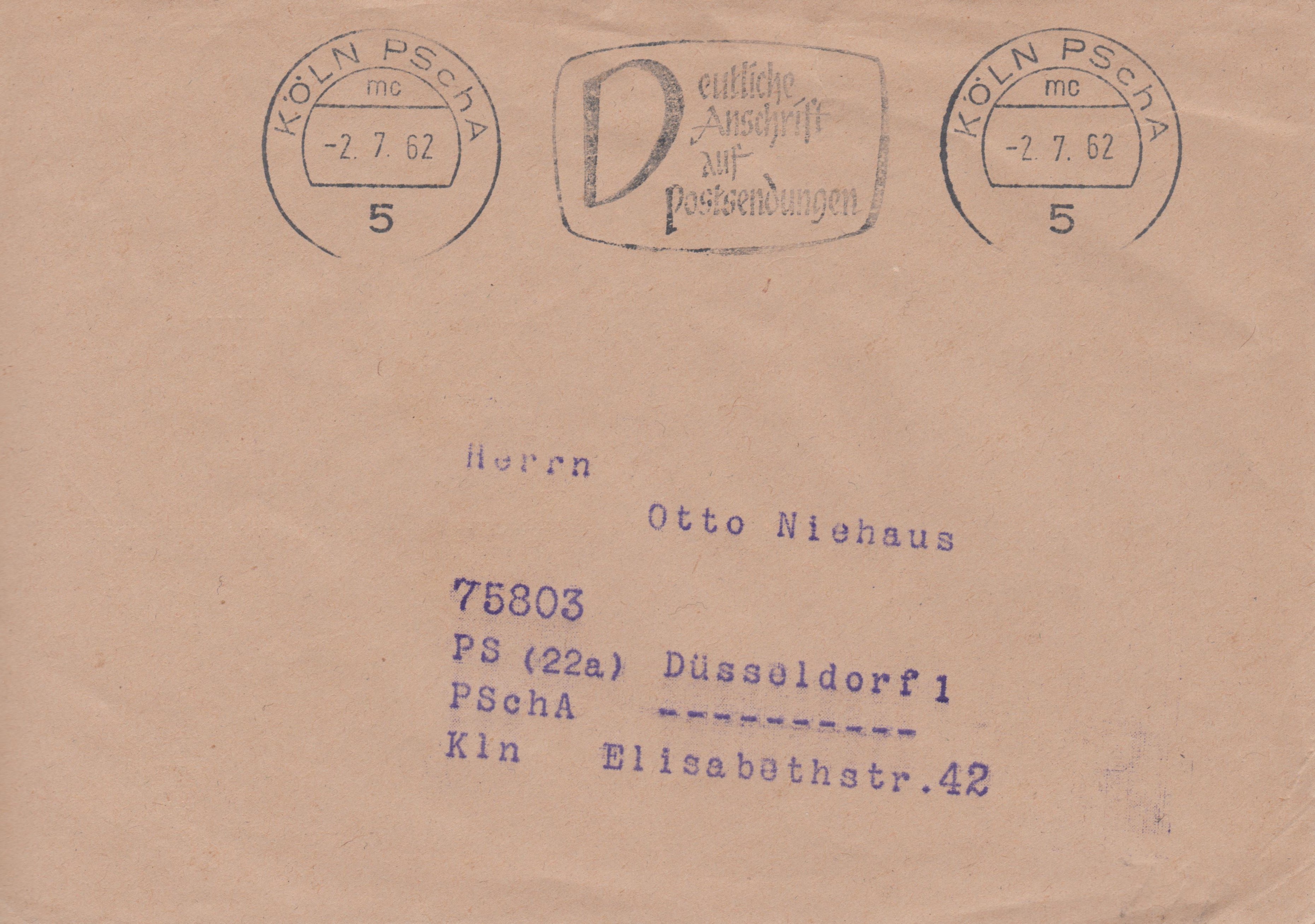 Maschinenstempel des Postscheckamts KÖLN mit Texteinsatz mit Posteigenwerung "Deutliche Anschrift auf Postsendungen" vom 02.07.1962: