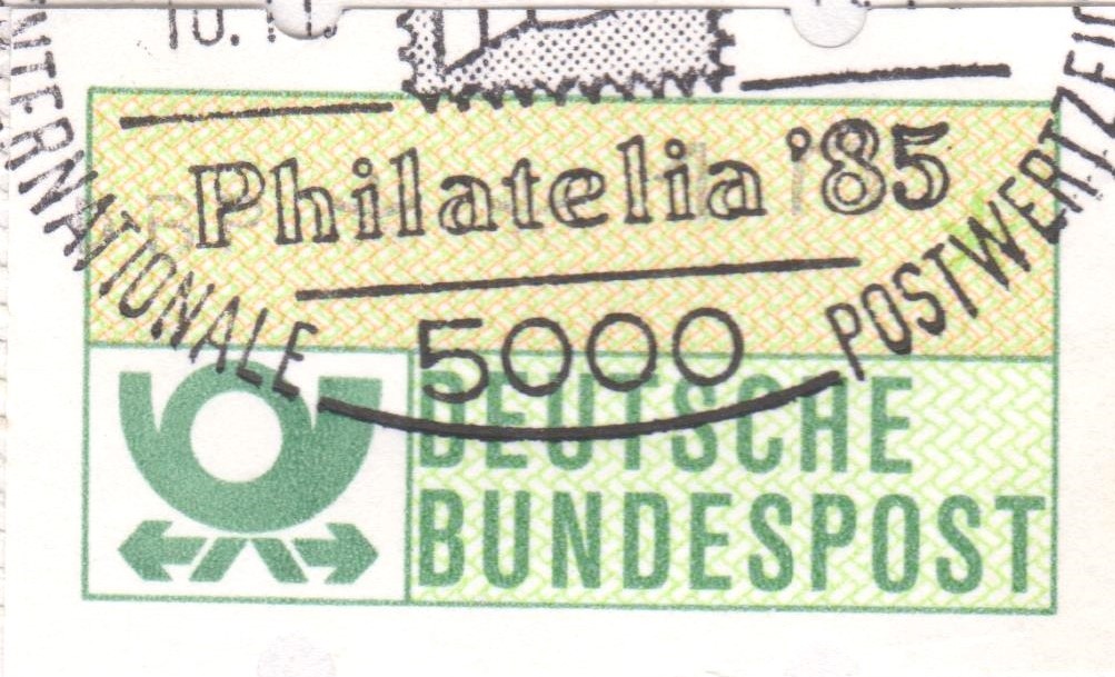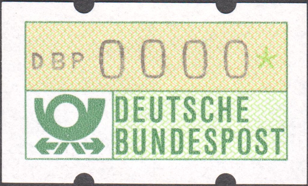 Testdruck "DBP 0000" auf Automatenmarke mit Zählnummer "1295".