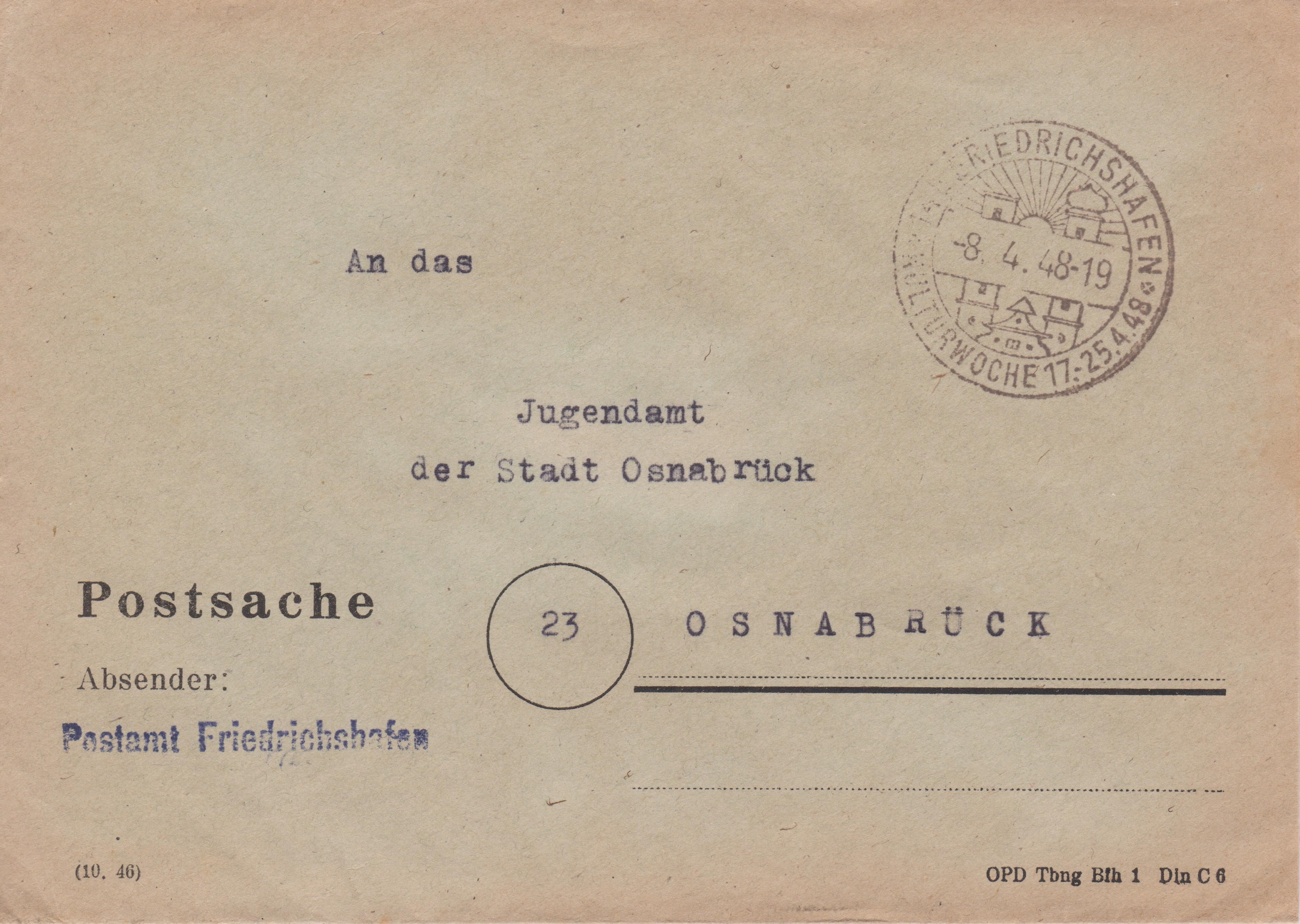 Postsache vom 08.04.1948, Absender "Postamt Friedrichshafen", adressiert nach 23 OSNABRÜCK: