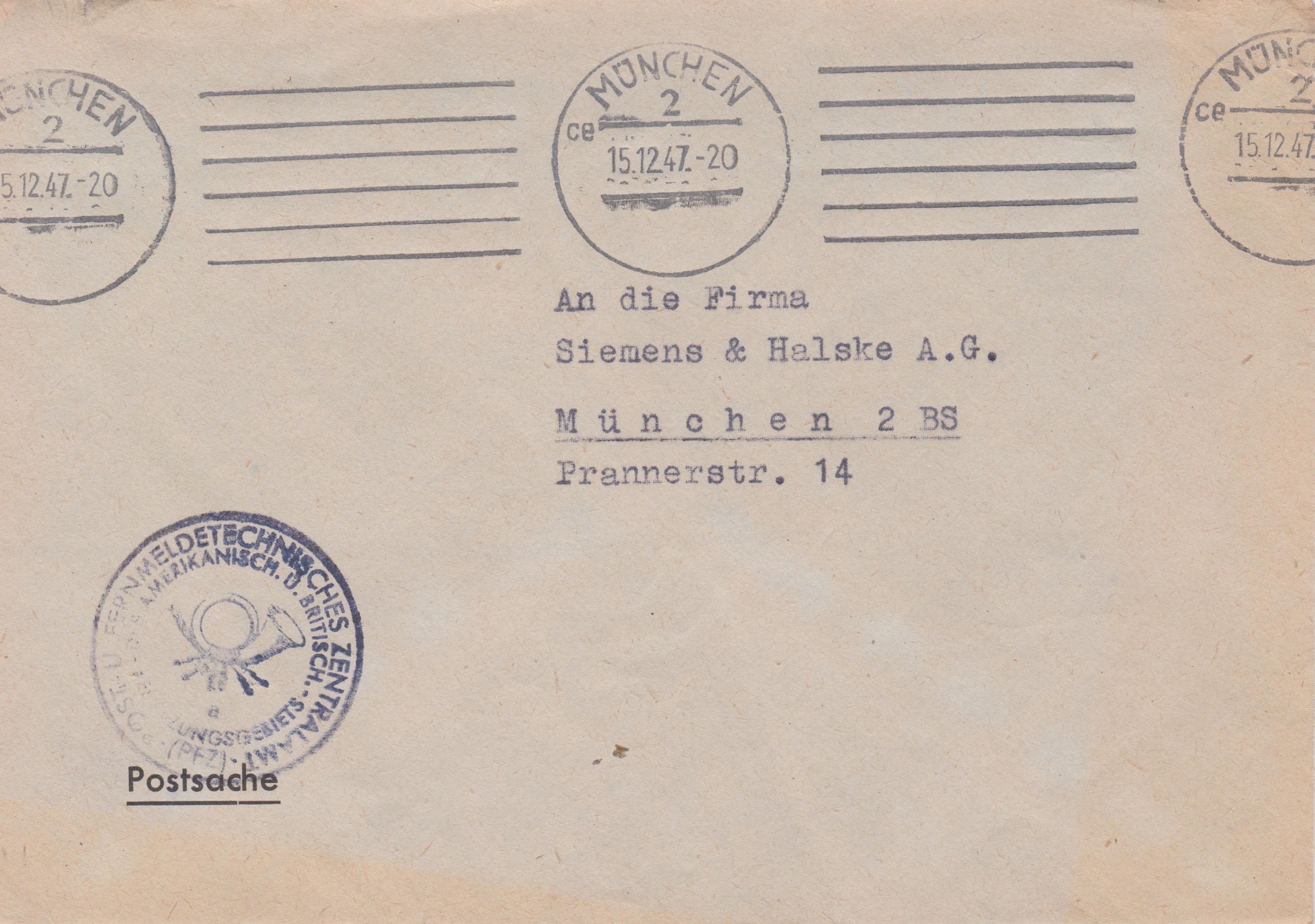 Postsache vom Absender "Post- u. Fernmeldetechnisches Zentralamt des amerikanischen und britischen Besatzungsgebietes 13b MÜNCHEN", gelaufen am 15.12.1947 im Ortsverkehr von MÜNCHEN 2, mit Maschinenstempel MÜNCHEN 2 ce: