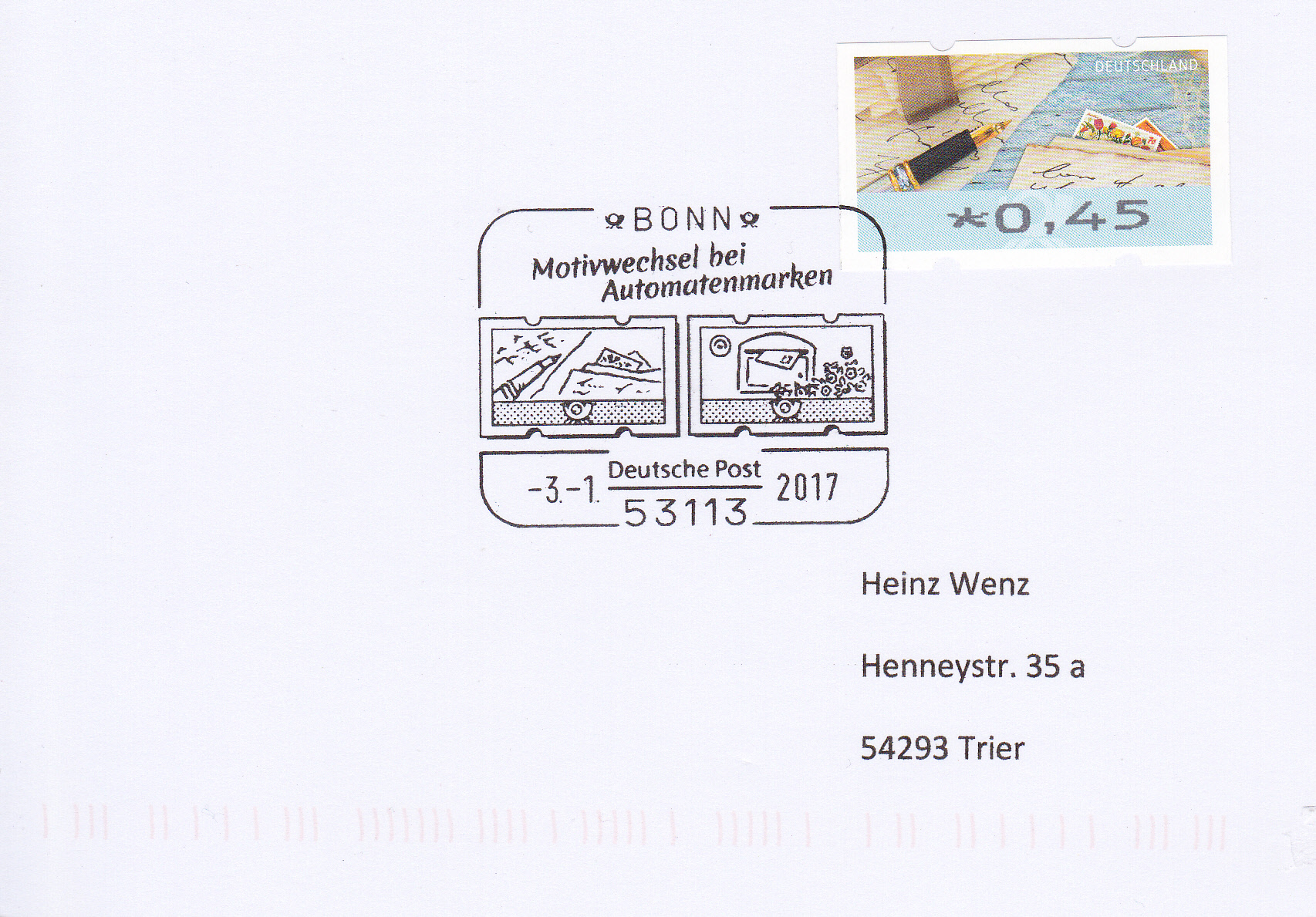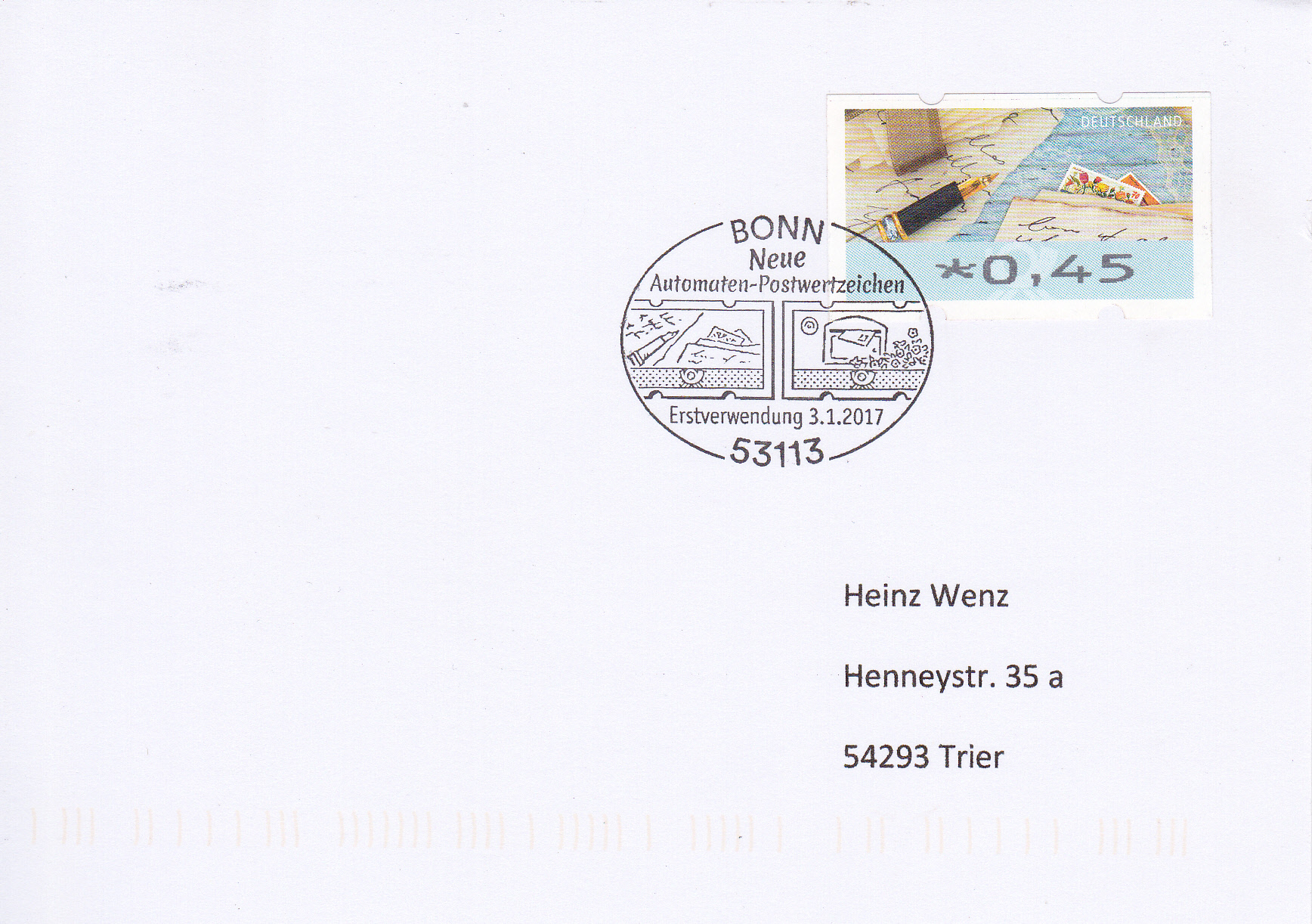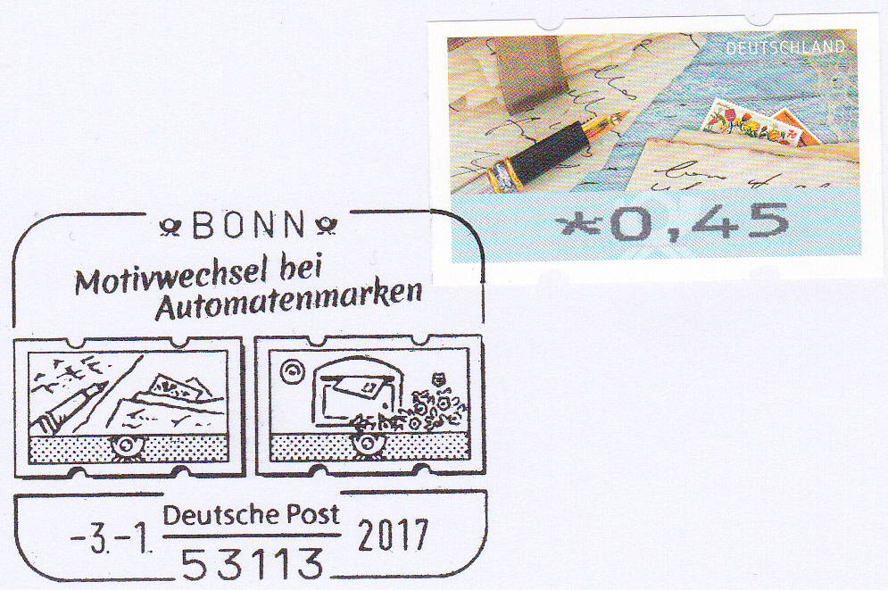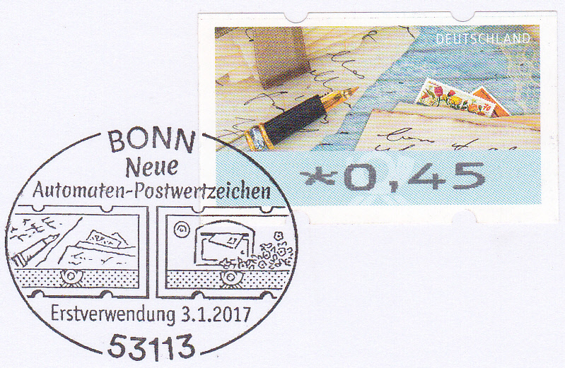 In Bonn wurde ein Erstverwendungsstempel für die neuen Automatenmarken eingesetzt, der die beiden Motive im Stempel zeigt. Hier eine Karte mit einer Automatenmarke zu 0,45€ mit dem Motiv "Briefe schreiben und empfangen".