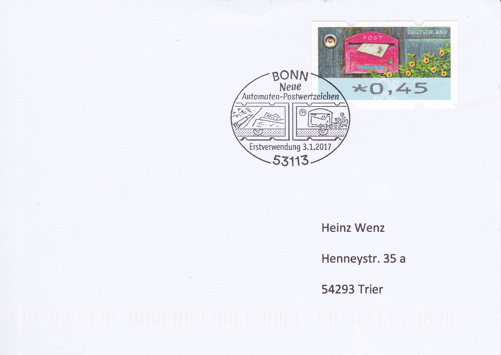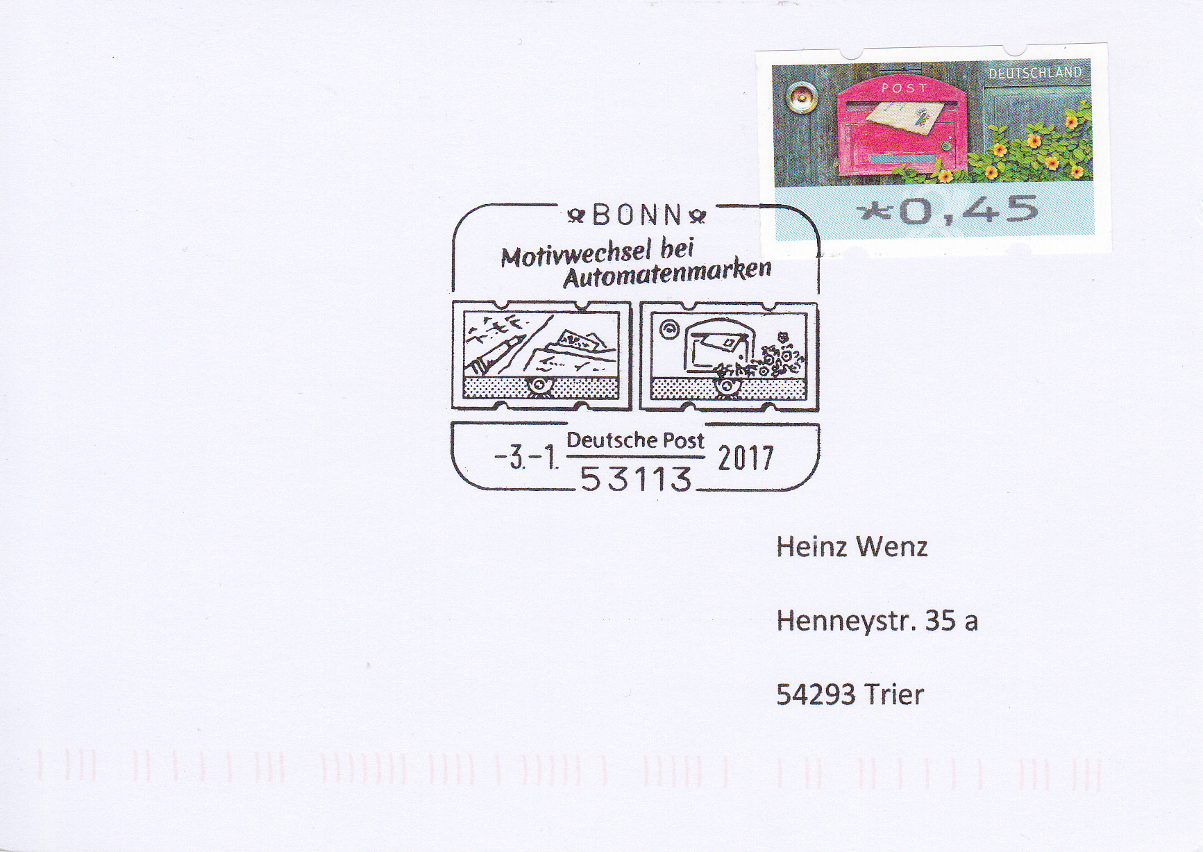 Es folgt auch hier noch eine Karte mit einer Automatenmarke zu 0,45€ mit dem Motiv "Brief in Briefkasten" und dem gleichen Stempel aus Bonn.