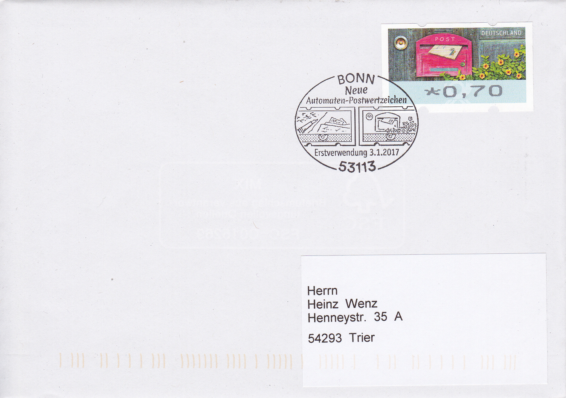 Hier auch noch ein Brief mit der Wertstufe zu 0,70€ mit dem Motiv "Brief in Briefkasten" und dem Erstverwendungsstempel Bonn.