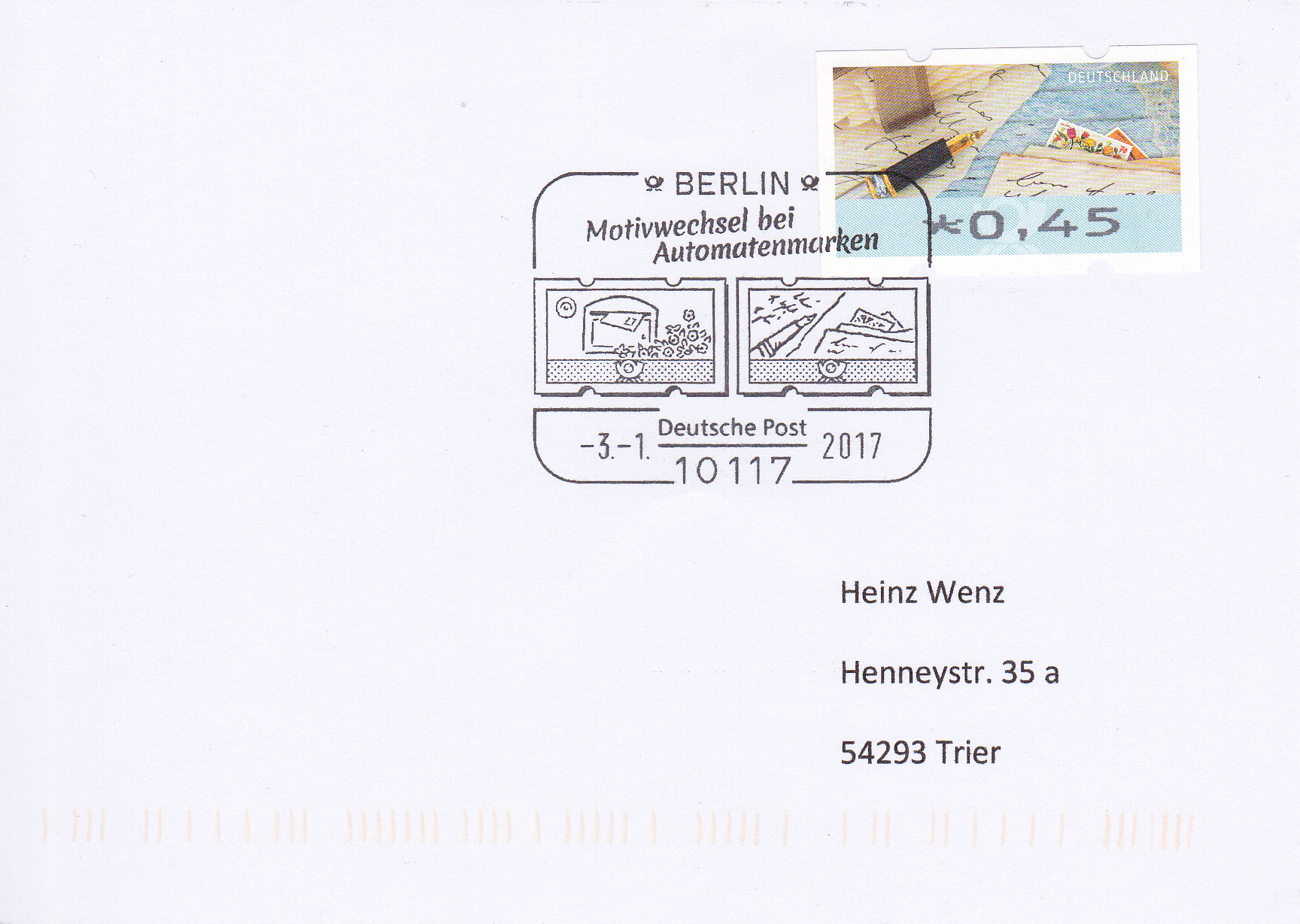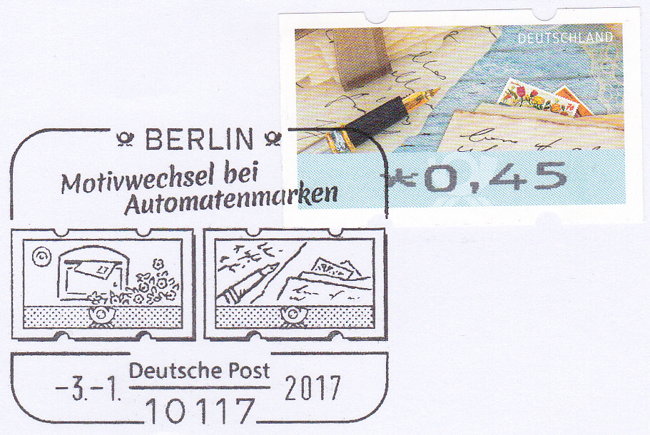 In Berlin gab es am ersten Verwendungstag der Automatenmarken auch einen Sonderstempel "Motivwechsel bei Automatenmarken" der auch die beiden neuen Motive im Stempel vorstellt. Hier eine Postkarte mit einer Automatenmarke zu 0,45€ mit dem Motiv "Briefe schreiben und empfangen