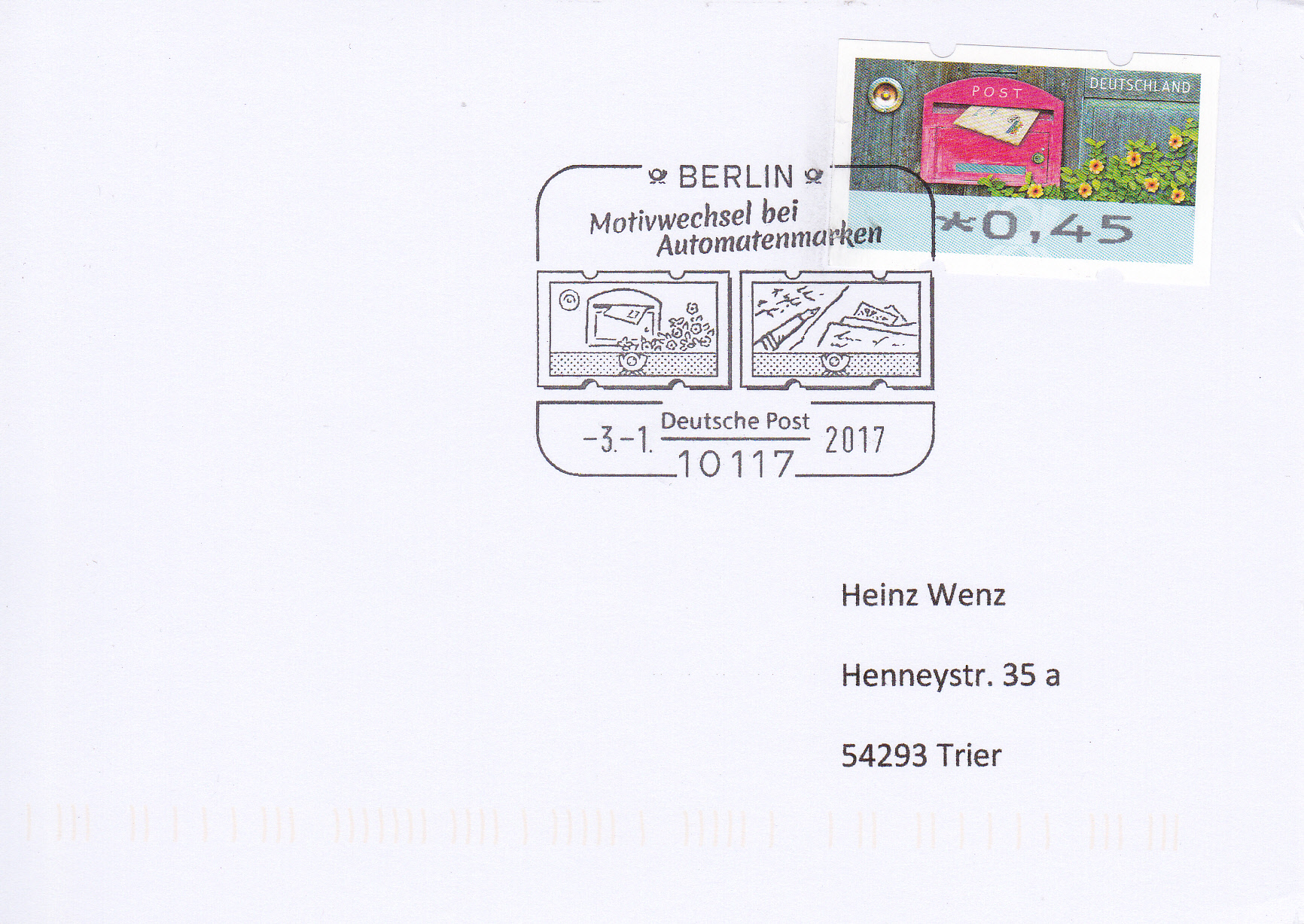 Es folgt noch eine Karte mit einer Automatenmarke zu 0,45€ mit dem Motiv "Brief in Briefkasten" und dem gleichen Stempel aus Berlin.