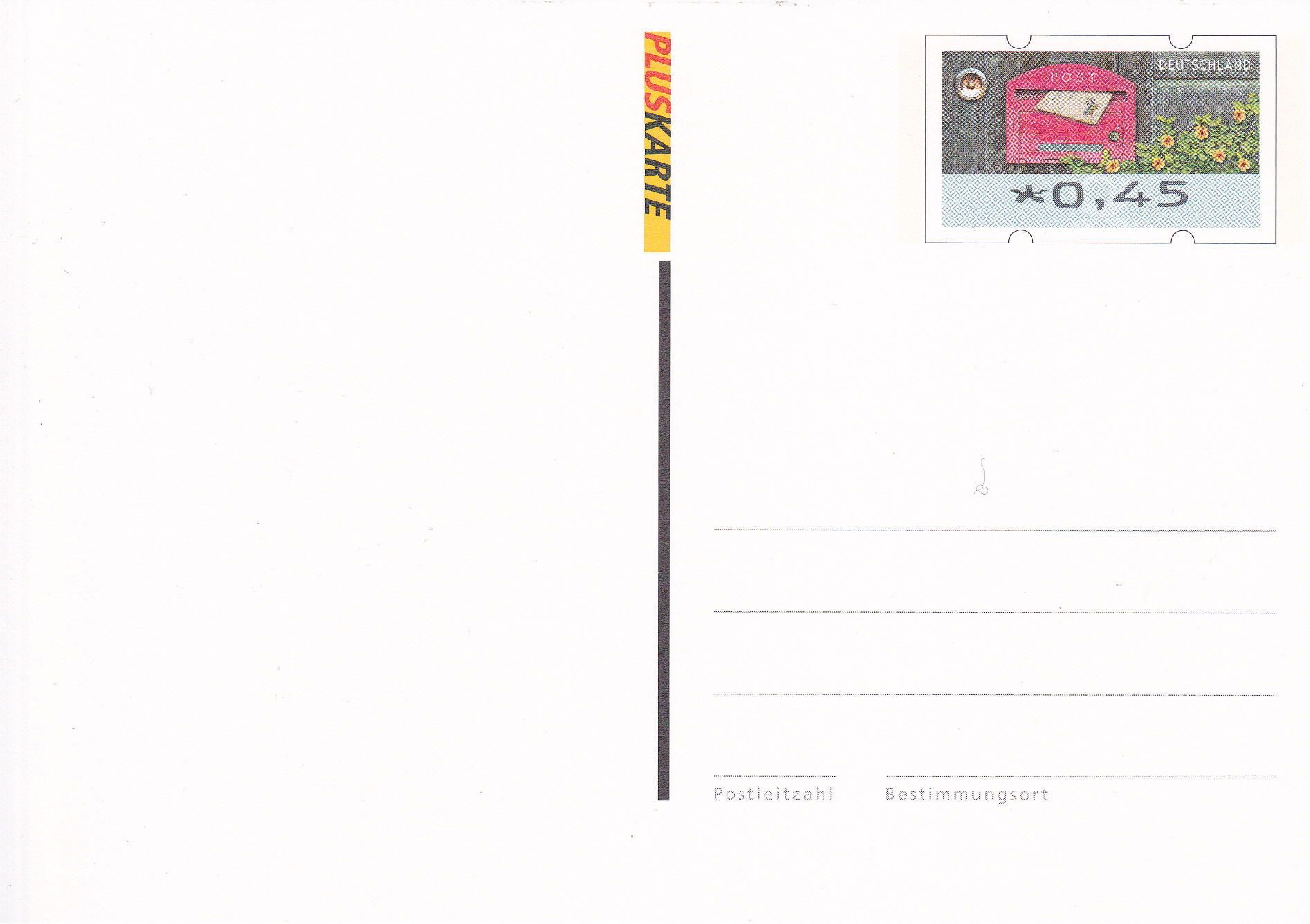 Es gibt auch eine Post/Pluskarte mit einem Wertstempel zu 45 Cent mit dem Motiv "Brief in Briefkasten" (als sogenannte Blankoganzsache). Hier eine unbenutzte Karte.