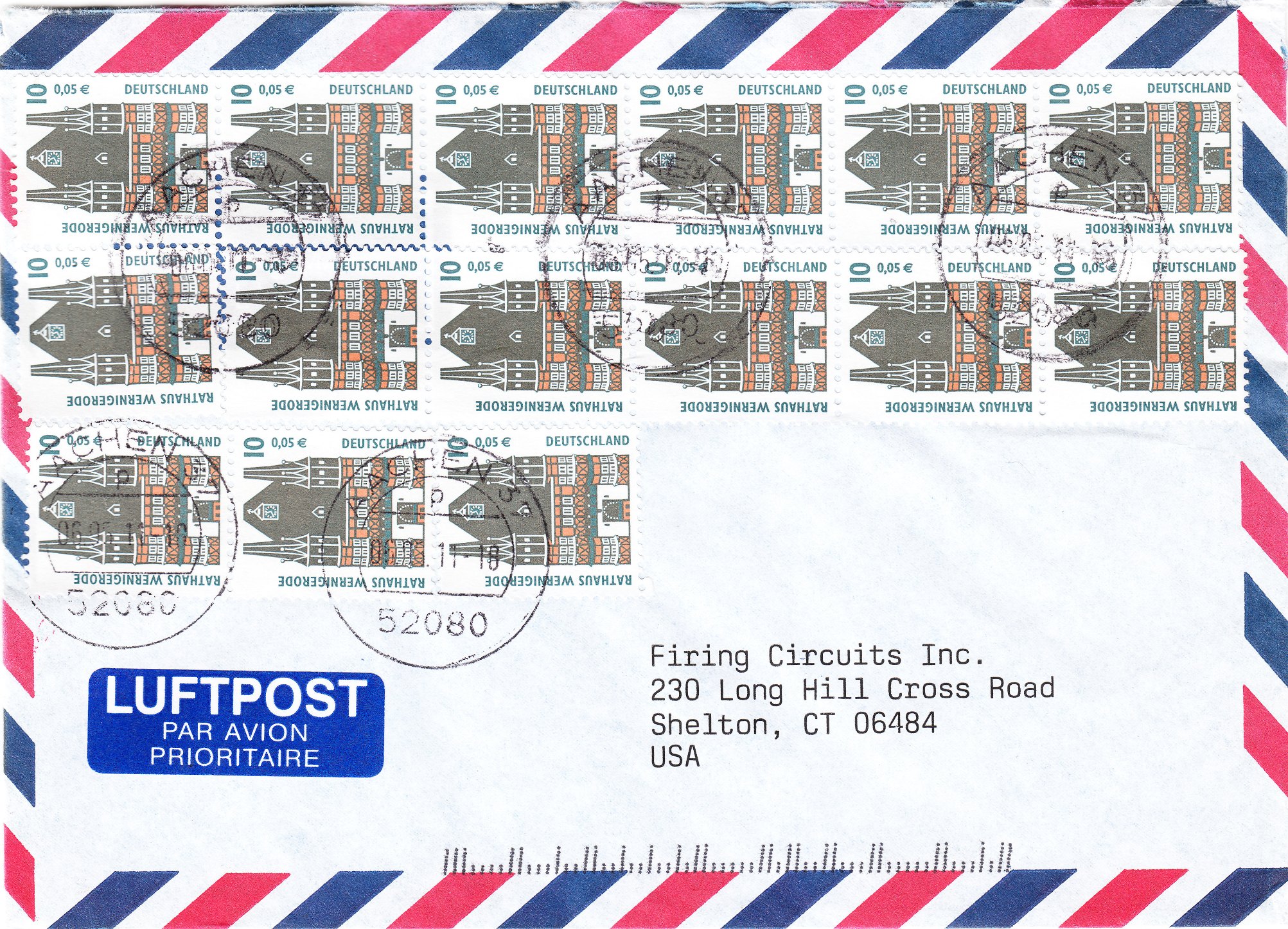 Portorichtig wurde dieser Standardbrief in die USA am 06.05.2011 mit 0,75 € frankiert per Mehrfachfrankatur von 15 Stück der MiNr. 2139 A: