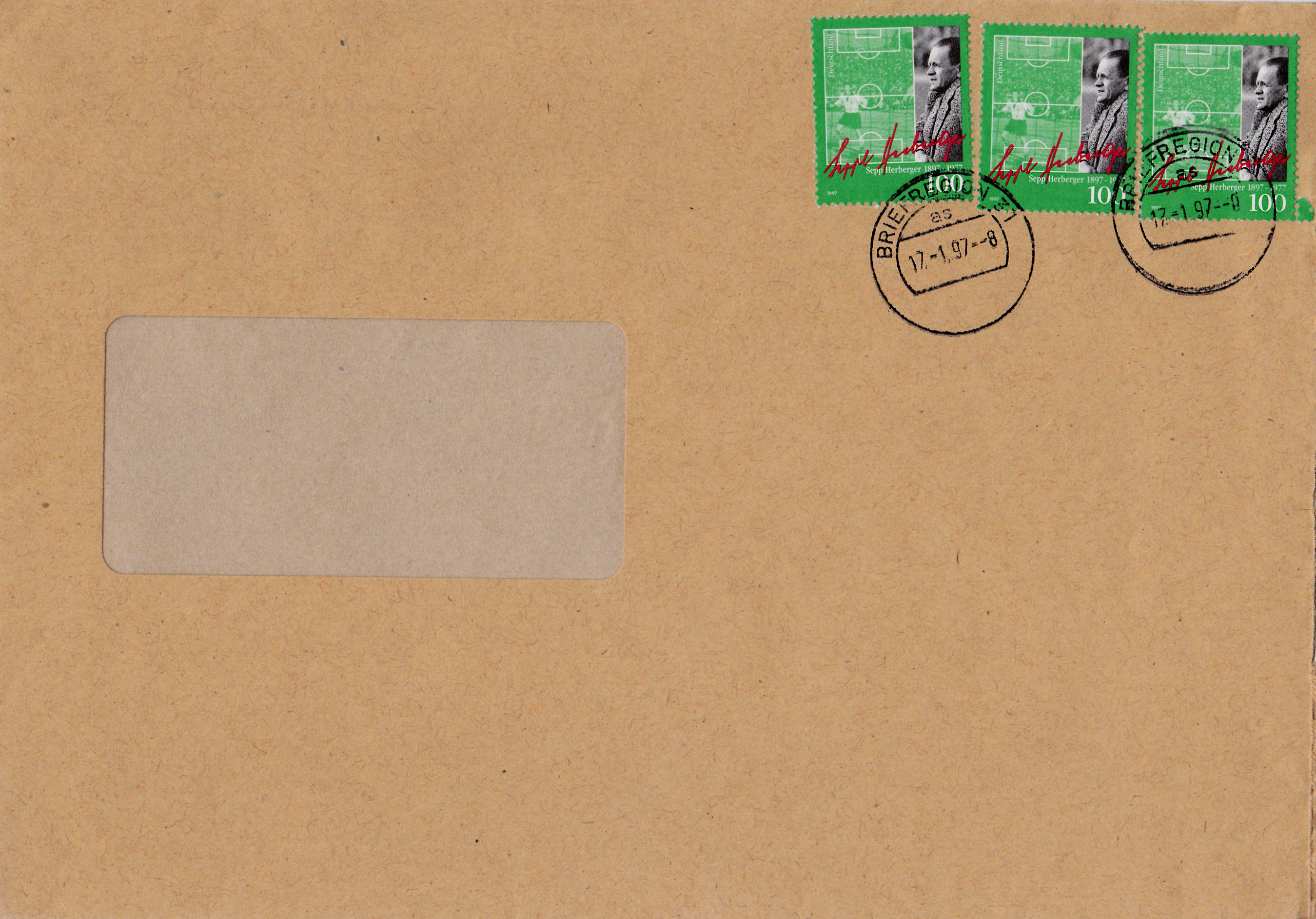 Drei Werte der Sondermarke "100. Geburtstag von Sepp Herberger" auf einem Brief von 51 bis 500 g. Der Brief ist mit einem Handstempel "Briefregion 31" am 17.1.1997 abgestempelt.