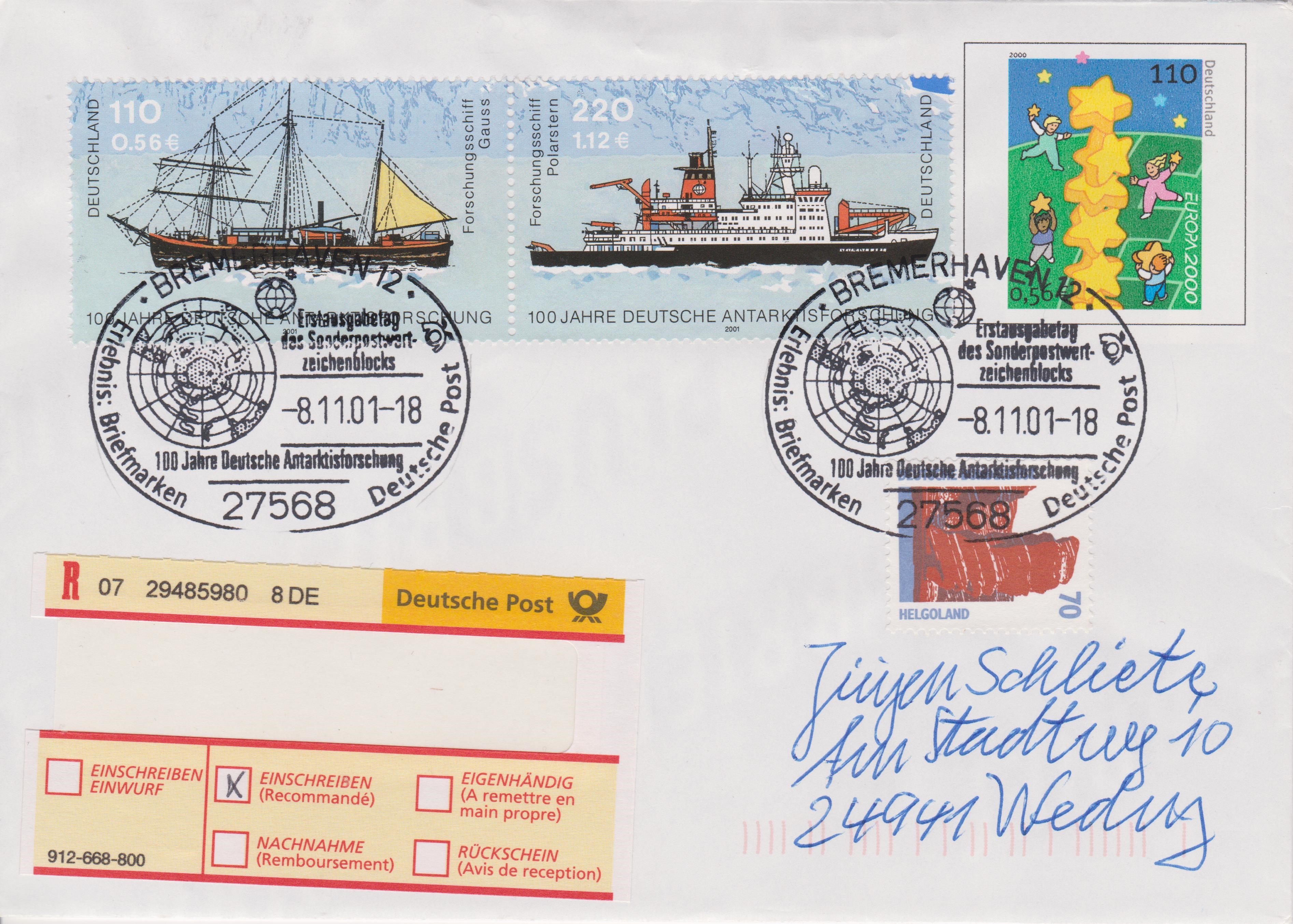 Hier der Zusammendruck aus Block 57 in Mischfrankatur auf einer Ganzsache am Erstausgabetag 08.11.2001 gestempelt 27568 BREMERHAVEN 12: