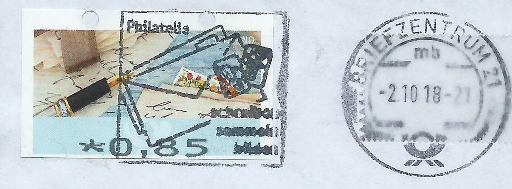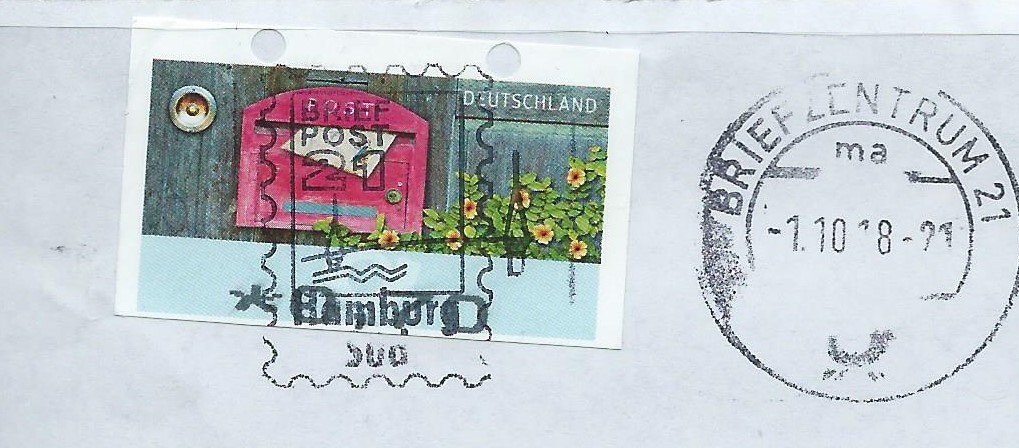 mir sind in der letzten Zeit in der Eingangspost 2 Briefe aufgefallen, die verschnittene Automatenmarken der neuesten Generation als Frankatur hatten. "Hatten" aus dem Grunde, da ich mit Anschrift und Absender beschriebene Belege aus Datenschutzgründen nicht als Ganzes mitnehmen darf. Somit konnte ich wenigstens die Stücke als Briefausschnitt retten. Hier sehen wir nun die momentan aktuellen Automatenmarken mit oben geschlossenen Transportlöchern und Maschinenstempel vom Briefzentrum 21 vom 1. und 2.10.2018.