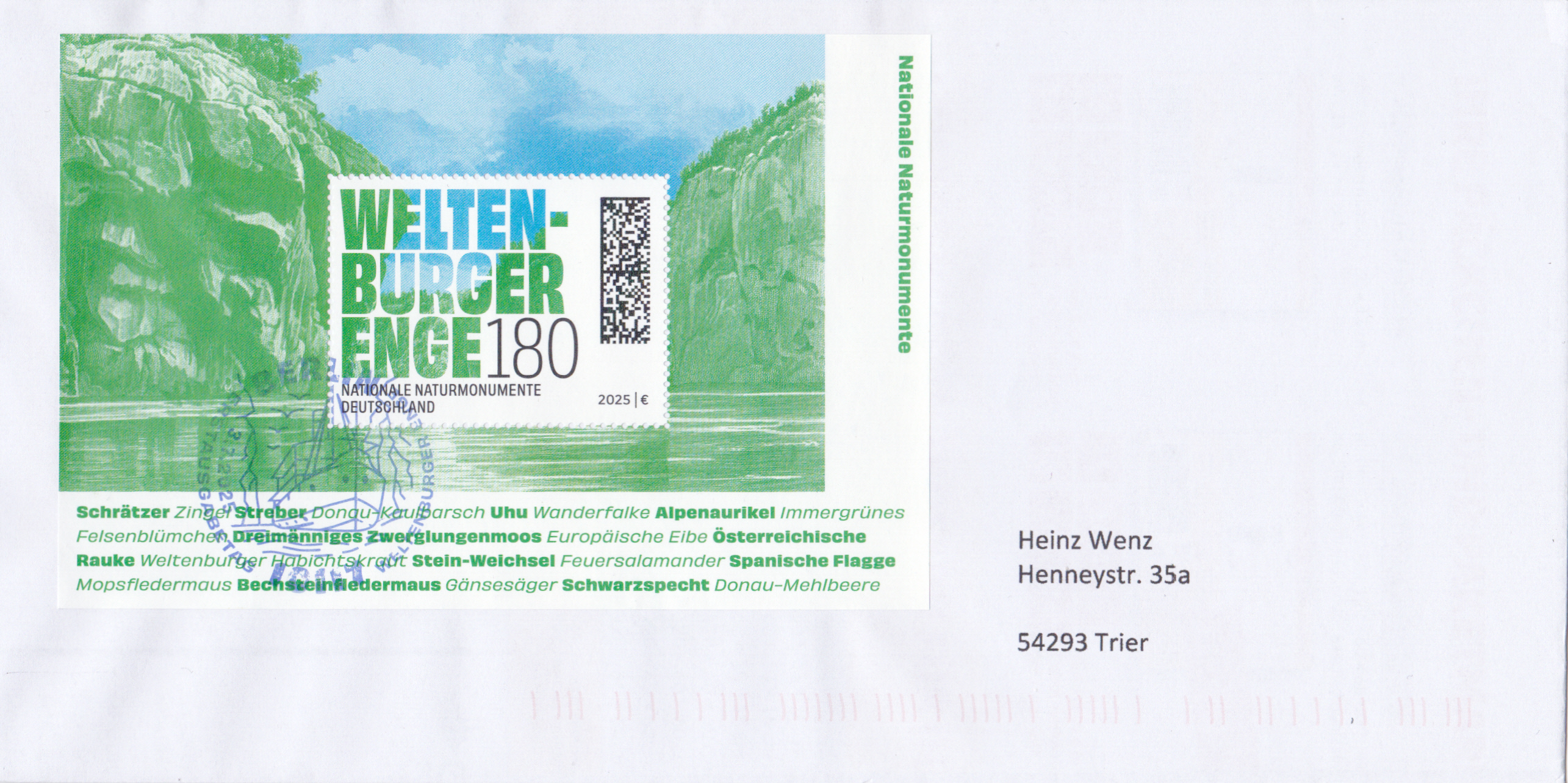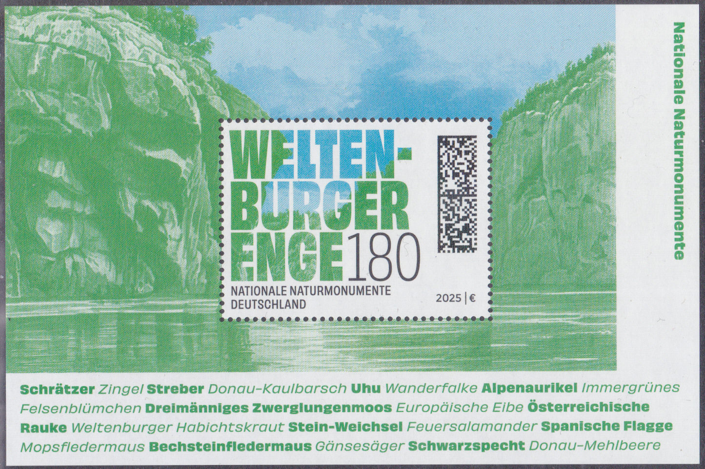 Diesr Blockausgabe (MiNr Block 95 mit Marke MiNr 3915) zeigt die Kalksteinfelsen "Lange Wand" und "Stille Wand" des Donaudurchbruchs "Weltenburger Enge" nach einem Stahlstich in Eduard Dullers "Die malerischen und romantischen Donauländer" (1840). Am unteren Blockrand sind Angaben zu Flora und Fauna aus dieser Landschaft nachzulesen.