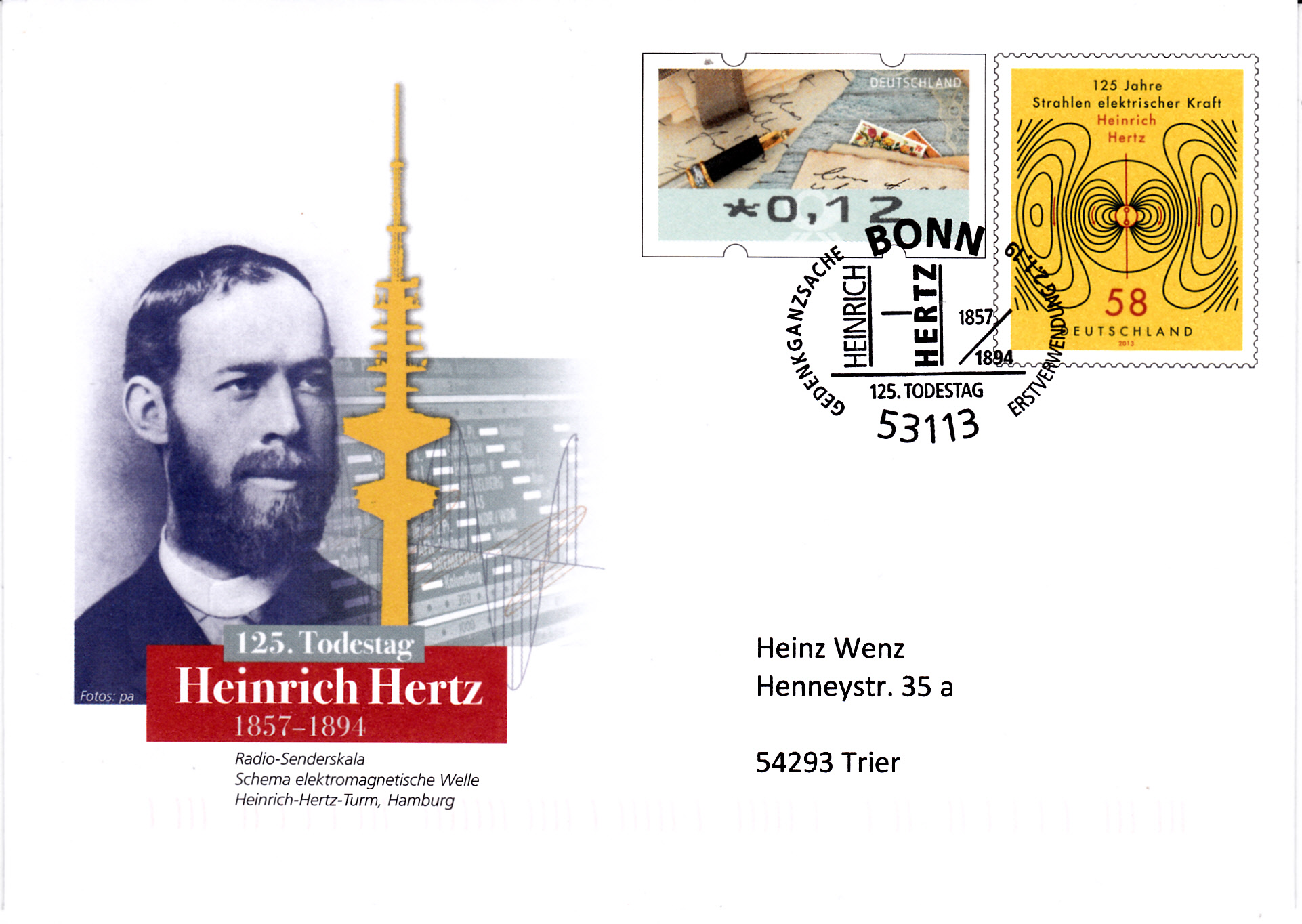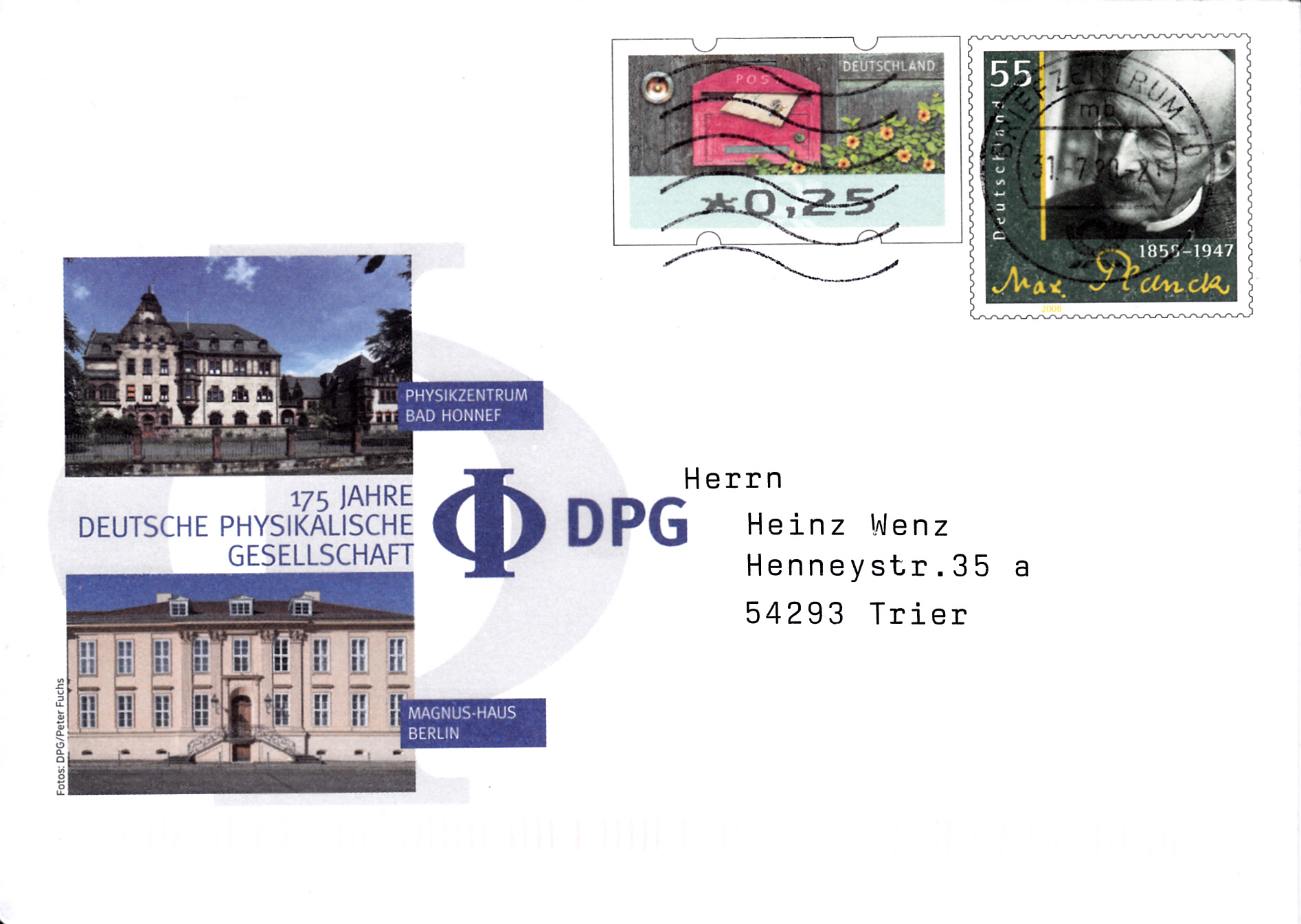 Bei dieser Gedenk-Ganzsache "175 Jahre Deutsche Physikalische Gesellschaft" ist ein Automatenmarken-Wertstempel zu 25 Cent zur Portoergänzung vorhanden.