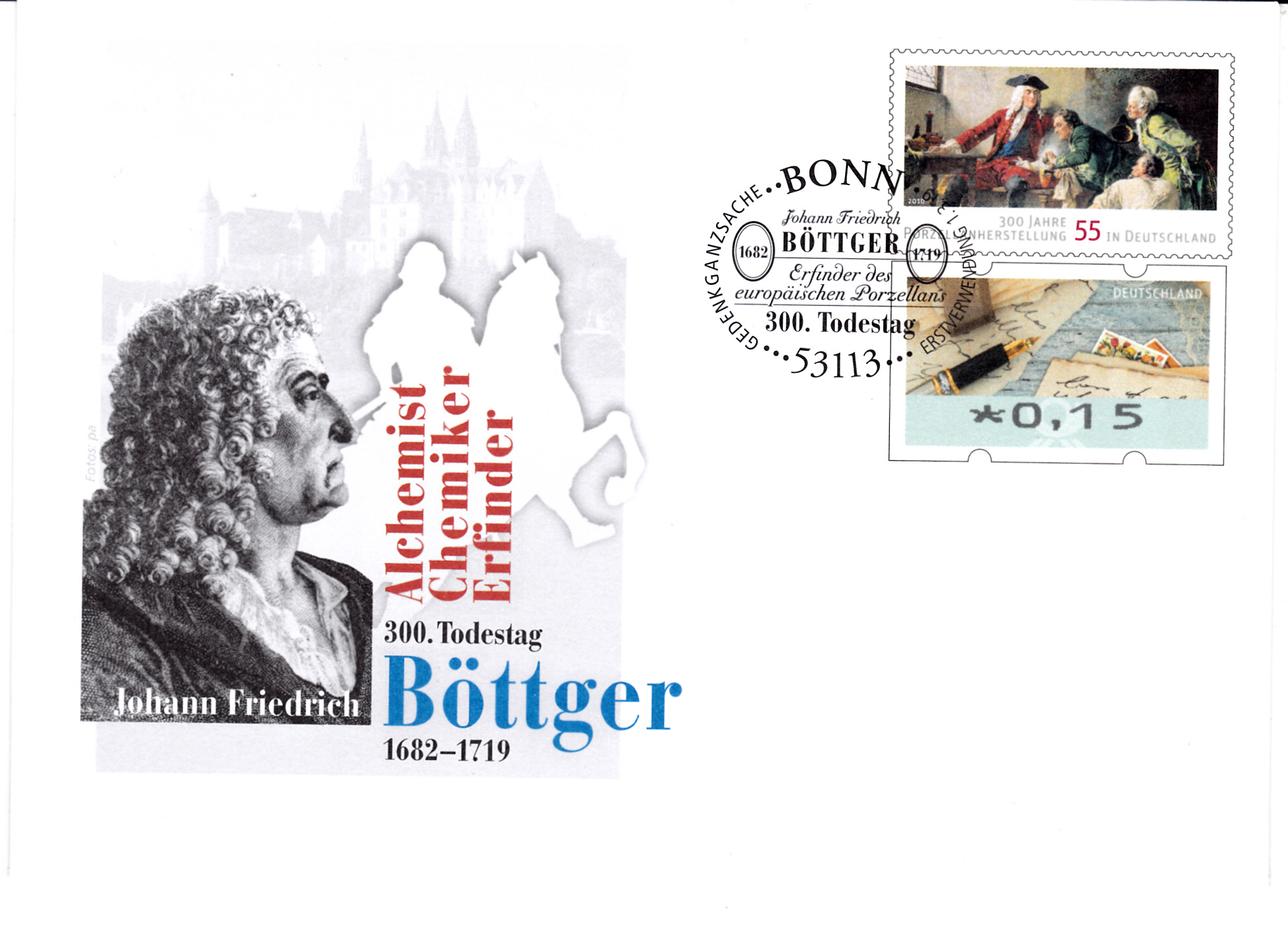 Es folgt ein Automatenmarken-Wertstempel zu 15 Cent auf der Ganzsache zum 300. Todestag von Johann Friedrich Böttger.