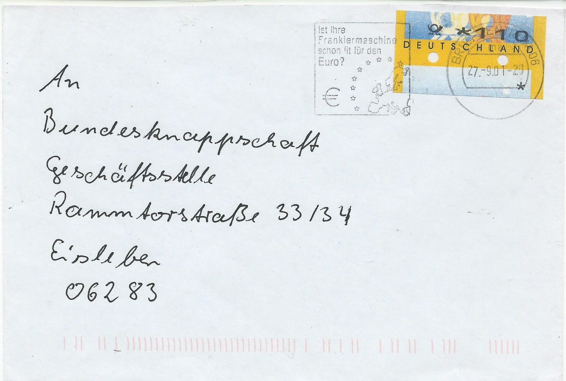 Die Automatenmarke Michel-Nummer 3 Typ 3 ist hier ziemlich unter die Räder gekommen und komplett verschnitten worden. Da war das Trennwerk im Automaten nicht richtig eingestellt und somit produzierte er diese Abarten. Hier ein Wert zu 110 Pf, gestempelt im Briefzentrum 06 am 27.9.01: