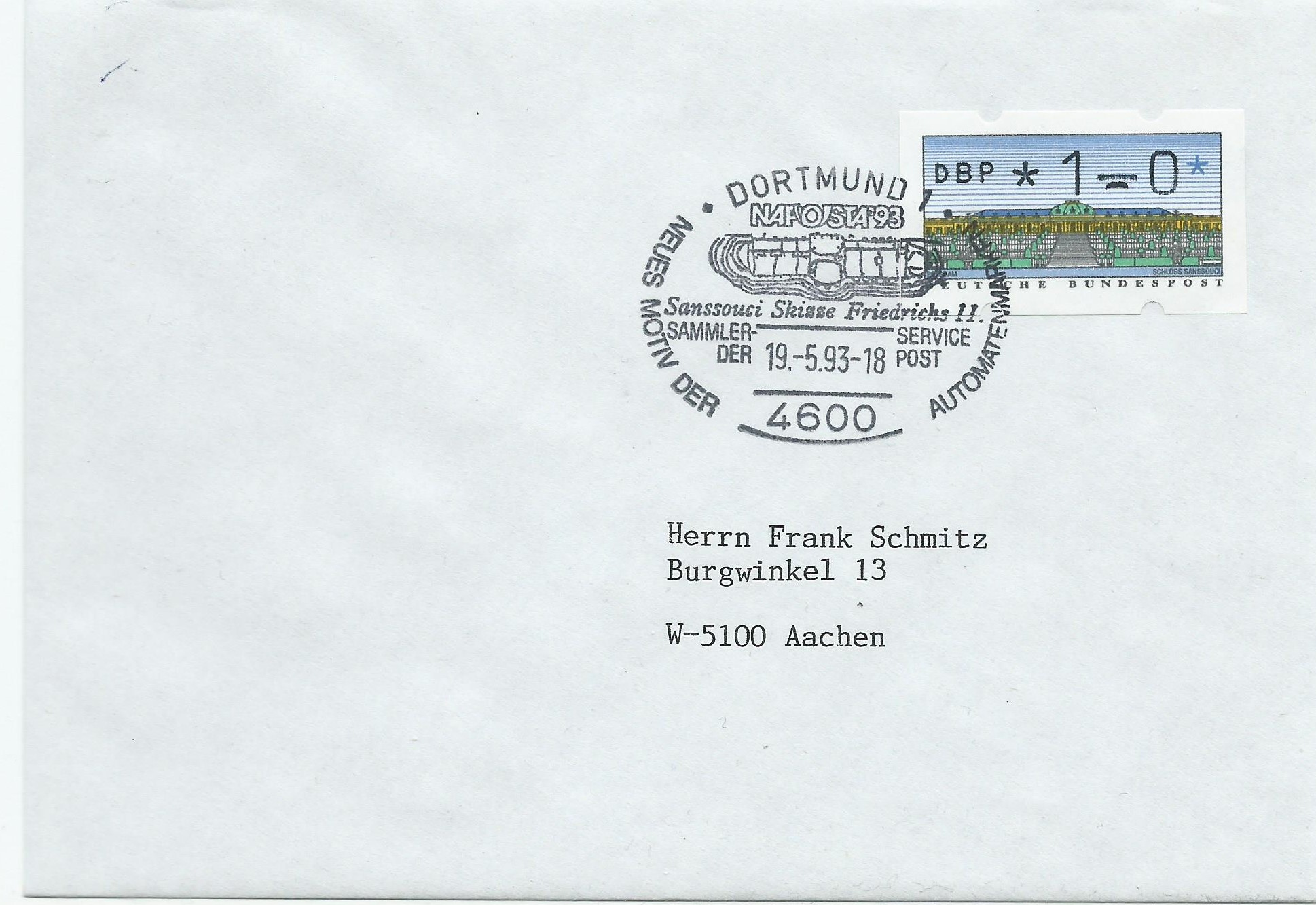 Und noch eine Automatenmarke Michel-Nummer 2 Typ 1. Hier ist im Werteindruck 100 (Pf) die mittlere Ziffer „nicht ganz“ sichtbar. Man erkennt noch unten den oberen Rand der 0 und dort, wo sie eigentlich stehen sollte, einen schwarzen waagerechten Balken. Solche Fehleinstellungen vom Werteindruck sind auch nicht gerade häufig anzutreffen und wenn man solche Belege günstig sieht, sollte man zuschlagen. Im Normalfall werden lose Marken um die 10 Euro aufwärts und Belege mit mindestens 20 Euro gehandelt. Gestempelt wurde der Beleg am 19.5.93 in Dortmund mit einem Sonderstempel.