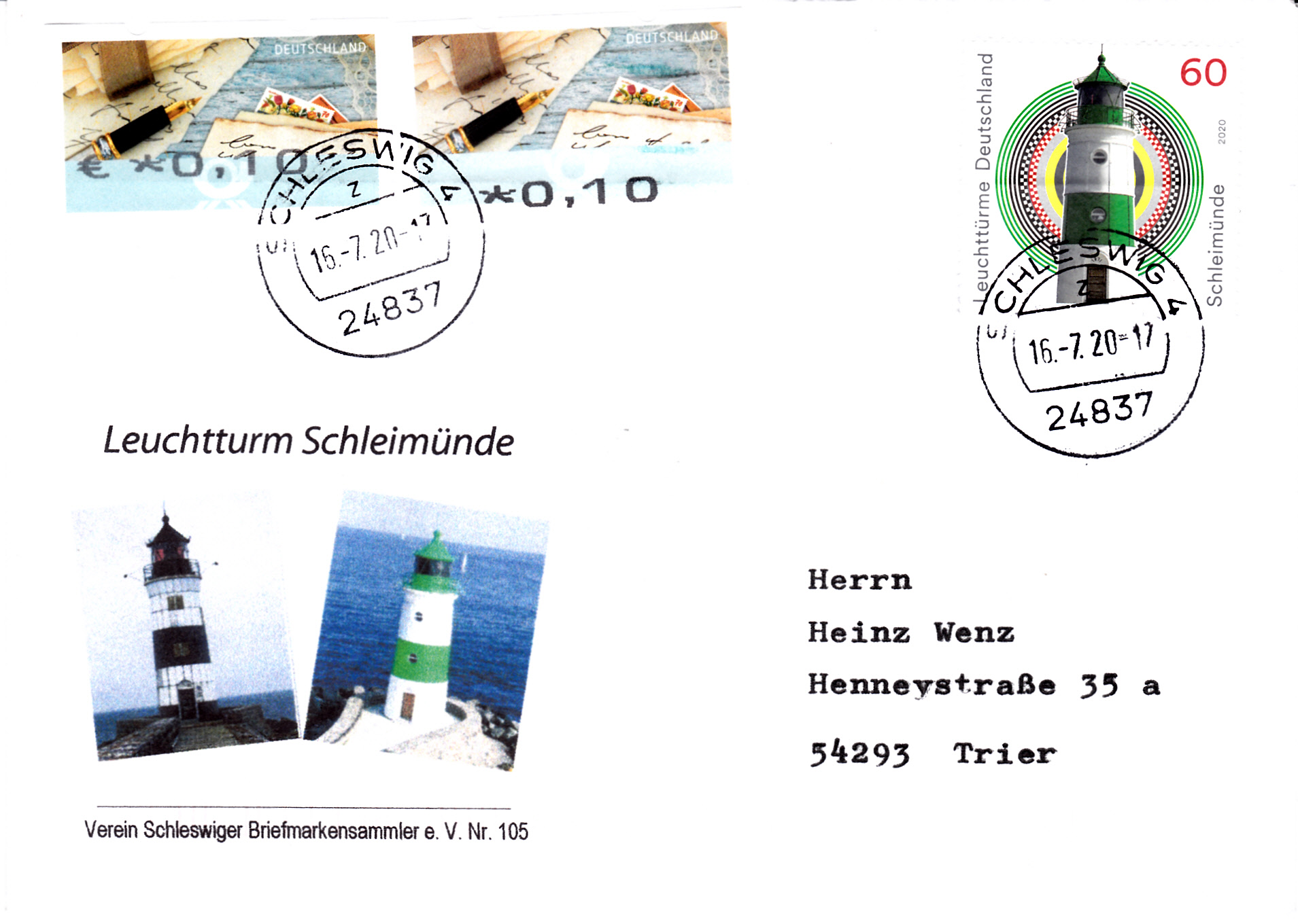 Auf diesem Brief von Schleswig nach Trier kleben auch zwei Automatenmarken zu je 10 Cent im Muster "Schreibutensilien und Briefmarken" (MiNr 8). Bei der linken Marke handelt es sich um eine Marke mit dem €-Zeichen (MiNr 8 FII). Die Werteindruck sind einmal etwas zu hoch und einmal etwas zu tief gedruckt.
