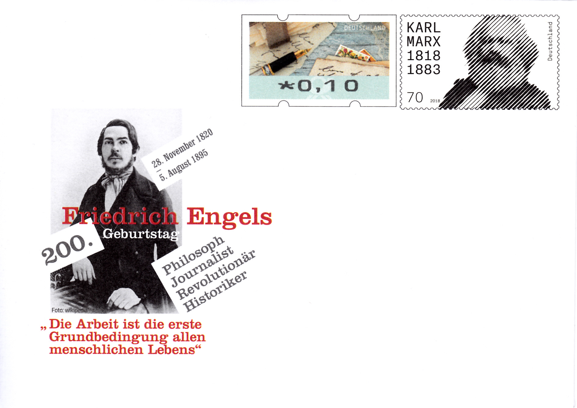 Zum 200. Geburtstag von Friedrich Engels erschien 2020 eine Gedenkganzsache mit dem Wertstempel der Marke zum 200. Geburtstag von Karl Marx und einer 10-Cent Automatenmarke.