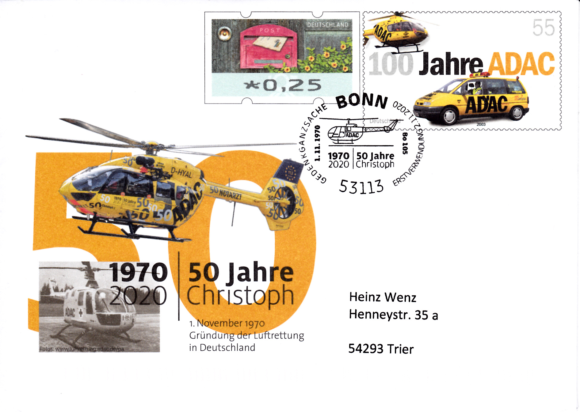 Diese Gedenkganzsache "50 Jahre Christoph" hat einen Wertstempel im Muster der Marke "100 Jahre ADAC" und einer Automatenmarke zu 25 Cent.