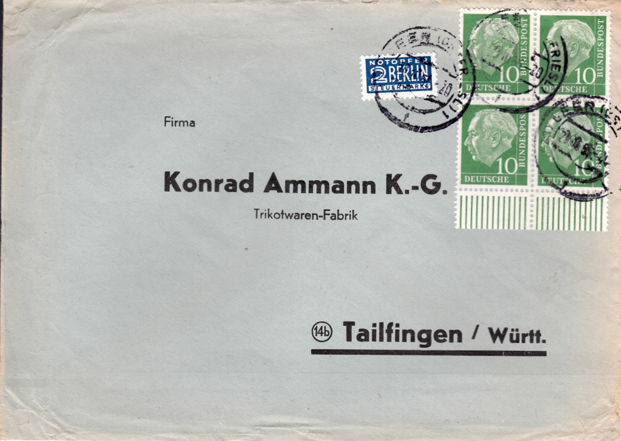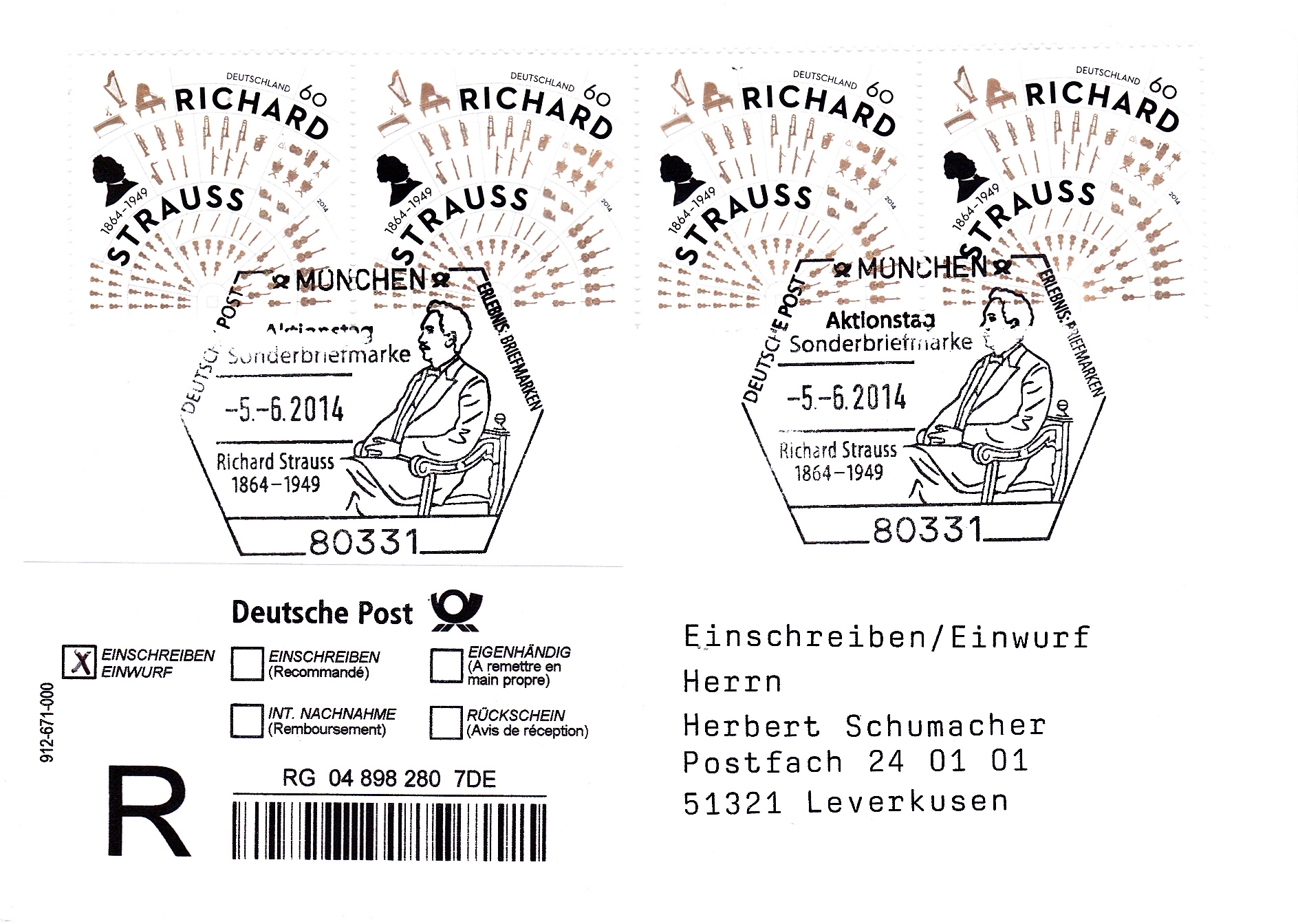 Brief als Einschreiben-Einwurf mit vier Marken zum 150. Geburtstag von Richard Strauss (MiNr 3086) und dem Ersttagsonderstempel vom 5.6.2014 aus Bonn. Das Porto berechnet sich aus Brief bis 20 Gramm 60 Cent, die Zusatzleistung Einwurf-Einschreiben 180 Cent, zusammen also 240 Cent.