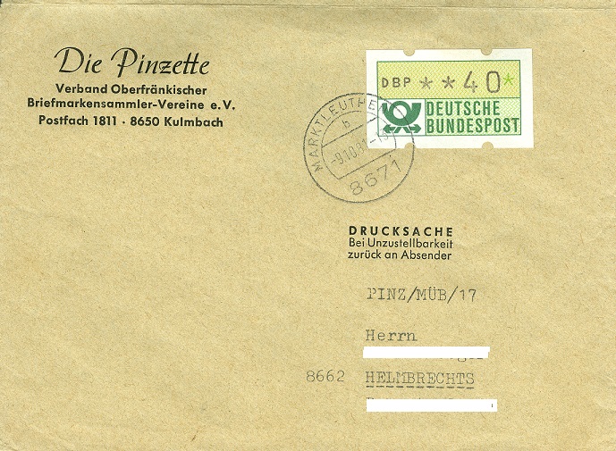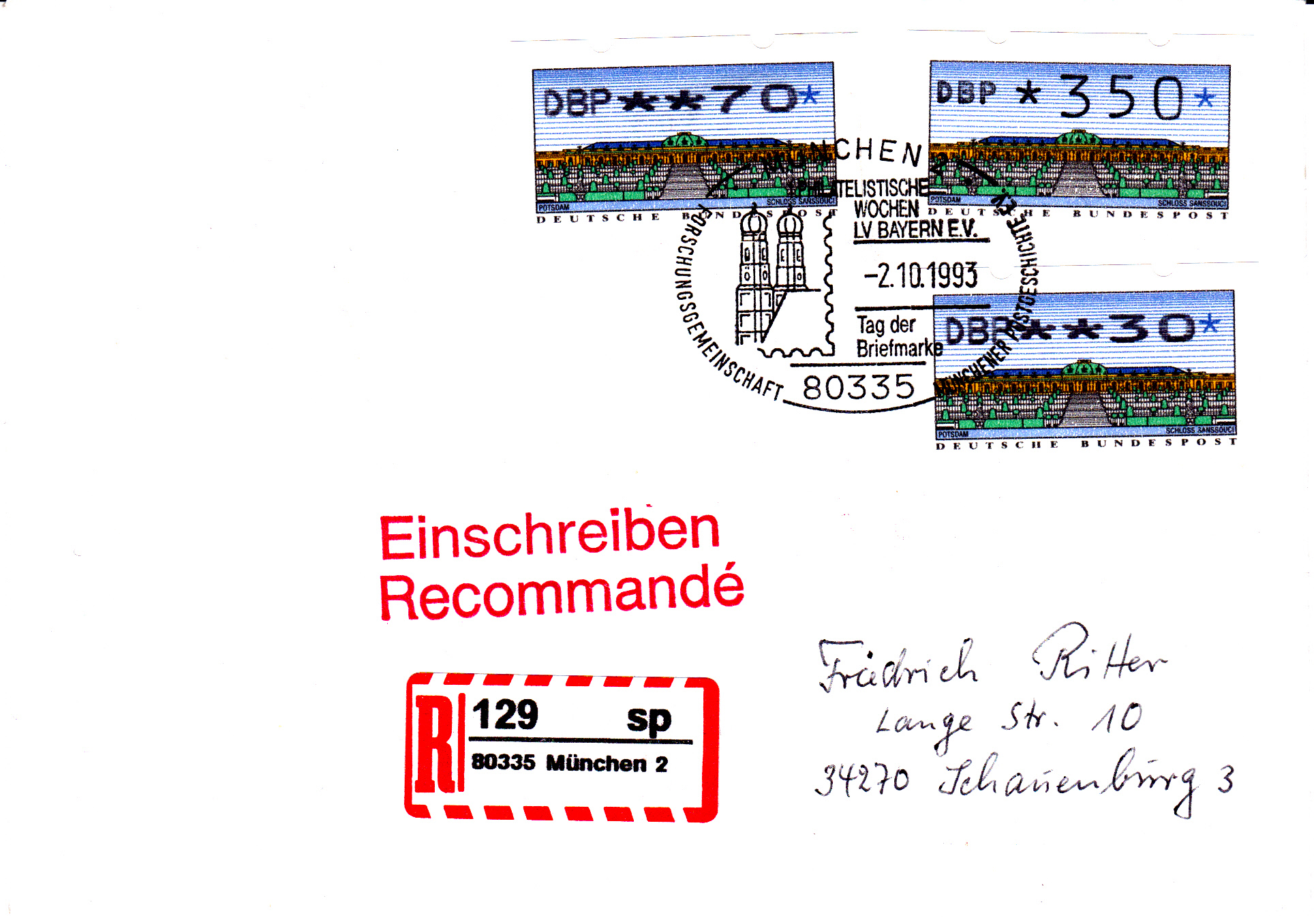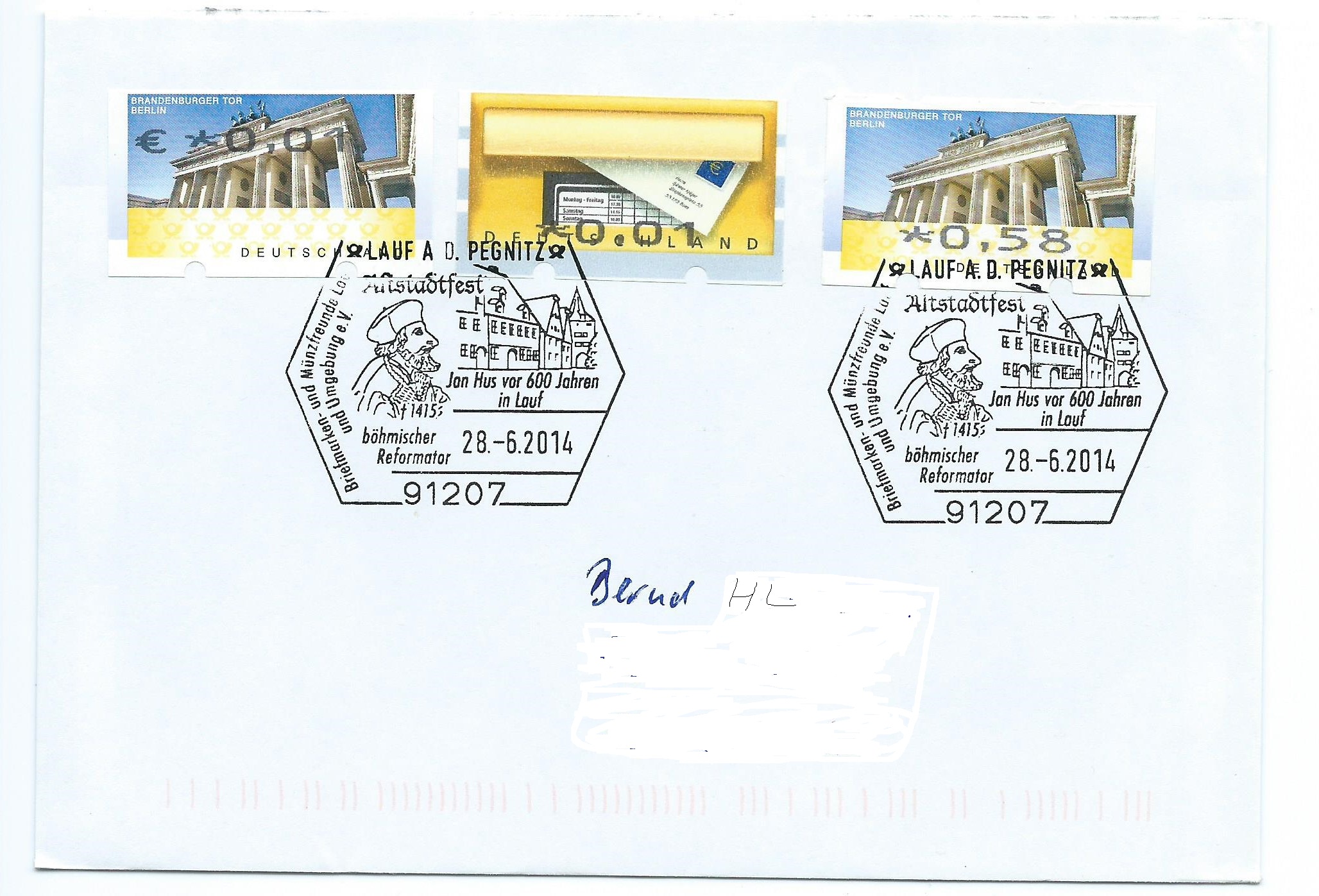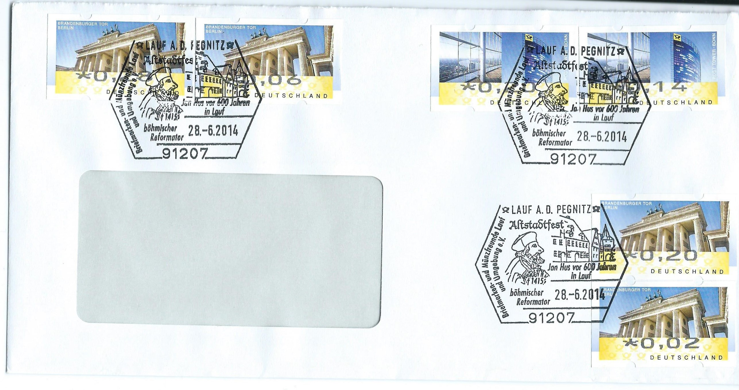 Hier einmal eine Spielerei, die mit Automatenmarken immer gut möglich ist: Ein "Datumsbrief". Das Datum vom Sonderstempel der Veranstaltung in Lauf an der Pegnitz am 28.06.2014 wurde mit 4 Werten zu 0,28, 0,06, 0,20 und 0,14 € dargestellt, zur portorichtigkeit kamen unten noch die Werte zu 0,20 und 0,02 € dazu. Es müssen ja schliesslich 60 ct Porto verklebt sein, sonst hätte die Post den Beleg nicht befördert. Mit den Wunschwerten der Automatenmarken kann man jedes beliebige Datum zusammenstellen, gerade für Sonderstempel oder z. B. Geburtstagsgrüsse immer ein kleiner Frankaturgag