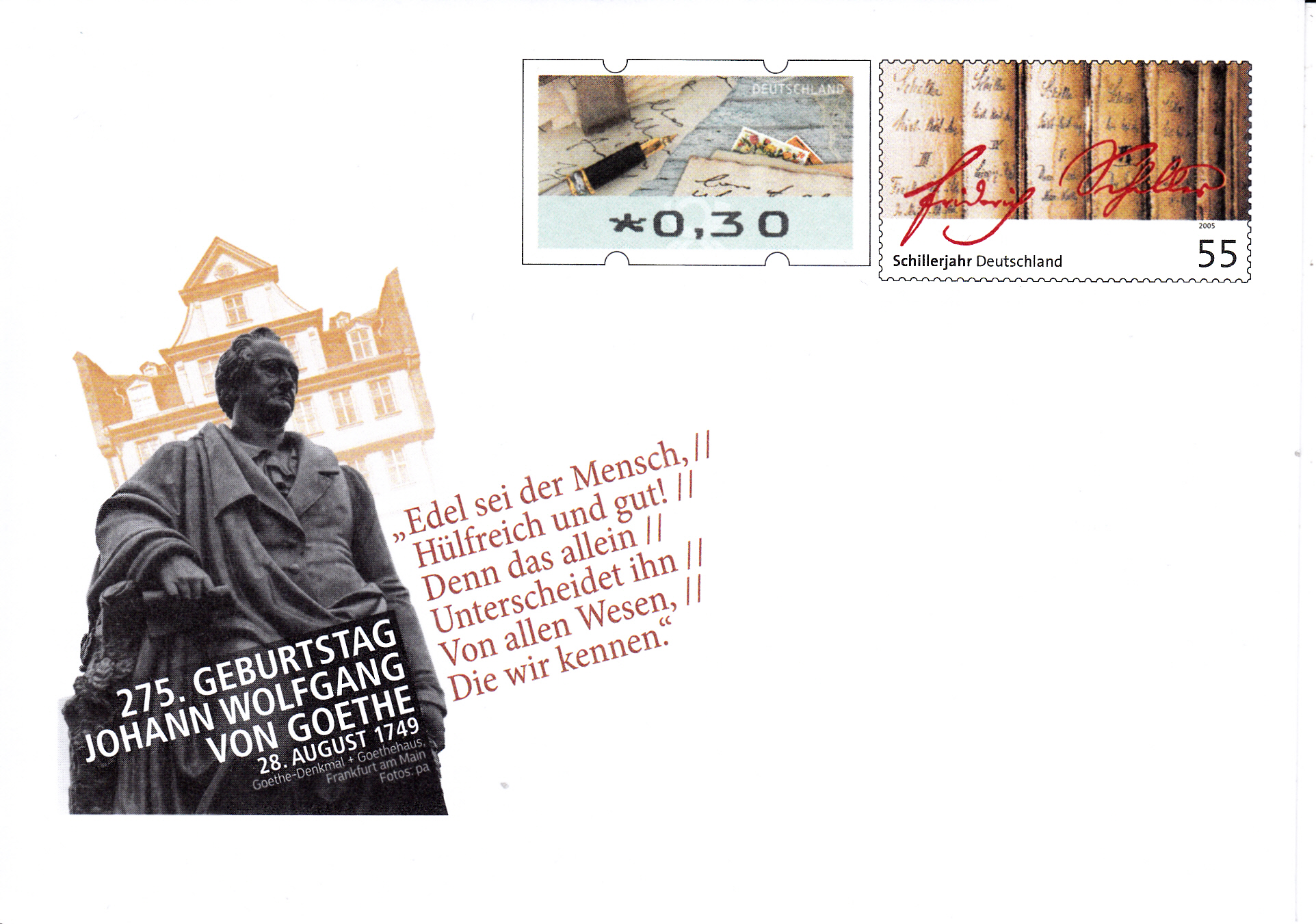 Zum 275. Geburtstag von Johann Wolfgang von Goethe erschien ein Ganzsachen-Sonderumschlag mit einem Wertstempel in der Zeichnung der Marke zum "Schillerjahr" aus dem Jahre 2005 (MiNr 2461) und einer Automatenmarke zu 0,30€.