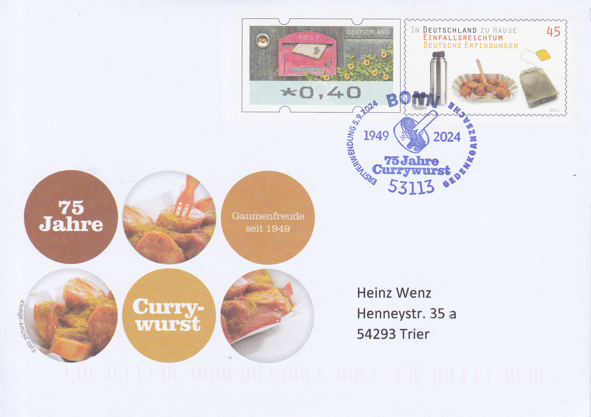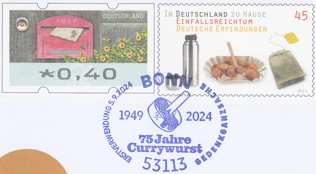 Zum Jubiläum "75 Jahre Currywurst" erschien bei der Deutschen Post ein Gedenkumschlag mit je einem Wertstempel im Muster der Marke "In Deutschland zu Hause: Einfallsreichtum Deutsche Erfindungen" zu 45 Cent (MiNr 2891) und einer Automatenmarke zu 40 Cent. Hier zeige ich einen nicht verschickten Umschlag.