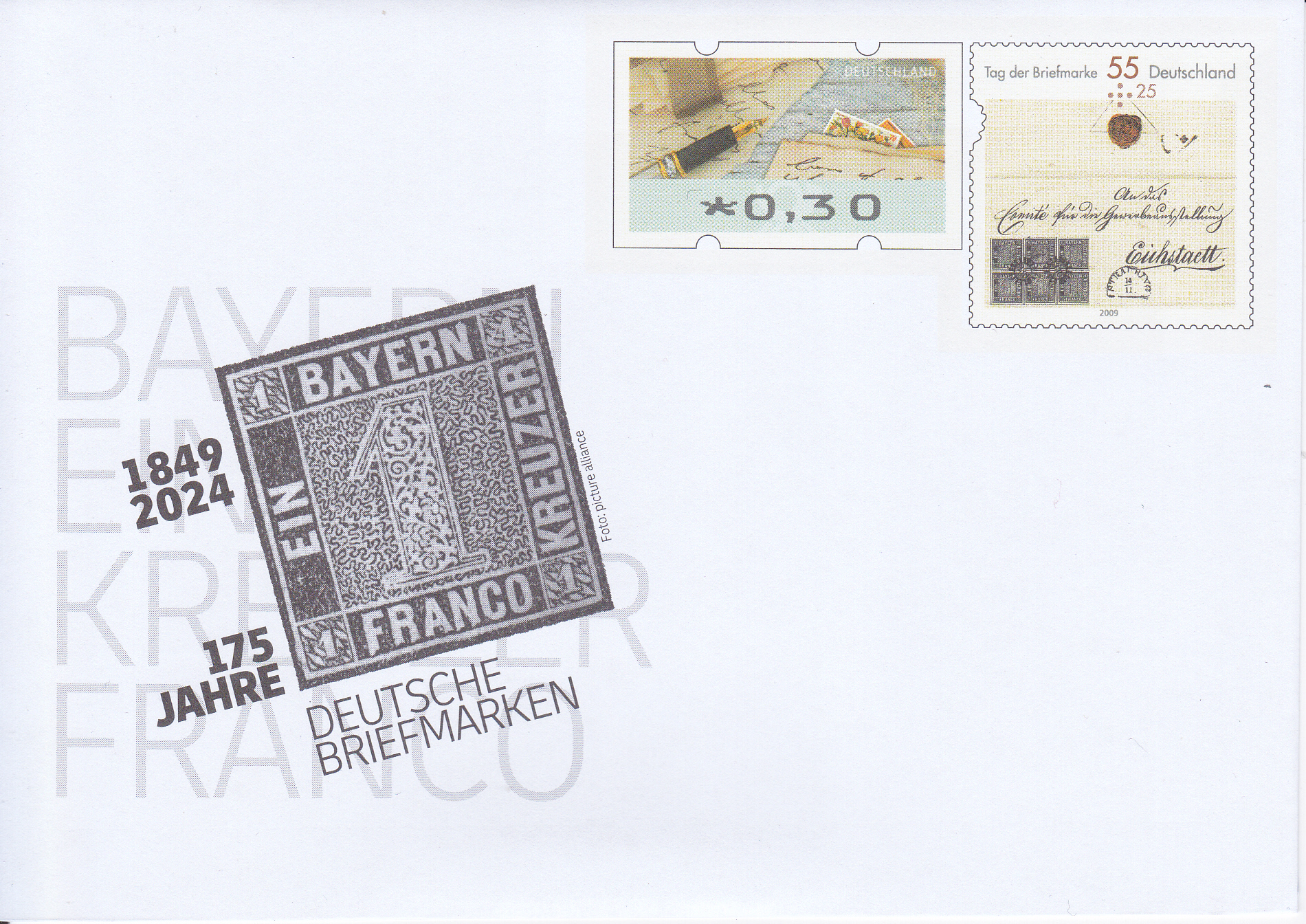 2024 wurde ein Ganzsachenumschlag "175 Jahre Deutsche Briefmarken" mit einem Wertstempel in der Zeichnung der Marke zum Tag der Briefmarke 2009 (MiNr 2735) und einer Automatenmarke zu 0,30€ verkauft. Hier zeige ich ein ungestempeltes Exemplar.