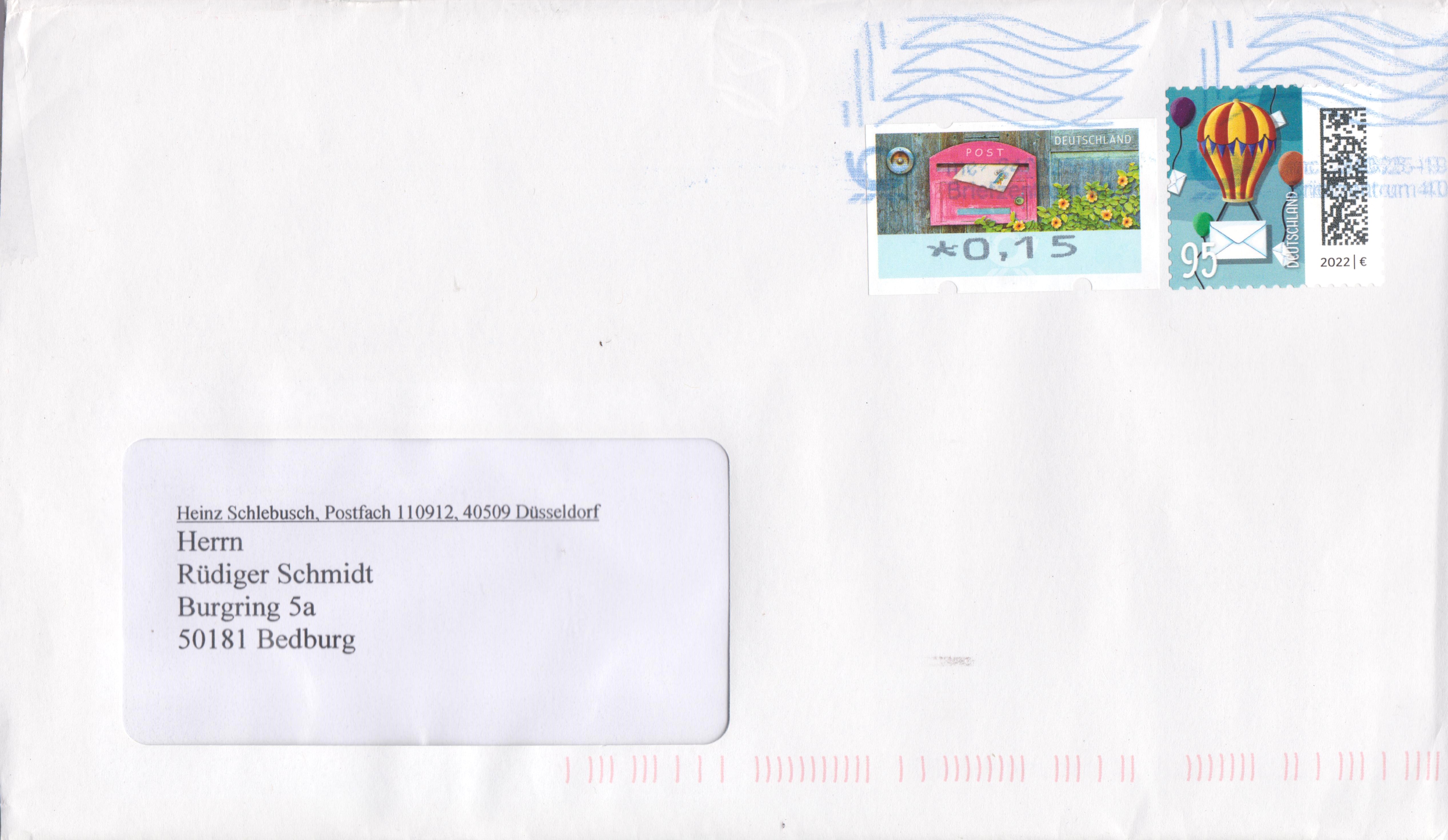 ATM MiNr. 9 der Wertstufe 0,15 (€) als Teil einer Mischfrankatur auf Brief der Portostufe 1,10 €: