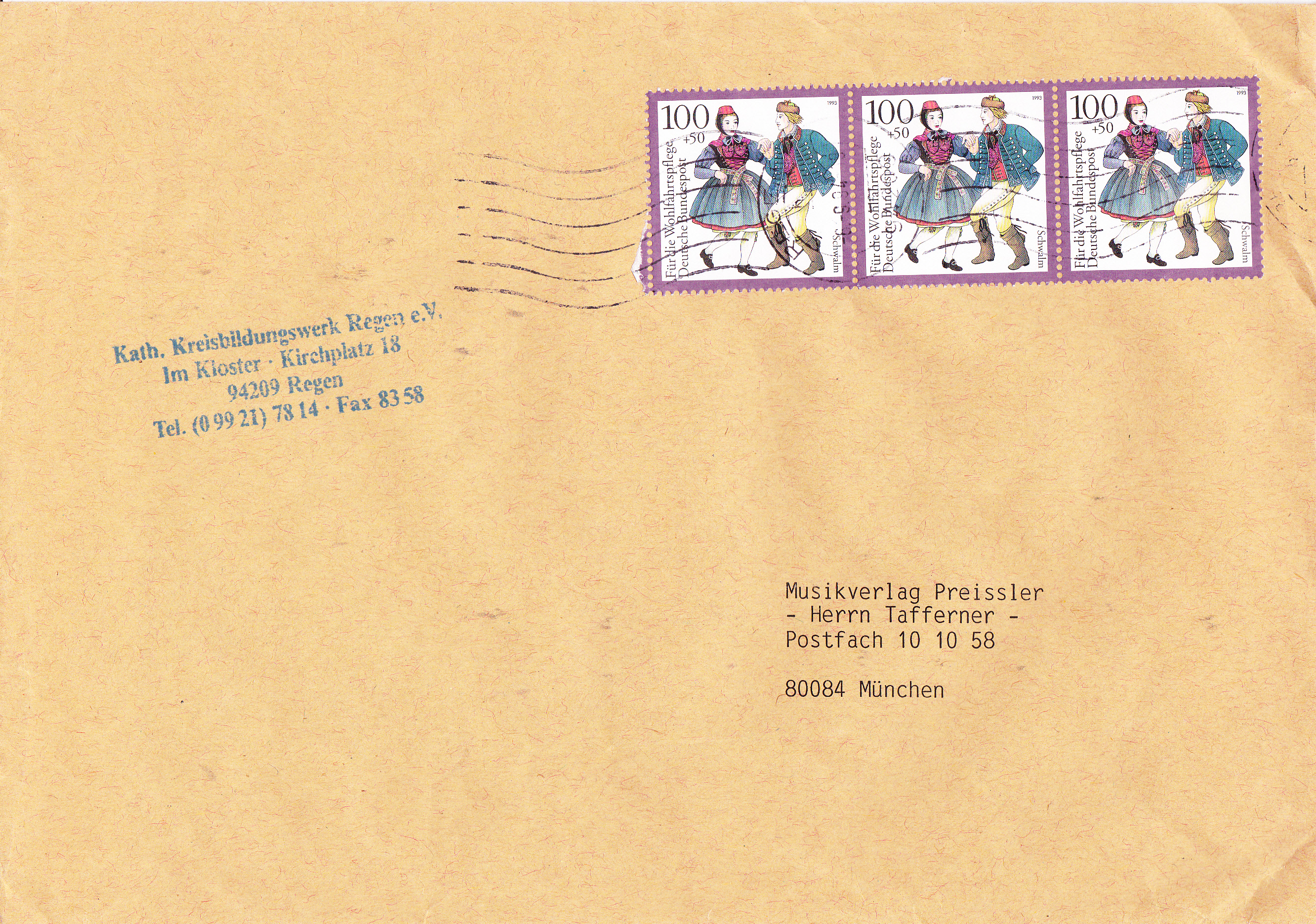 Zur portogerechten Frankatur dieses Wertbriefes wurden am 16.10.1992 sechs Marken des 170+80 Pf-Wertes der Wohlfahrtsmarken 1992 (MiNr 1635, Ersttag am 15.10.1992) benutzt. Das Porto betrug: Brief 51 bis 250 g 320 Pf, Wertangabe bis 500 DM 700 Pf, zusammen 1020 Pf.