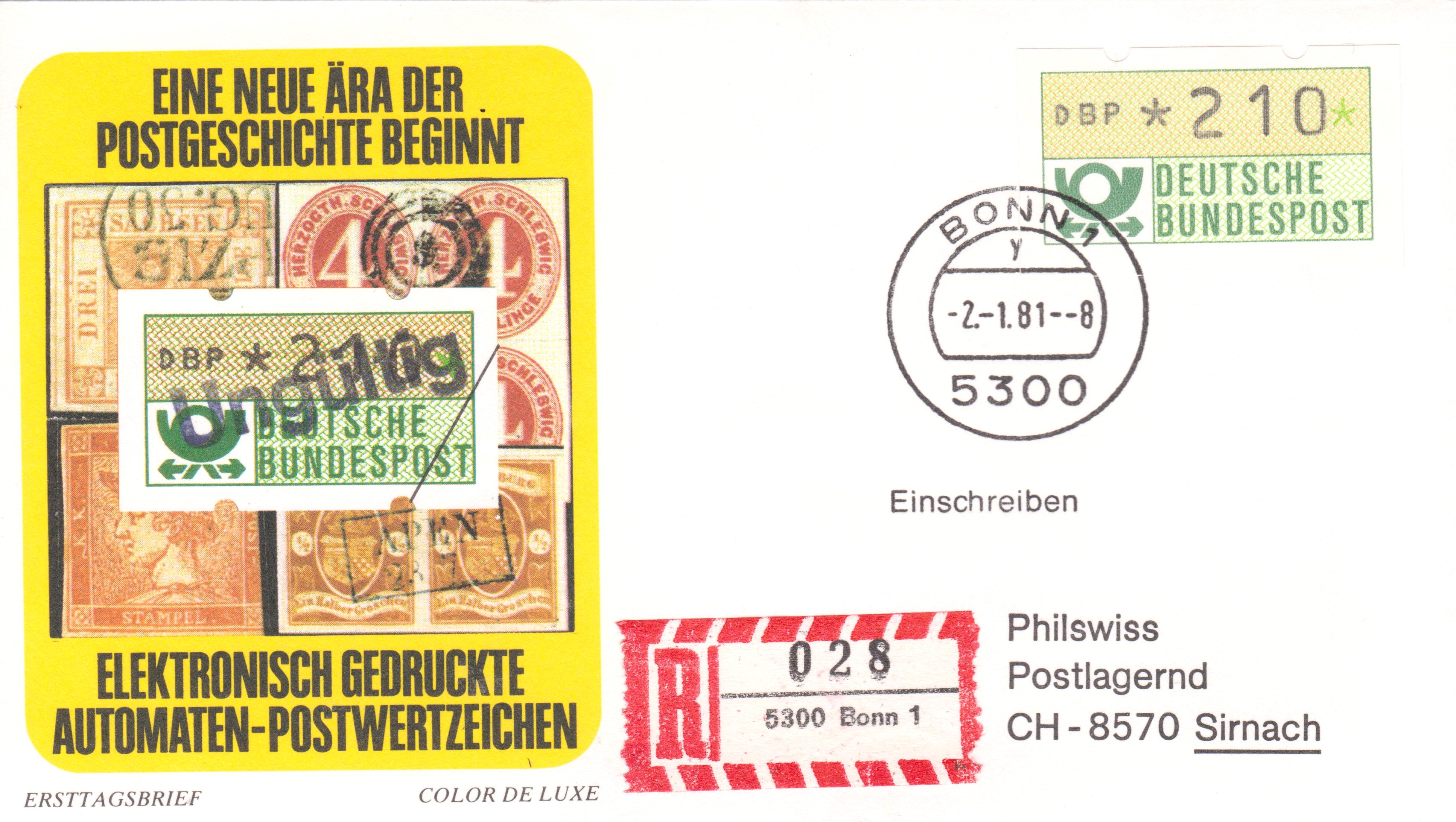 Mischfrankatur ATM MiNr. 1 hu, mit Werteindruck "DBP * 230" Pf sowie mit Werteindruck "DBP * 80" Pf am 02.01.1981 (= erster Gültigkeitstag der Automatenmarken) portogerecht auf Standardbrief in die Schweiz, 60 Pf, per Eilzustellung, 250 Pf: