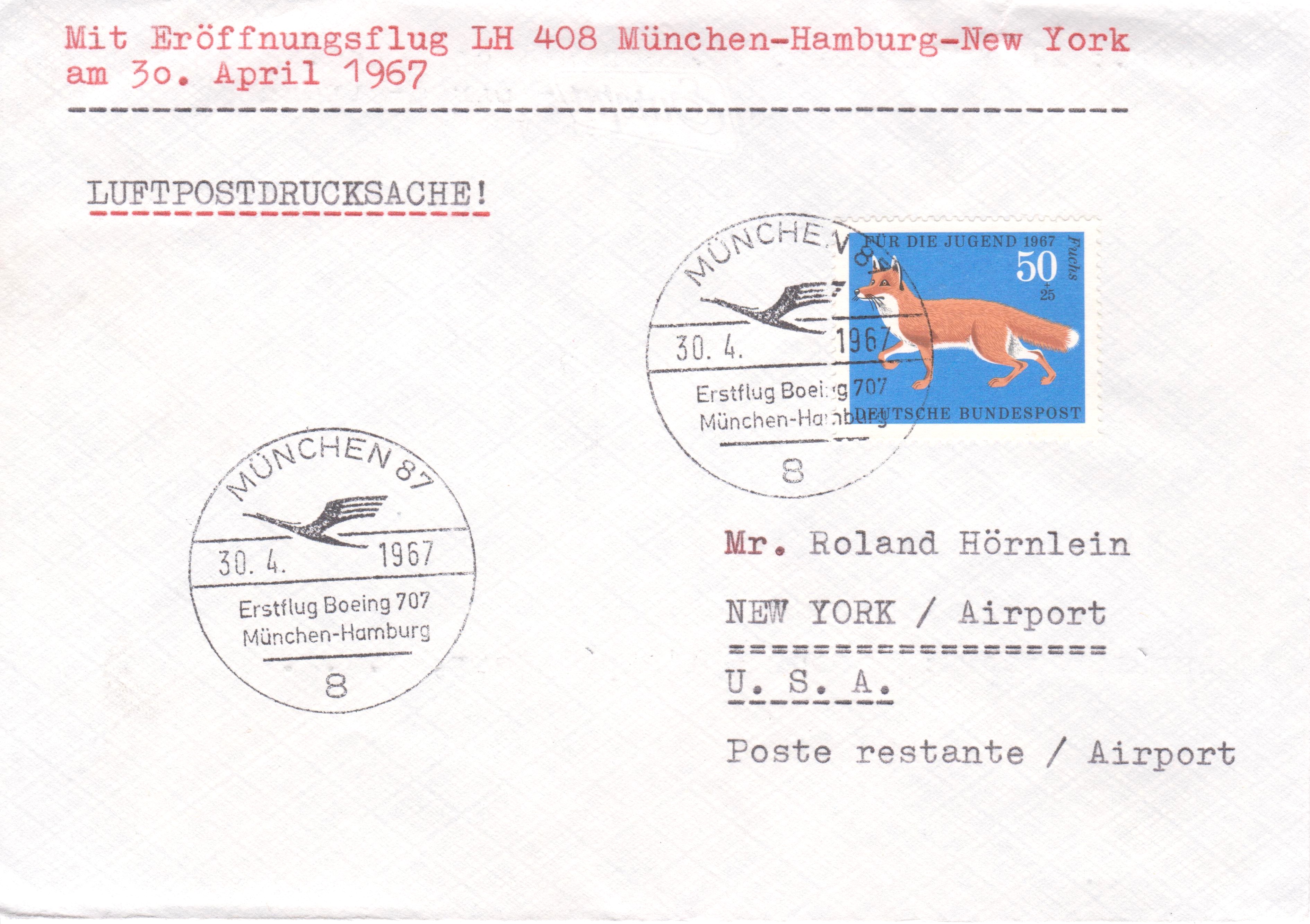 Dieser Beleg dokumentiert den ERSTFLUG LH 408 einer BOEING 707 am 30.04.1967 von München nach Hamburg: