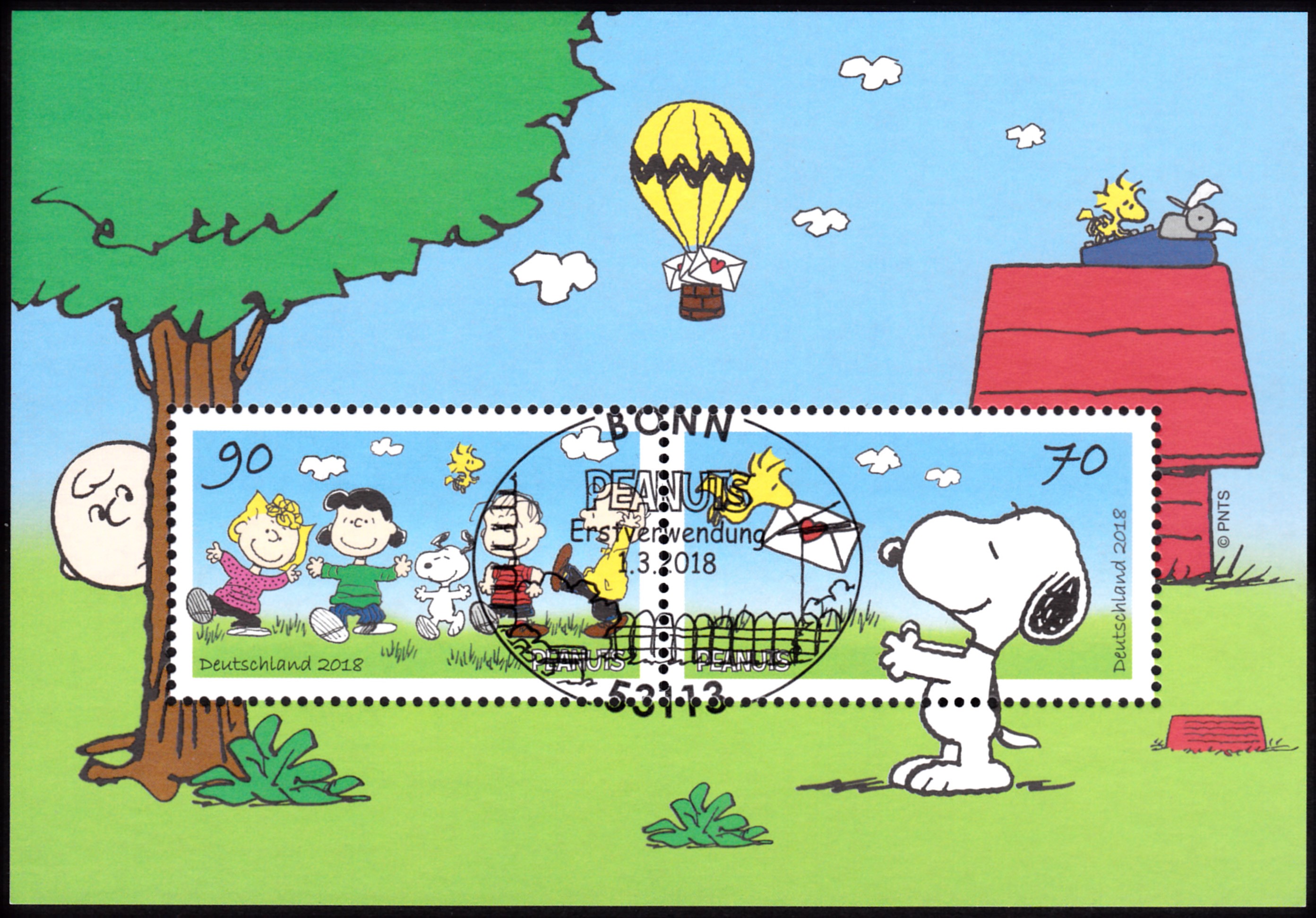Der Block 82 "Peanuts" erschien am 1.März 2018. Er enthält die beiden Marken MiNr 3369 mit dem Motiv "Woodstock überbringt Snoopy einen Liebesbrief" und MiNr 3370 mit der Peanuts-Rasselbande: Sally Brown, Lucy van Pelt, Snoopy, Woodstock, Linus van Pelt und Charlie Brown. Der gezeigte Block ist mit einem Erstverwendungsstempel entwertet. Dieser Block war nicht am "normalen Postschalter" erwerbbar, sondern nur über die Sonderpostfilialen der EB-Teams oder durch Bestellung in Weiden.