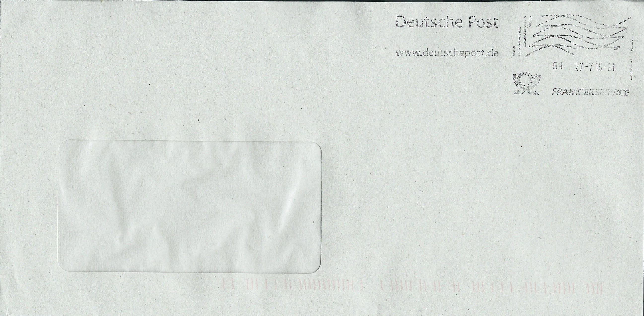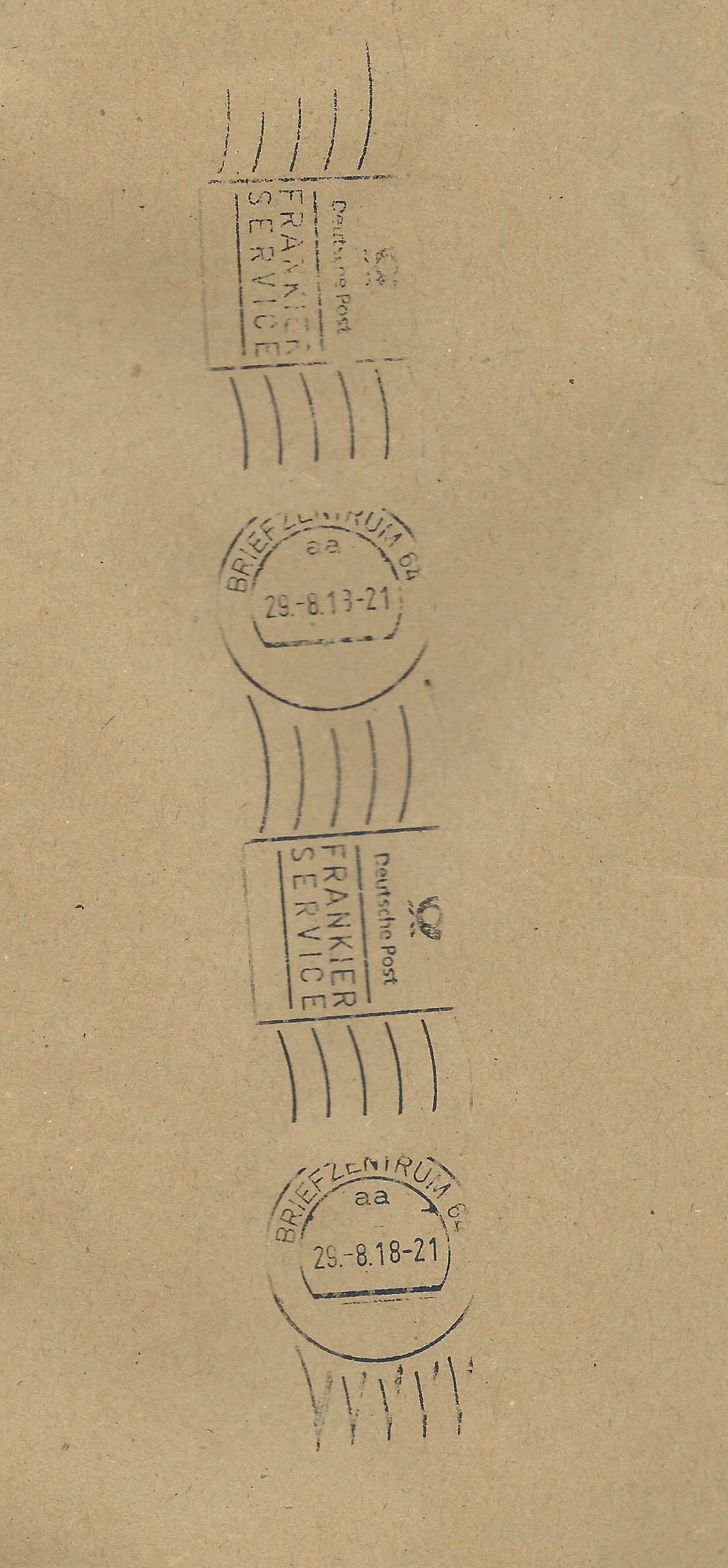 mein heutiger Neuzugang eines Frankier-Service-Stempels: Ein Handrollstempel aus dem Briefzentrum 64 vom 29.8.18. Auffällig ist hier, dass jeweils der obere Kopfteil des Rundstempels nicht ganz aufgedruckt ist, so als wenn der Stempel nicht richtig eingepasst wurde.