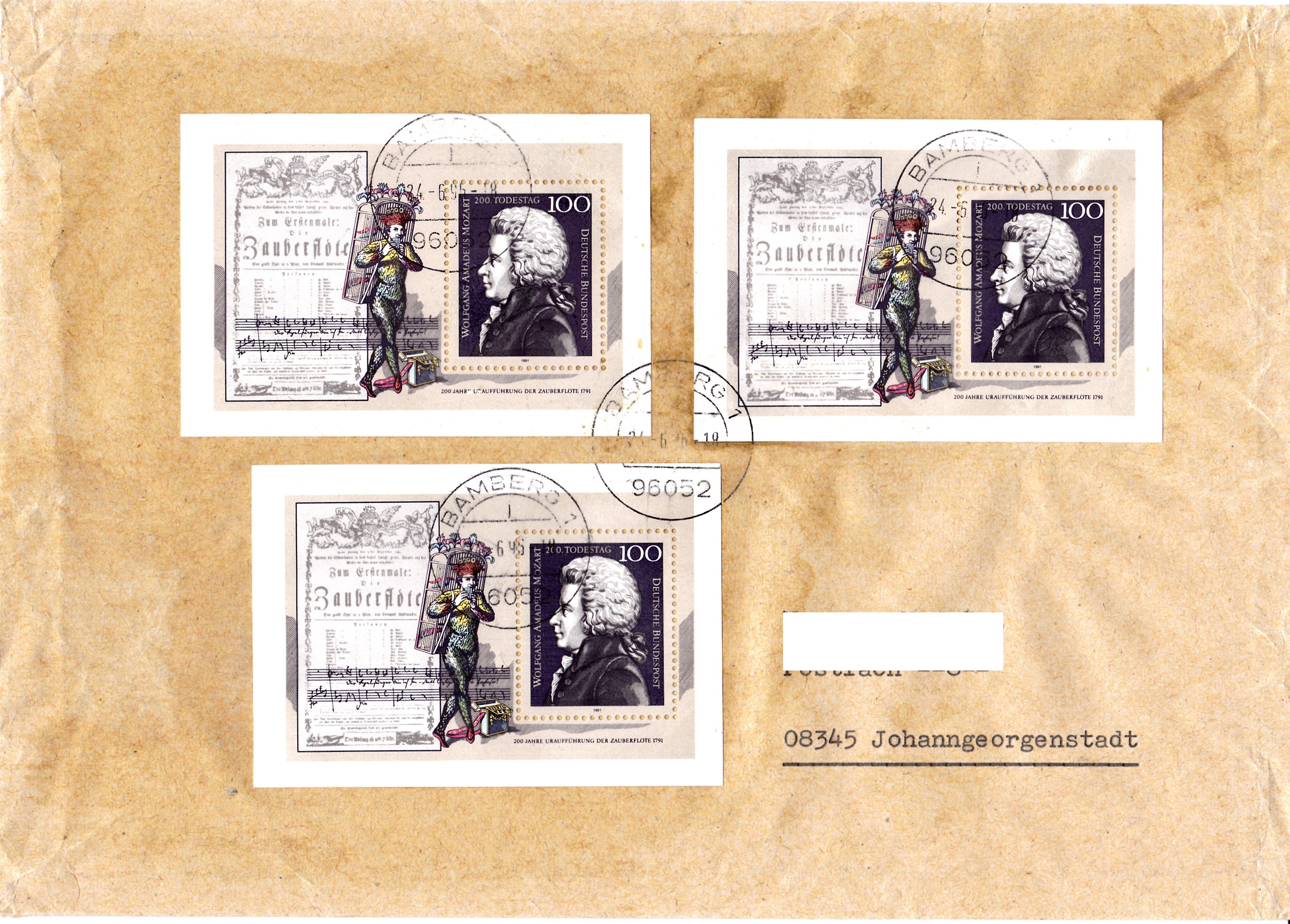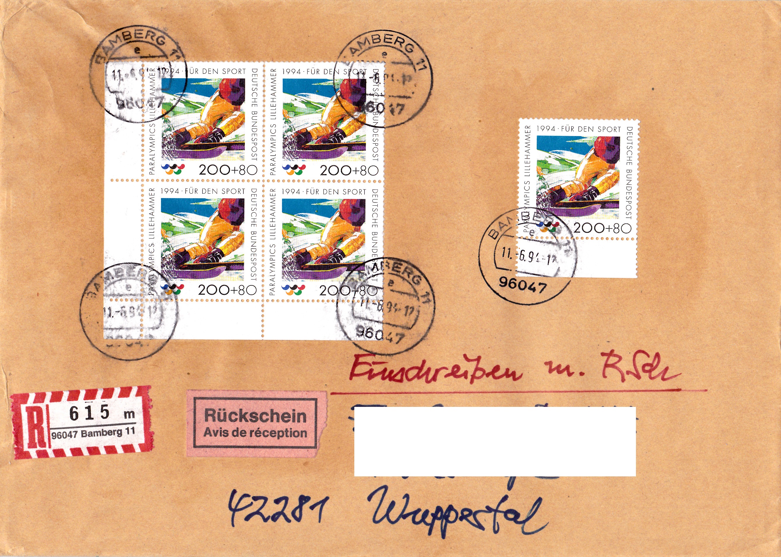 Vierblock vom linken unteren Bogenrand und eine weitere Marke vom unteren Bogenrand der 200+80 Pf-Marke der Sporthilfemarken von 1994 (MiNr 1720) auf einem Einschreibebrief mit Rückschein von Bamberg vom 11.6.1994 nach Wuppertal. Das Porto betrug: Brief 51 bis 500 g 300 Pf, Einschreiben 350 Pf, Rückschein 350 Pf, zusammen also 1000 Pf.