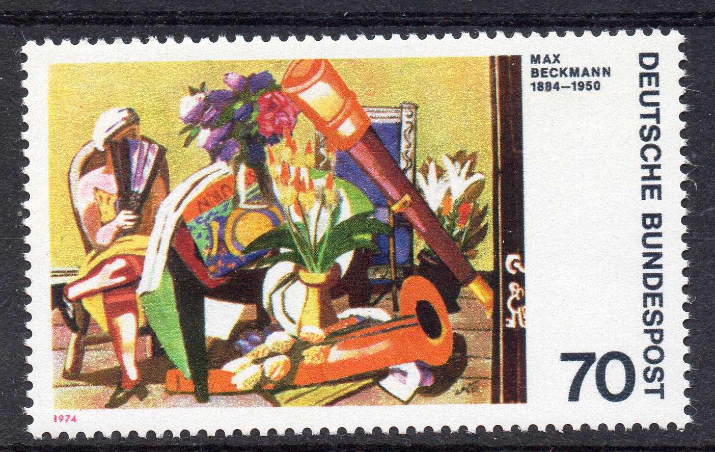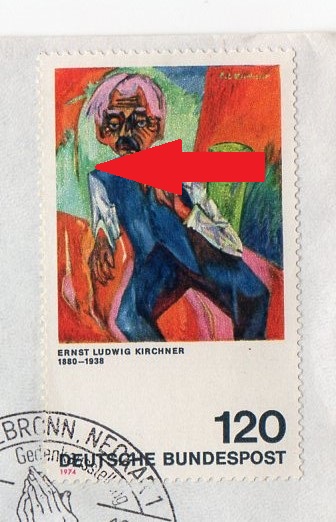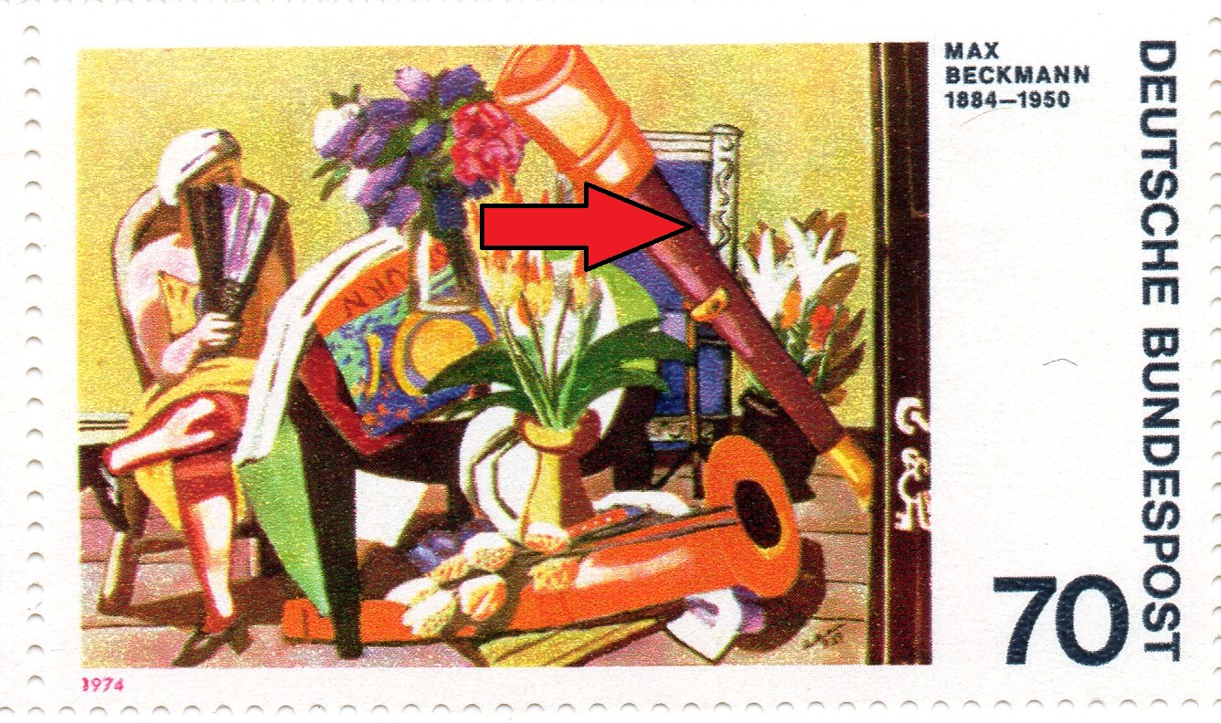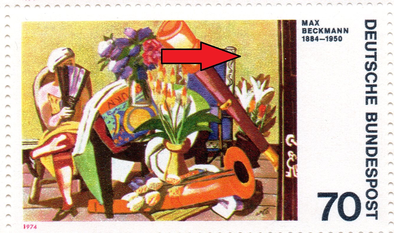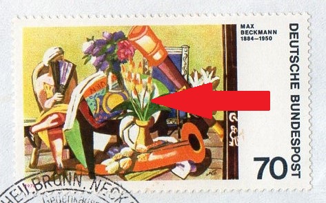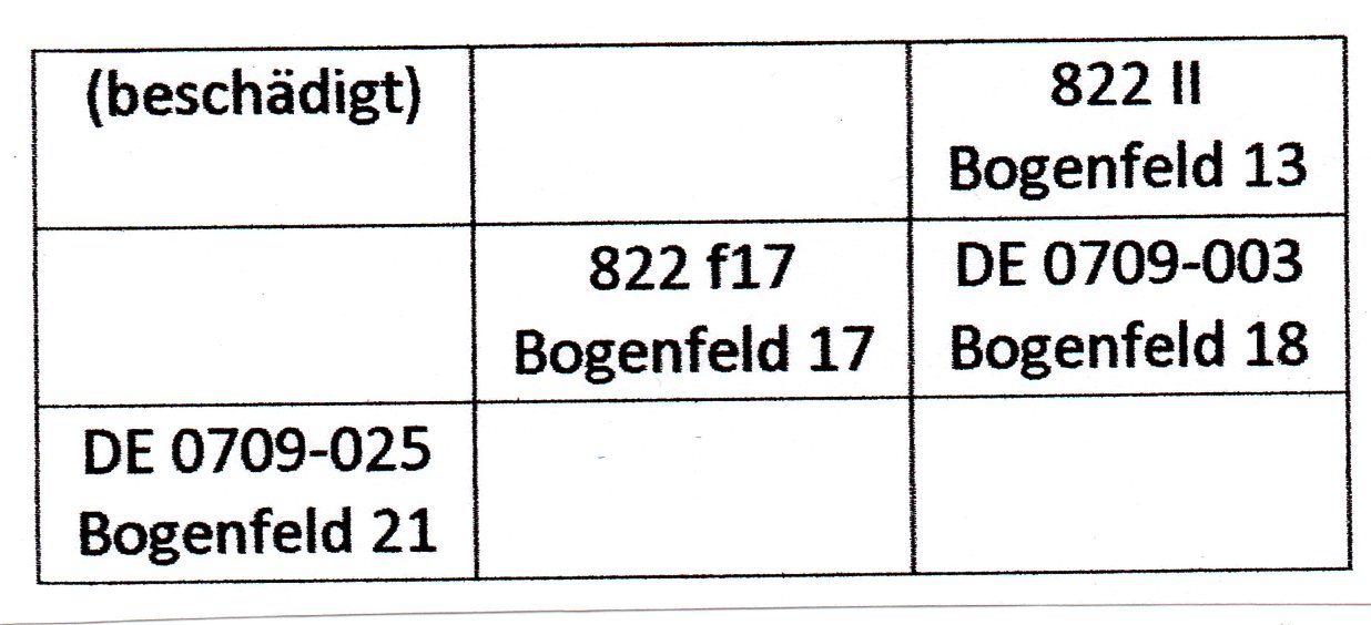 Der Plattenfehler 822 II auf Feld 13 ist weiter oben bereits gezeigt, deswegen geht es direkt weiter mit Plattenfehler 822 f17, "rosa Fleck zwischen Instrument und Stuhllehne"