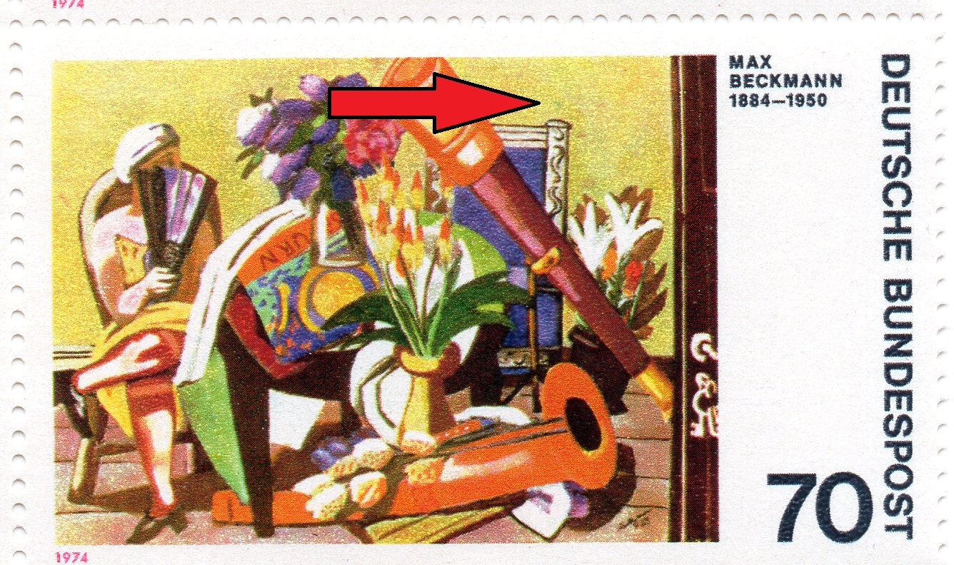 Als nächstes folgt Fehler DE0709-003 von Bogenfeld 18, "grüner Punkt im Gelb über der Stuhllehne", auffällig ist hier der ebenfalls stets vorhandene rote Strich neben der Stuhllehne!