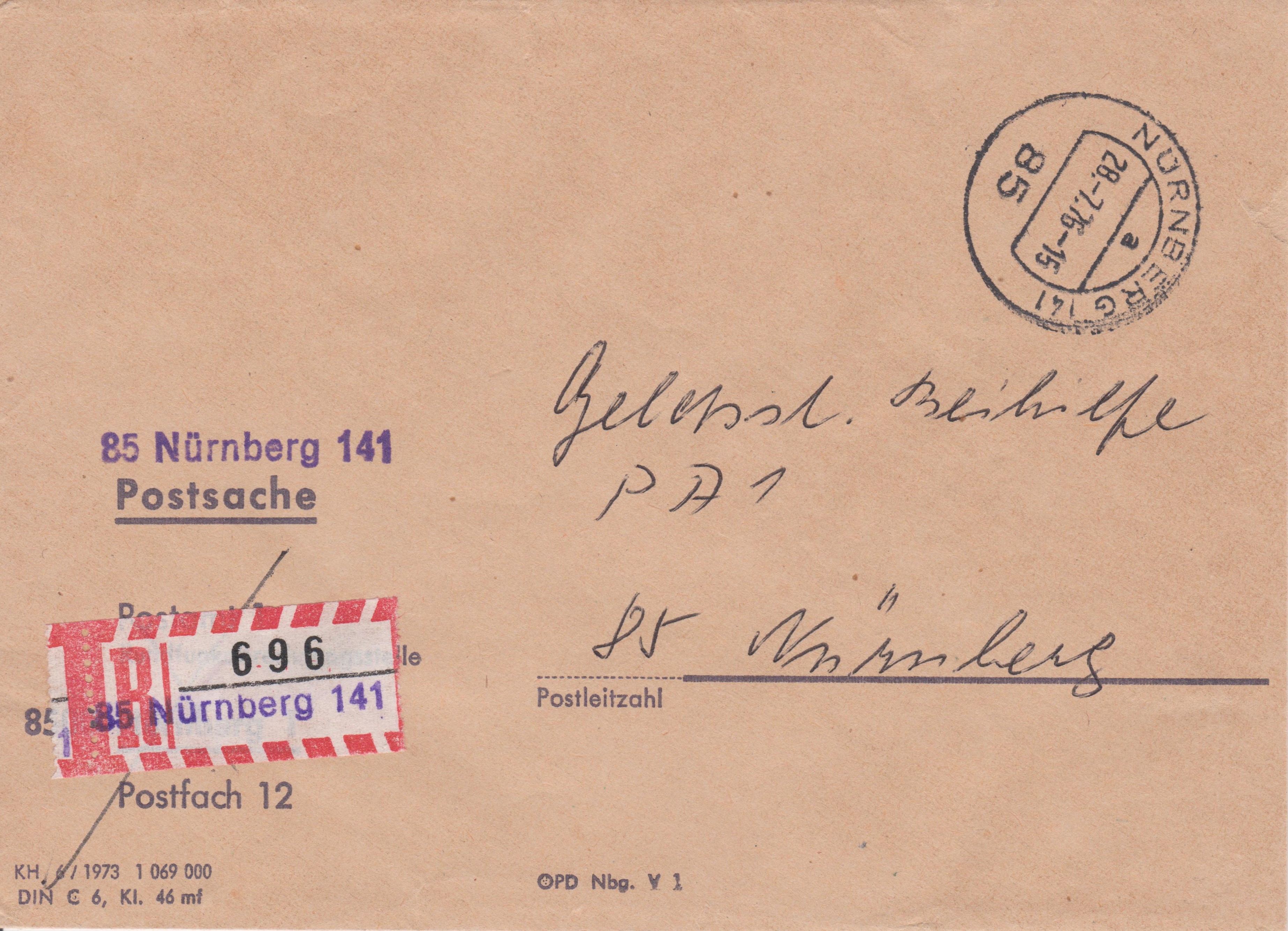 Postsache per Einschreiben, gesendet am 28.07.1976 ab 85 NÜRNBERG 141, adressiert an "PA 1 85 Nürnberg":