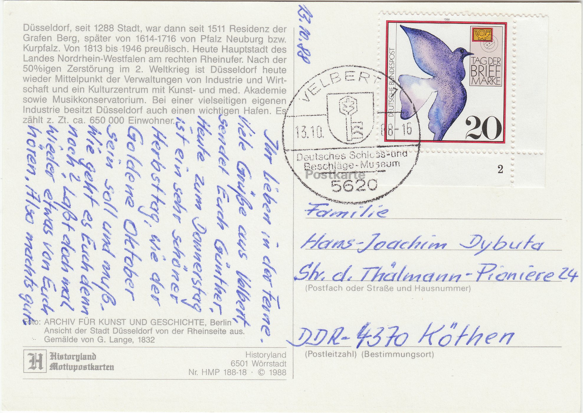 Den Anfang mache ich mit dieser Postkarte vom 13.10.1988 ab Velbert in die DDR: