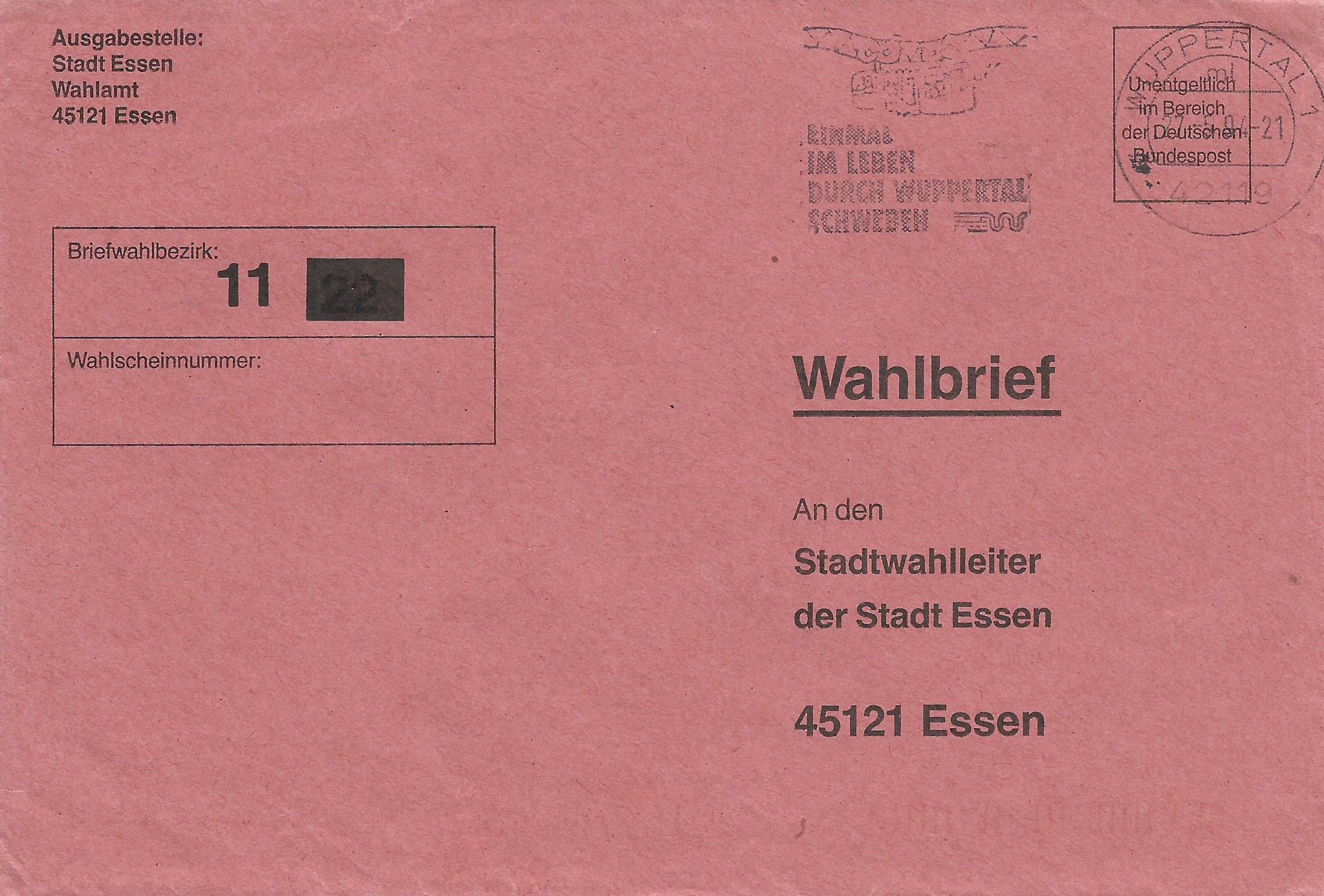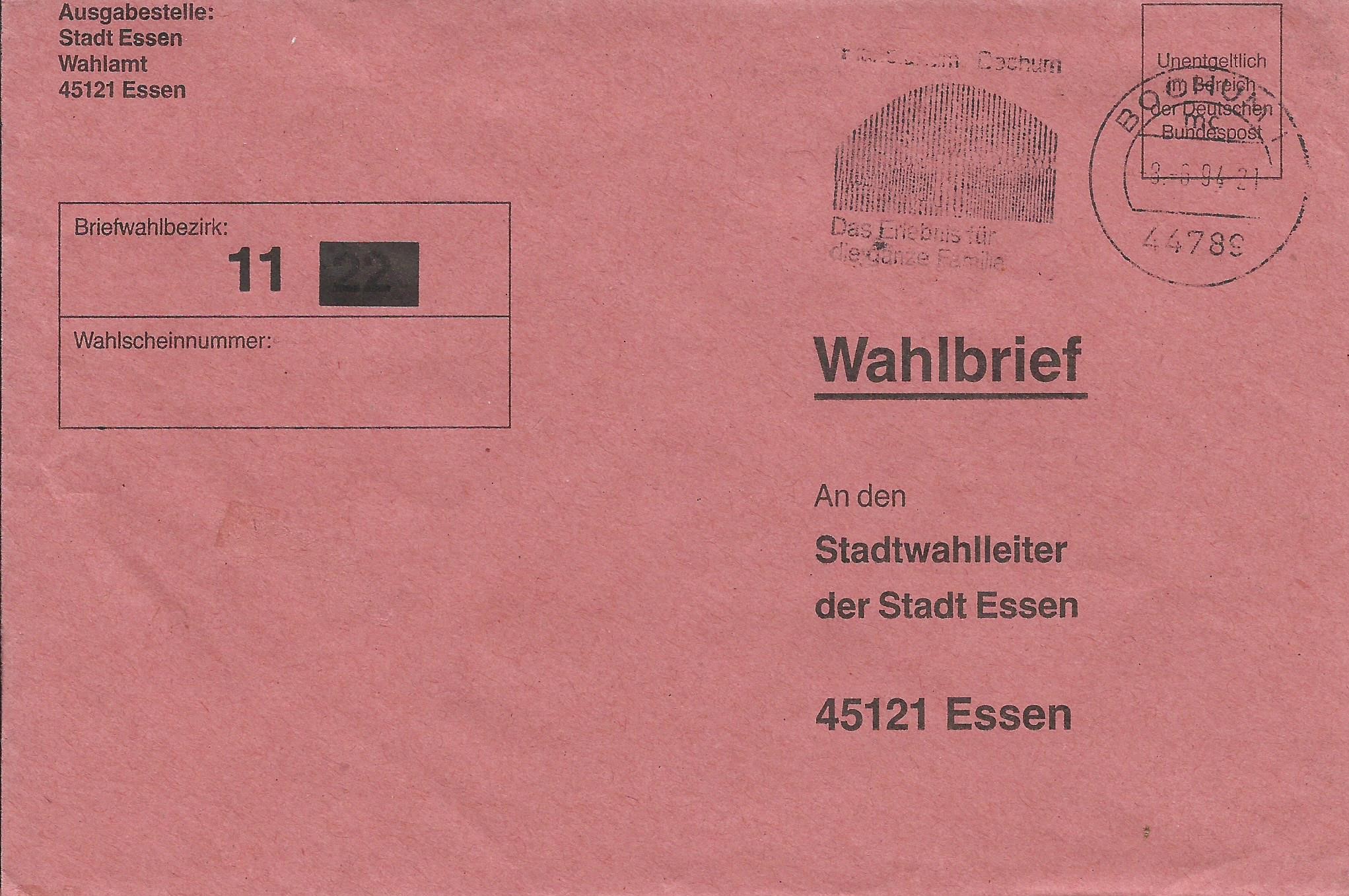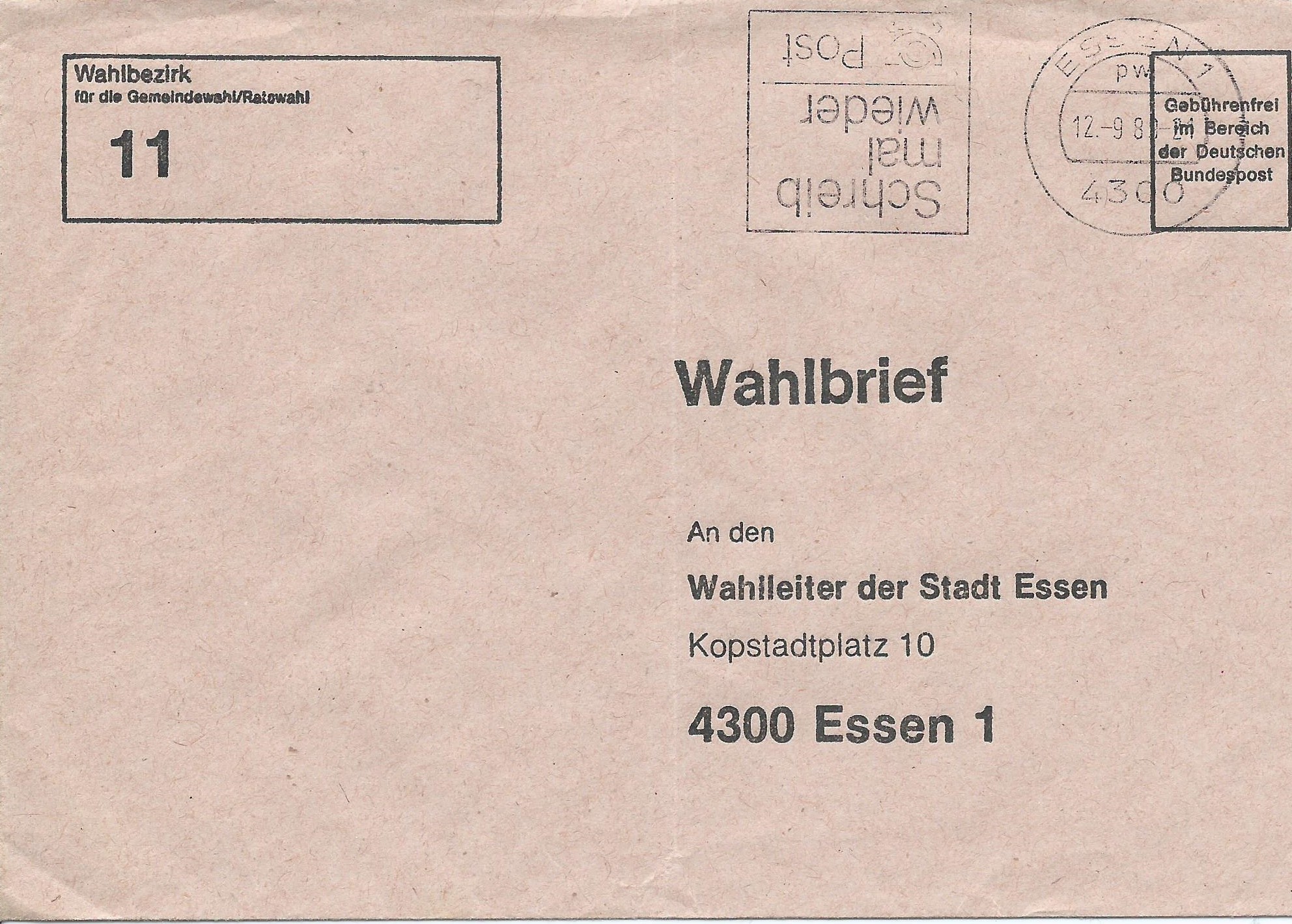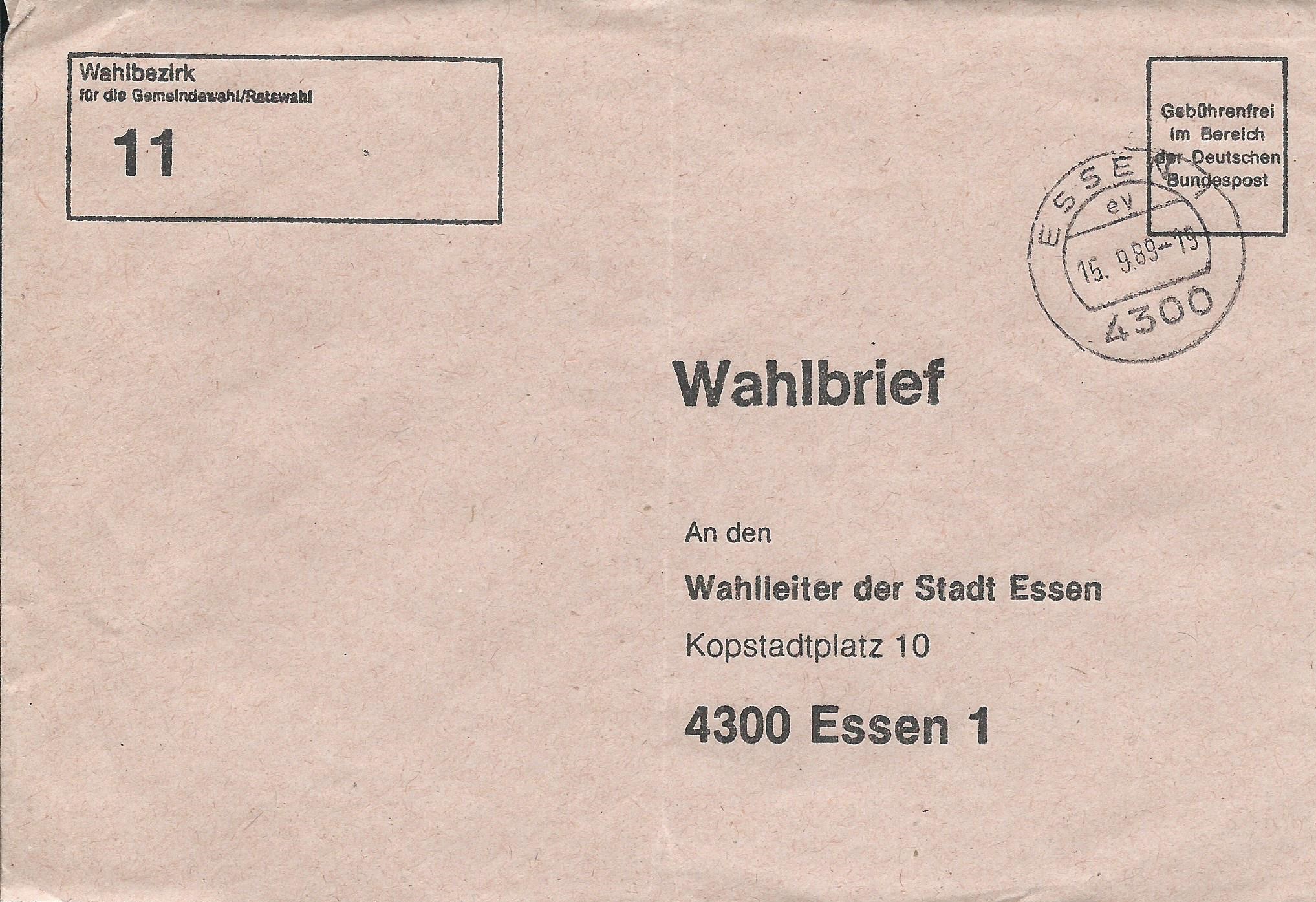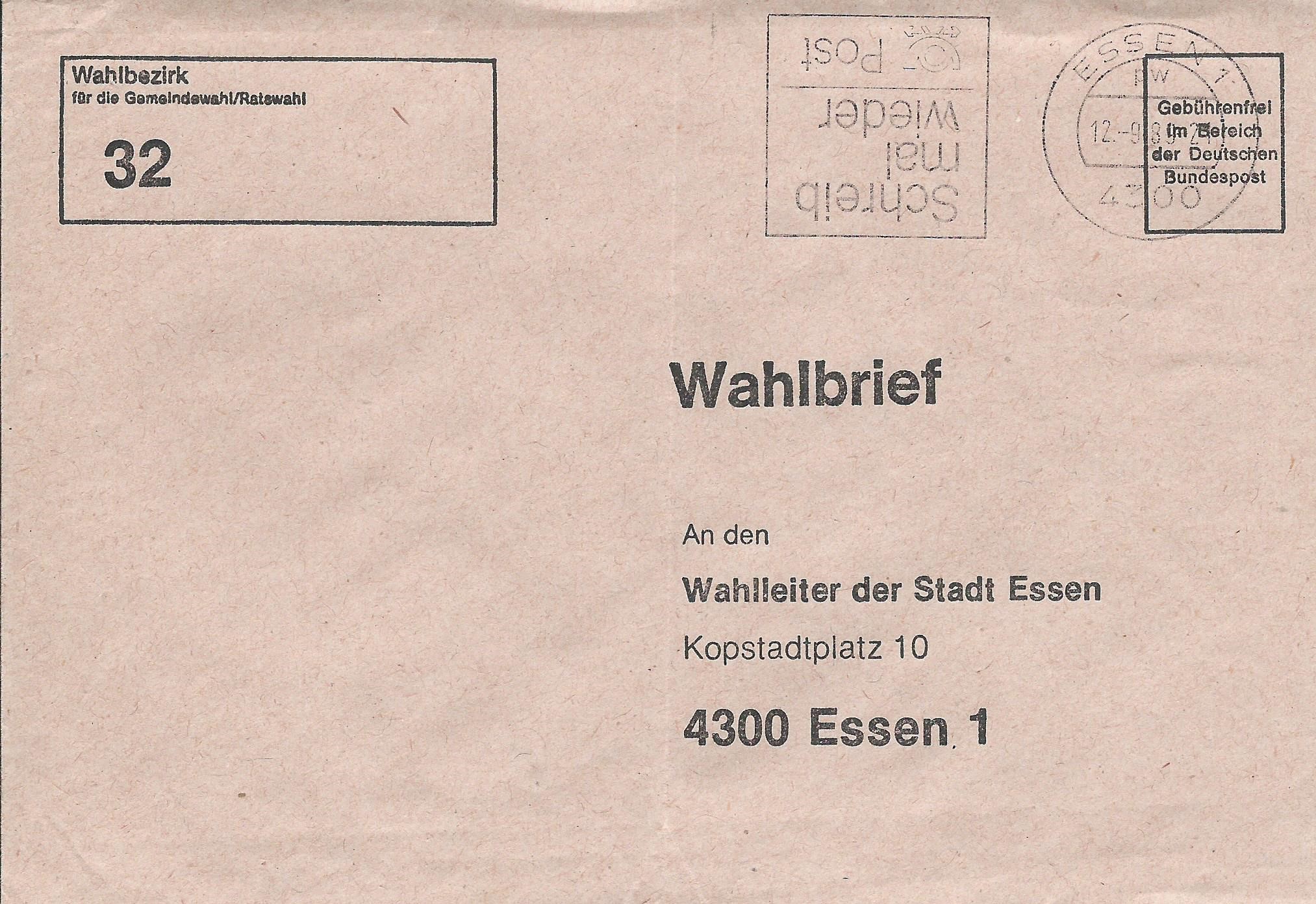 Los geht es mit einem Beleg, der in Essen am 12.9.89 mit der Maschine gestempelt wurde. Er ging an den Wahlbezirk 32. Besonders interessant ist der kopfstehende Werbeeinsatz!