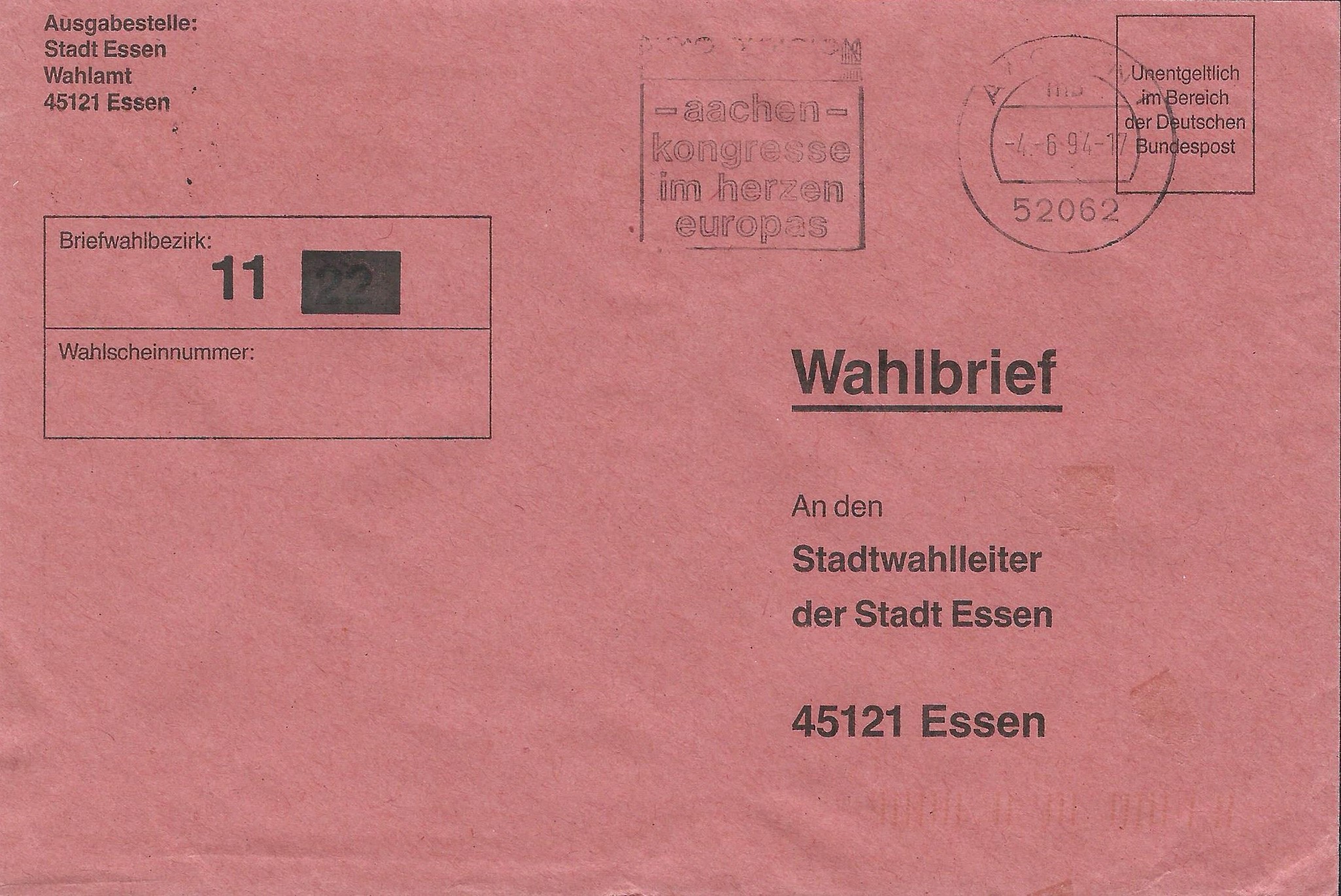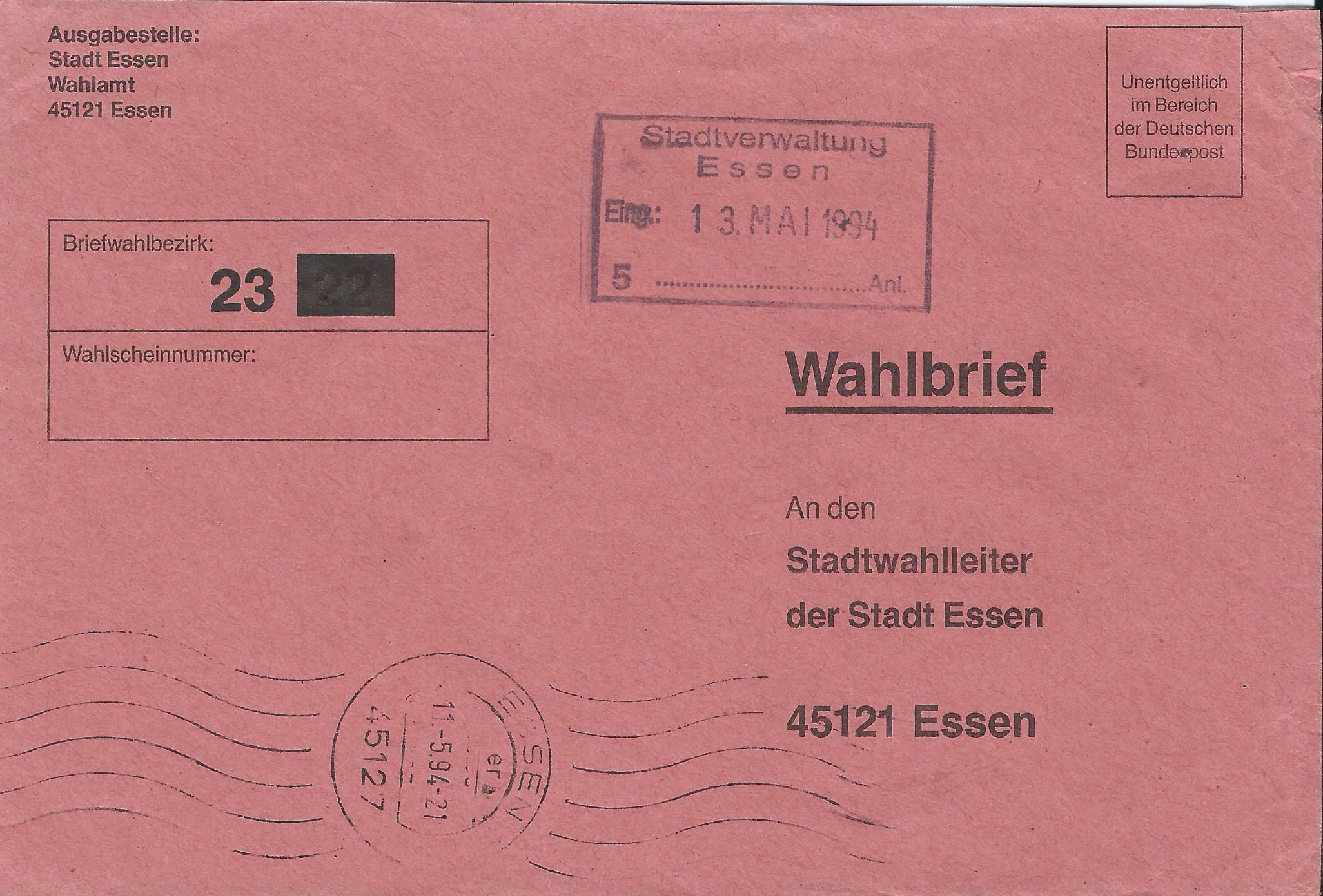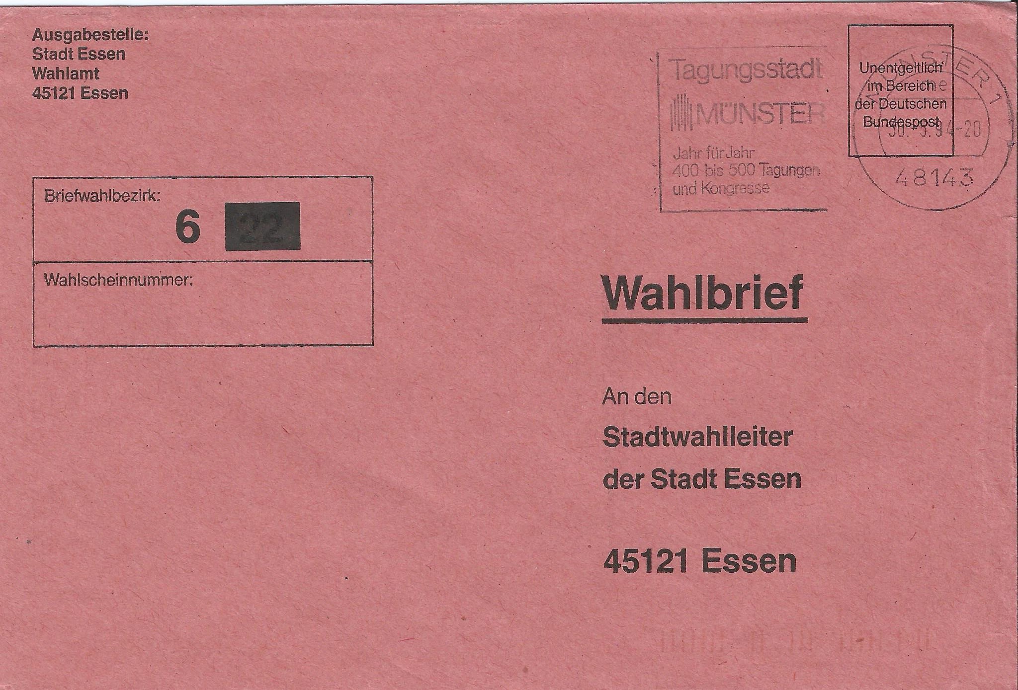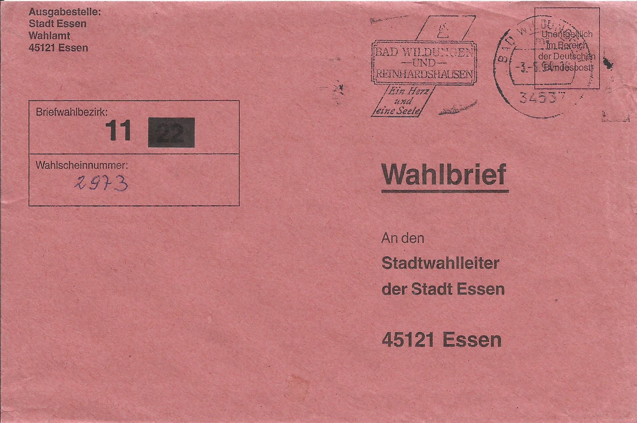 3 Belege habe ich aus der Zeit der 4-stelligen Postleitzahlen retten können, der Rest ist schon aus der Zeit der 5-stelligen Postleitzahlen. Die Briefe sind alle an den Wahlleiter der Stadt Essen geschickt worden. Links oben ist jeweils der Wahlbezirk angegeben, damit die Briefe auch intern zugeordnet werden konnten.