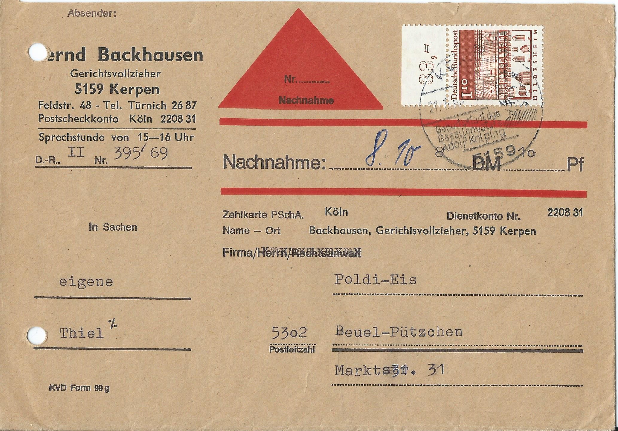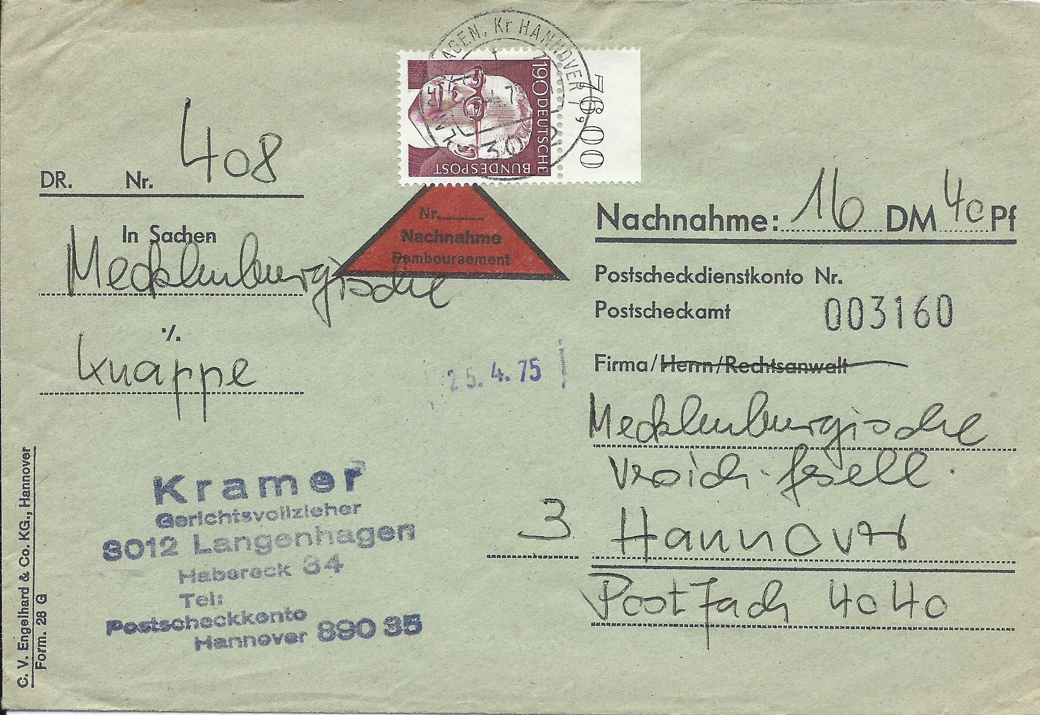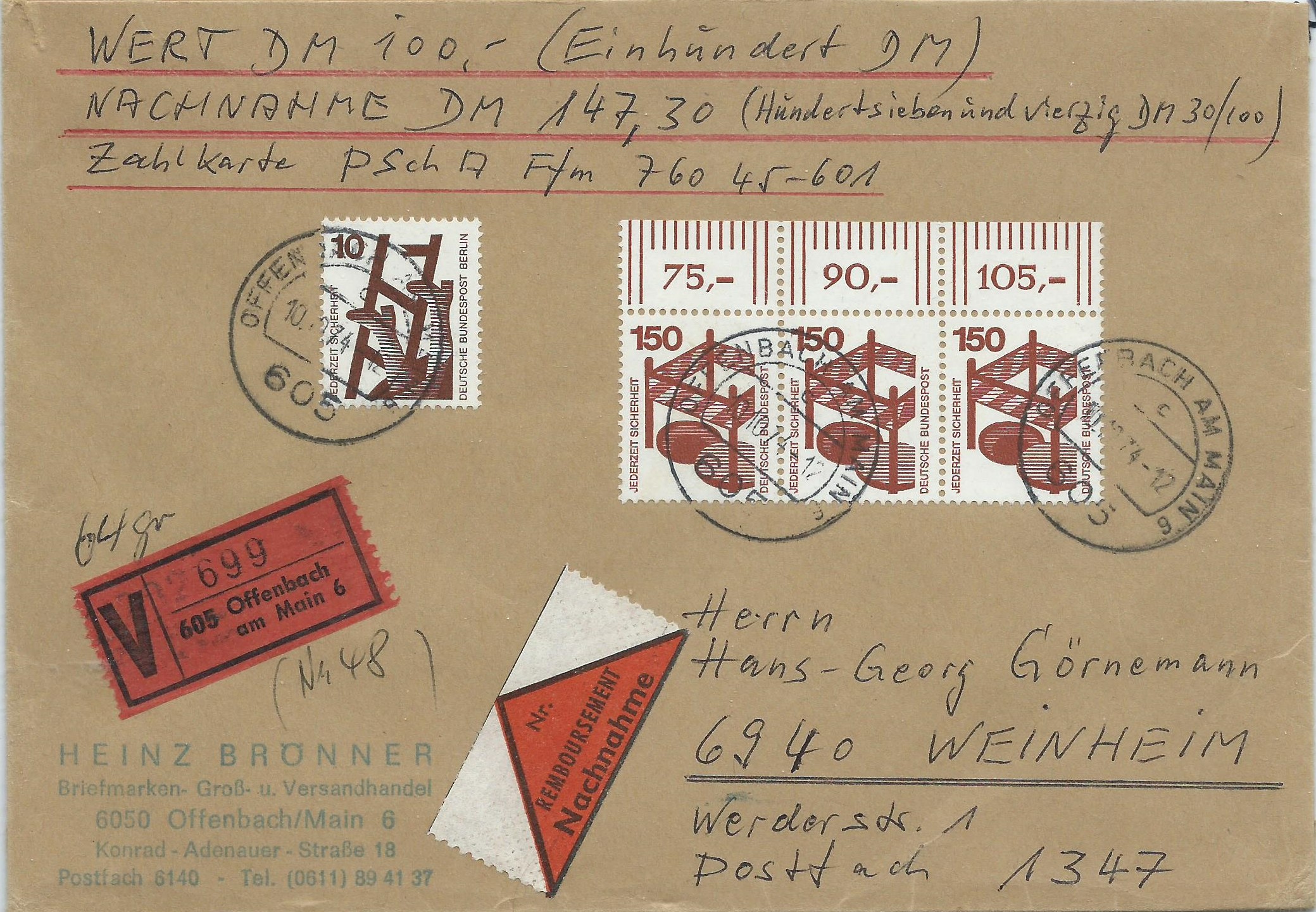 hier haben wir auf einem Nachnahmebrief einen 4-er-Block aus der rechten oberen Bogenecke der Wertstufe zu 300 Pf, der in Nettetal am 14.1.88 abgestempelt wurde. Dieser Brief hat noch weitere Zusatzleistungen neben der Nachnahme: Eilzustellung und Deklarierung als Wertbrief bis 500 DM. Dann steht noch handschriftlich der Vermerk „Eigenhändig“ oben links auf dem Umschlag.