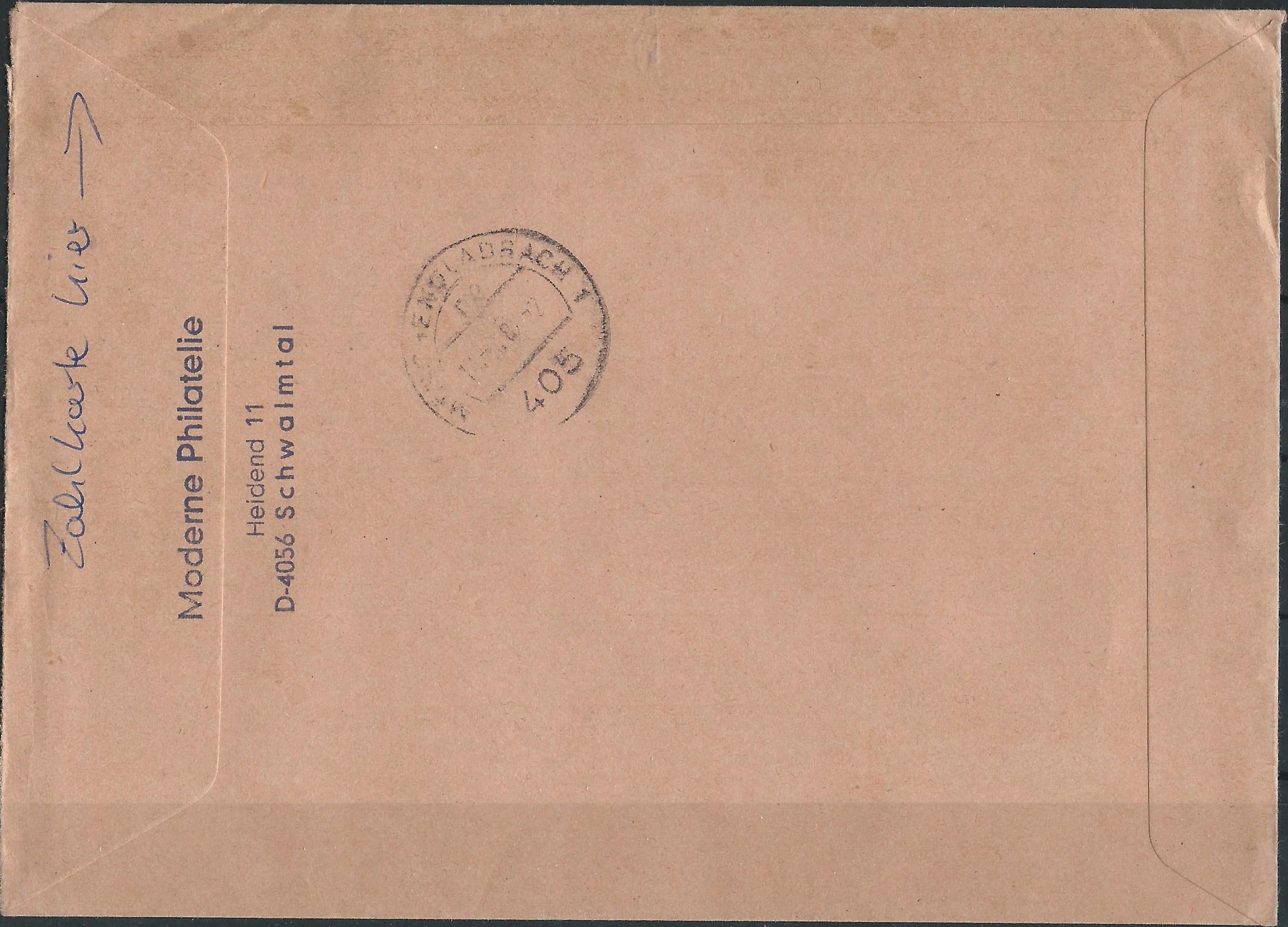 Der Beleg ist „echt gelaufen“, das erkennt man an dem rückseitigen Bearbeitungsstempel von Mönchengladbach. Auch wenn der Beleg doch etwas „philatelistisch beeinflusst“ ist, so ein Stück sieht man nicht alle Tage.