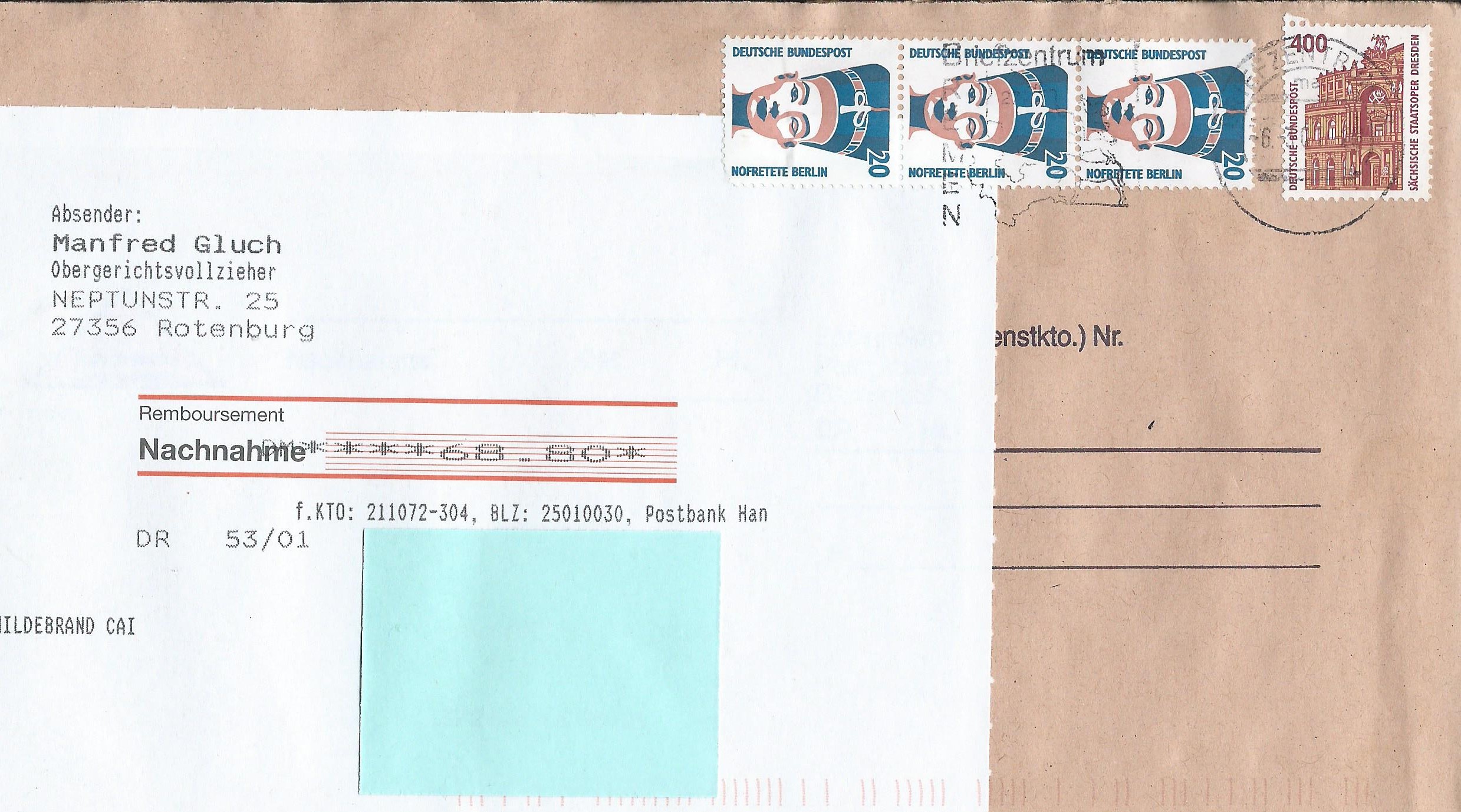 Das verklebte Porto von 23 Pf setzt sich zusammen aus 3 Pf für eine Drucksache plus 20 Pf als Vorzeigegebühr für die Nachnahme.
