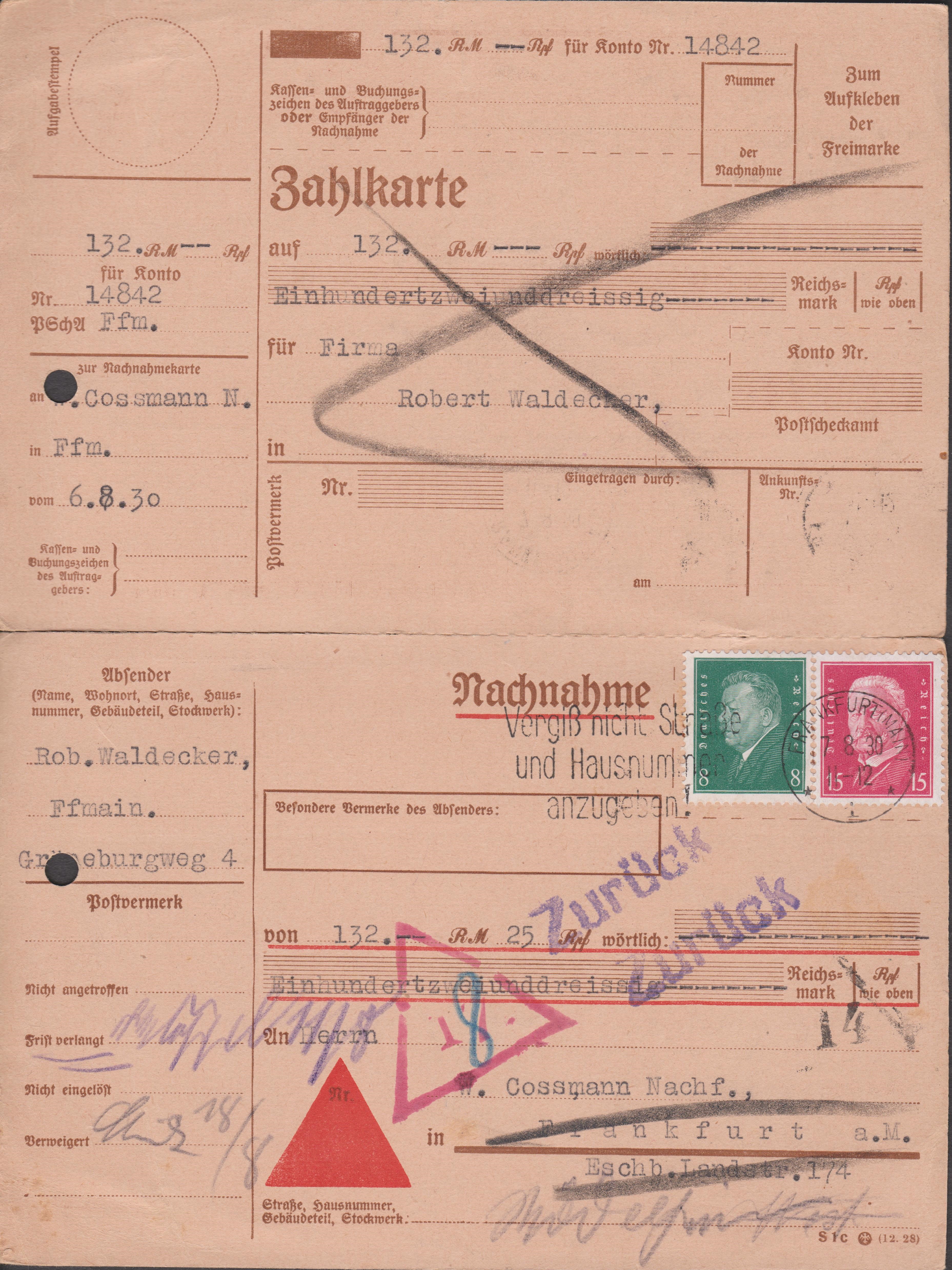 In diesem Fall zahlte der Adressat auch nicht, nachdem er eine "Frist verlangt" hatte und die Sendung ging am 18.08.1930 an den Absender "Zurück"!