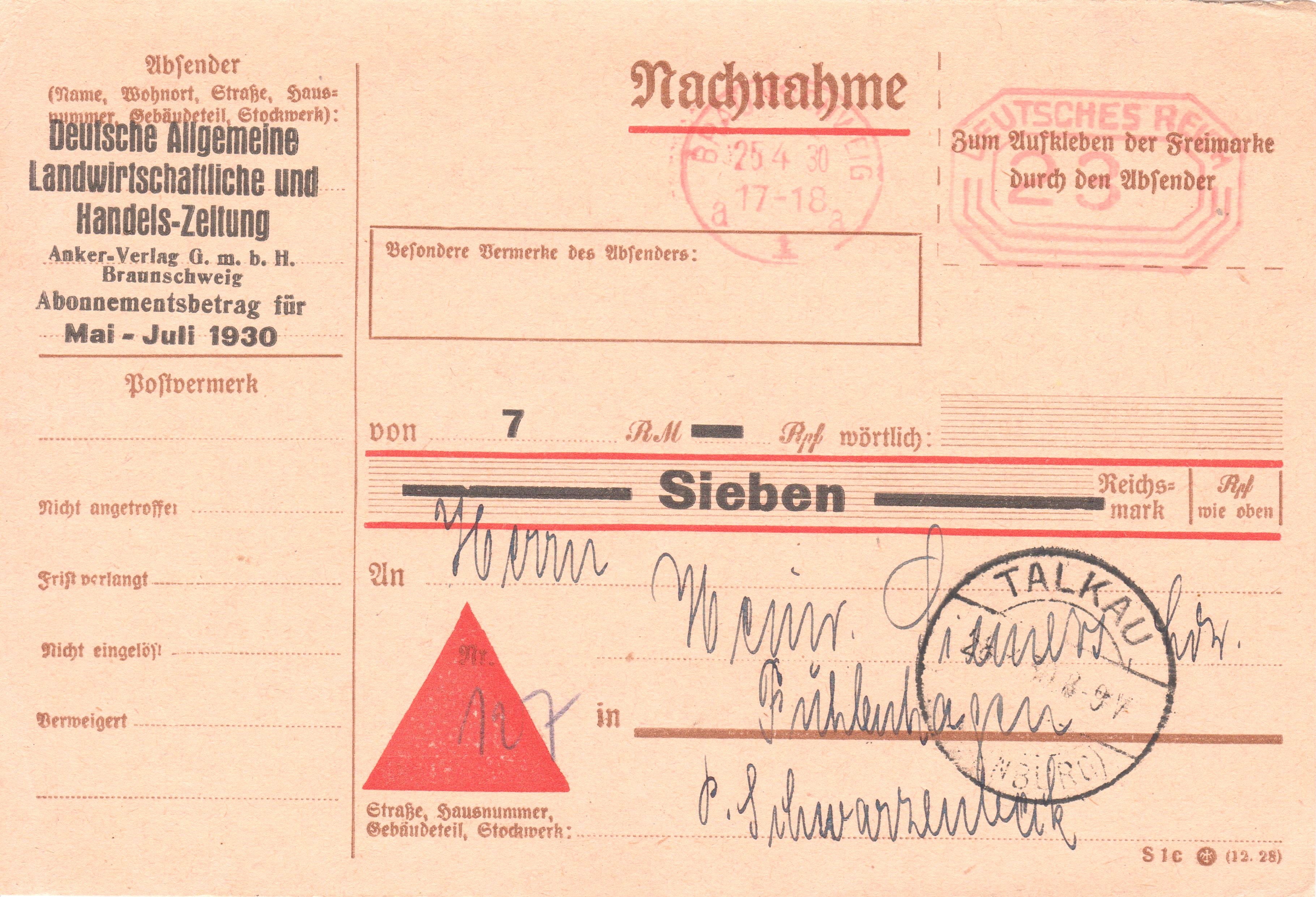 Drucksache, Portostufe 3 Pf, mit Nachnahme, Porto 20 Pf, am 25.04.1930 freigemacht per Postfreistempel BRAUNSCHWEIG 1: