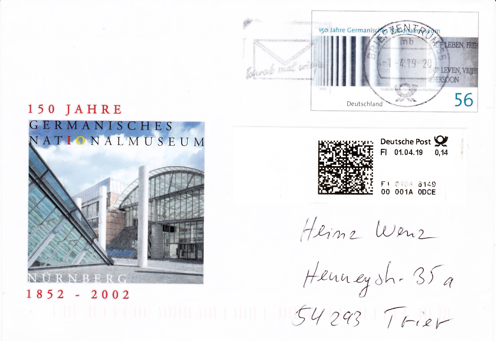 Dieser Ganzsachenumschlag wurde am 1.4.2019 verschickt. Der Wertstempel zu 56Cent wurde mit einem Schalterlabel vo 14Cent zu 70Cent ergänzt.